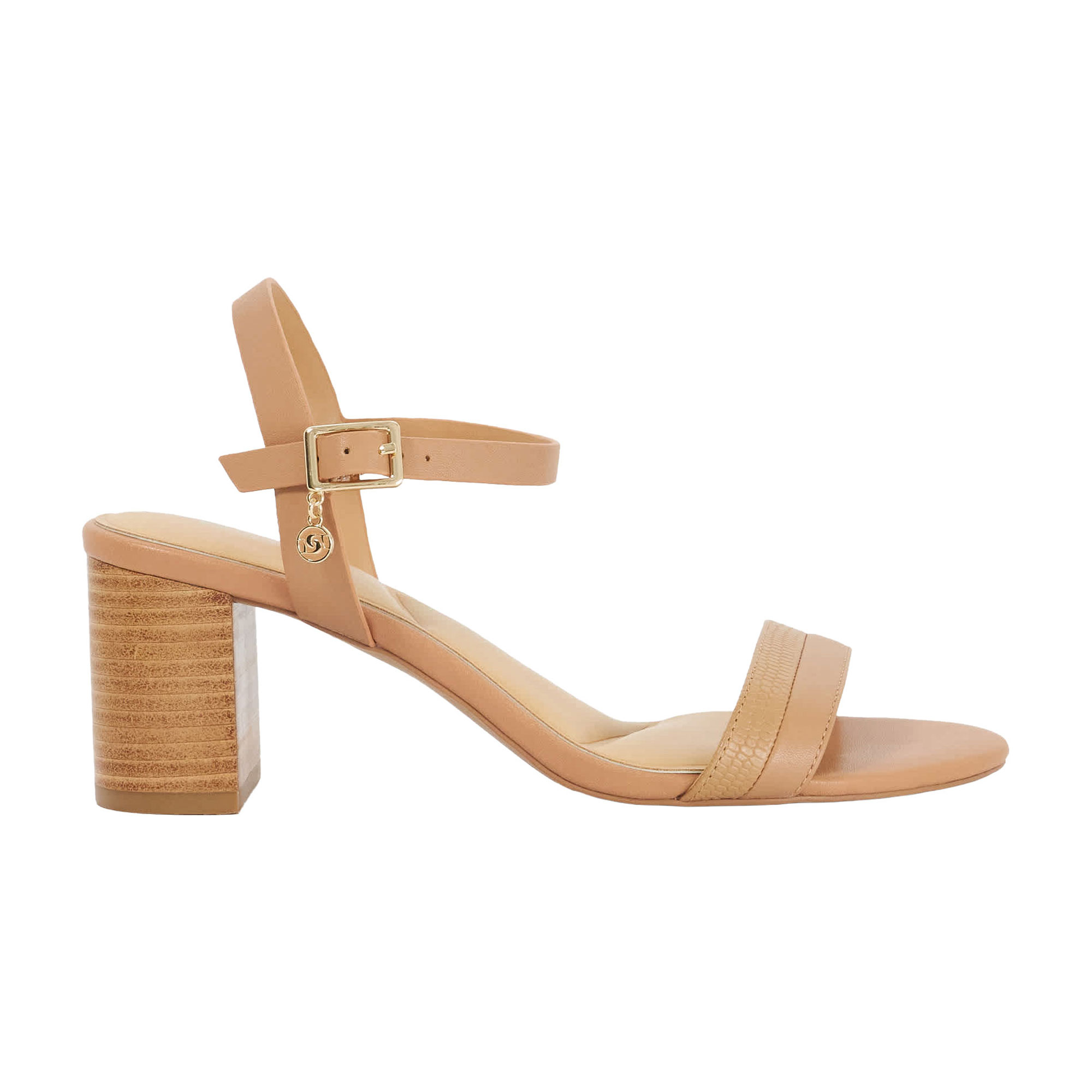- Leather, stacked block heel, adjustable ankle strap, sandal toe