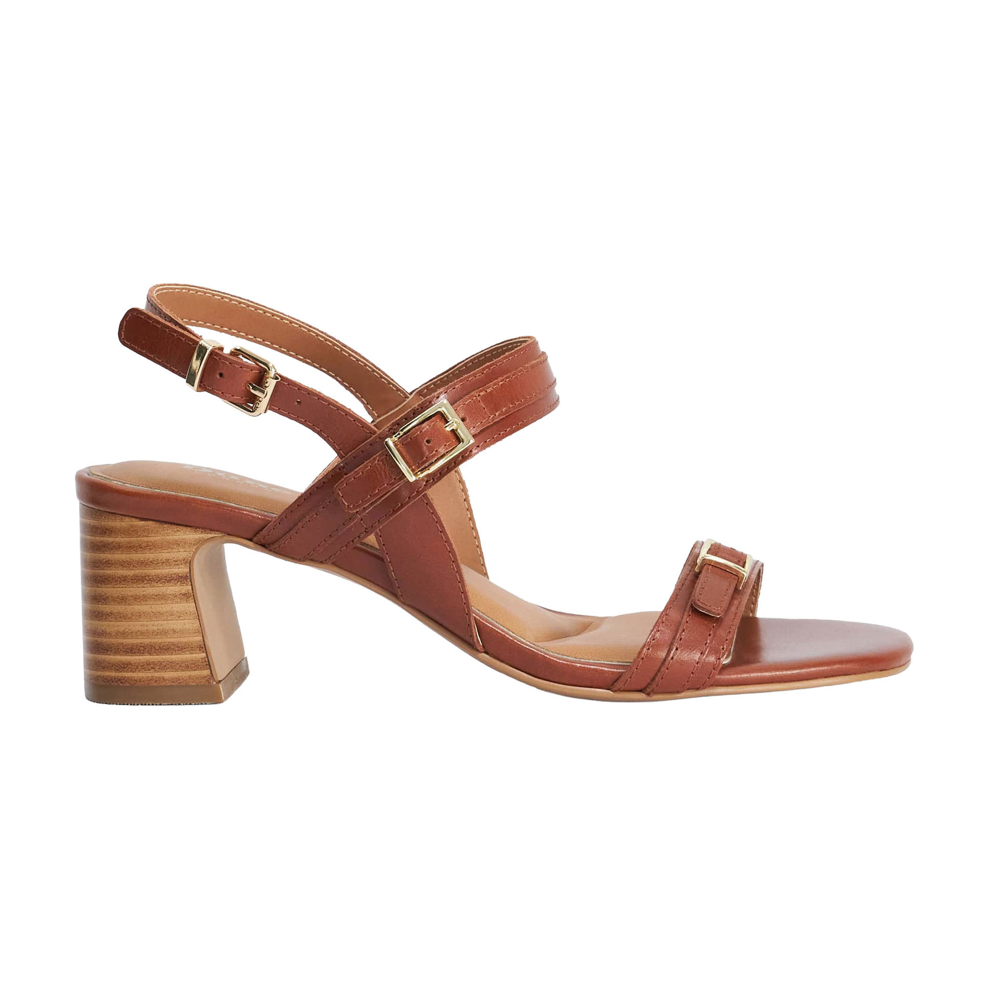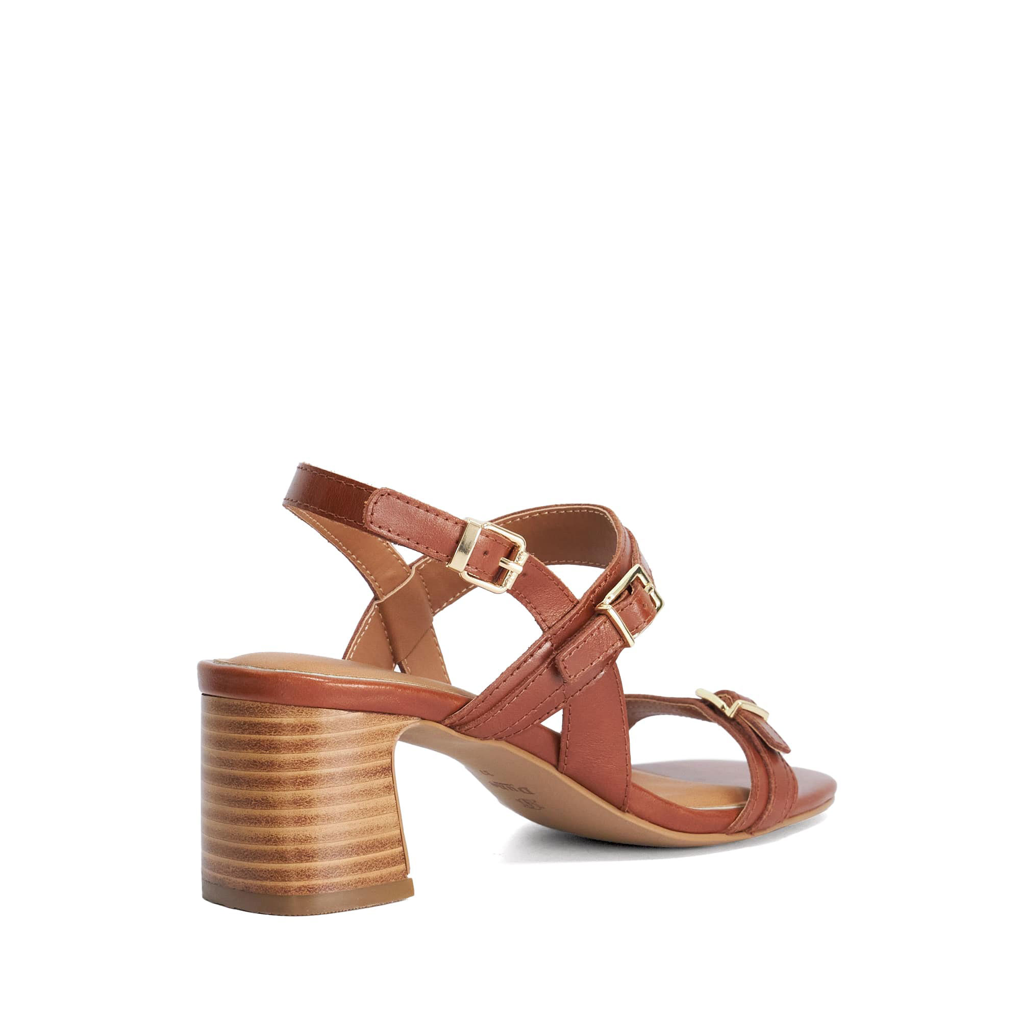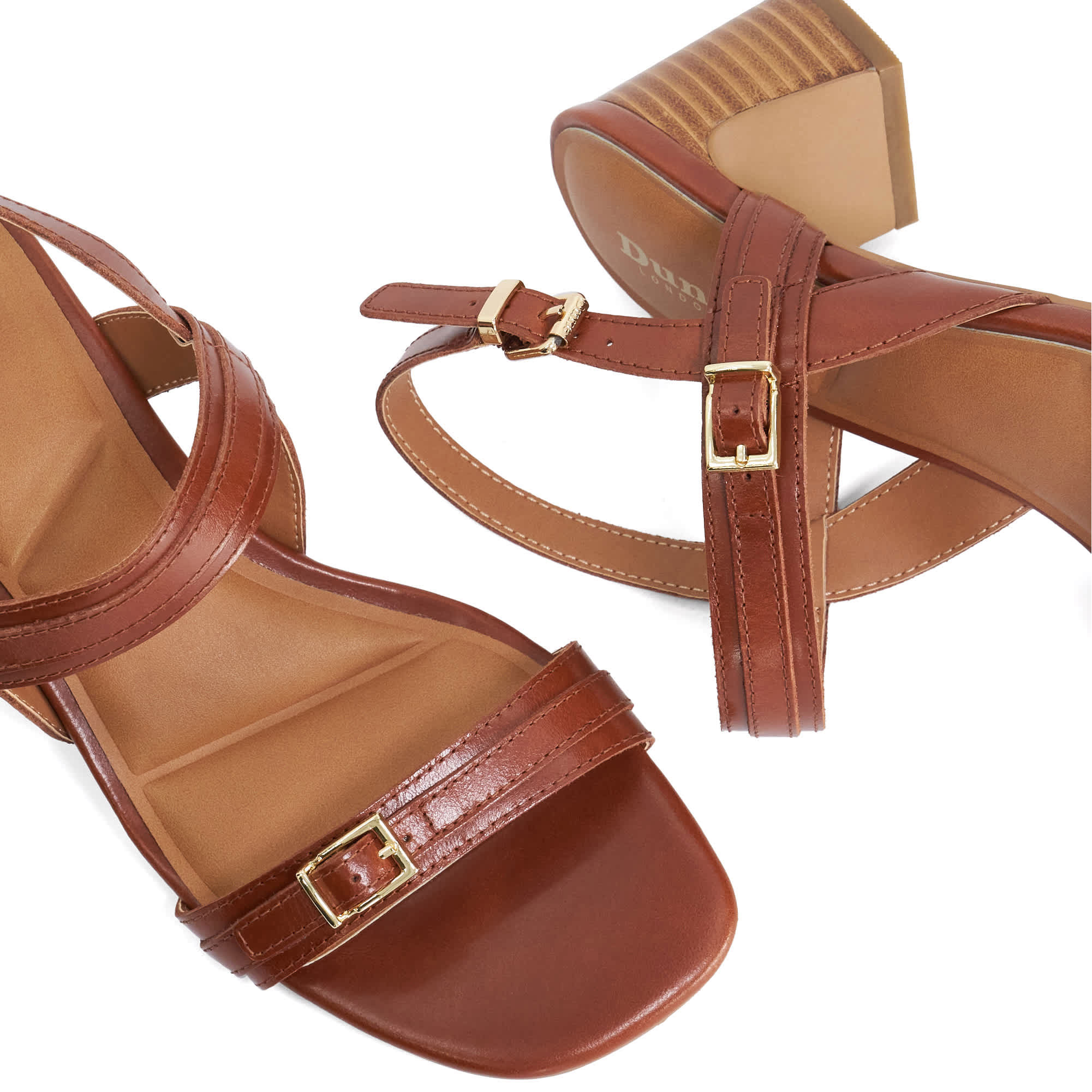 - Leather straps, double buckle detailing, stacked mid-height block heel