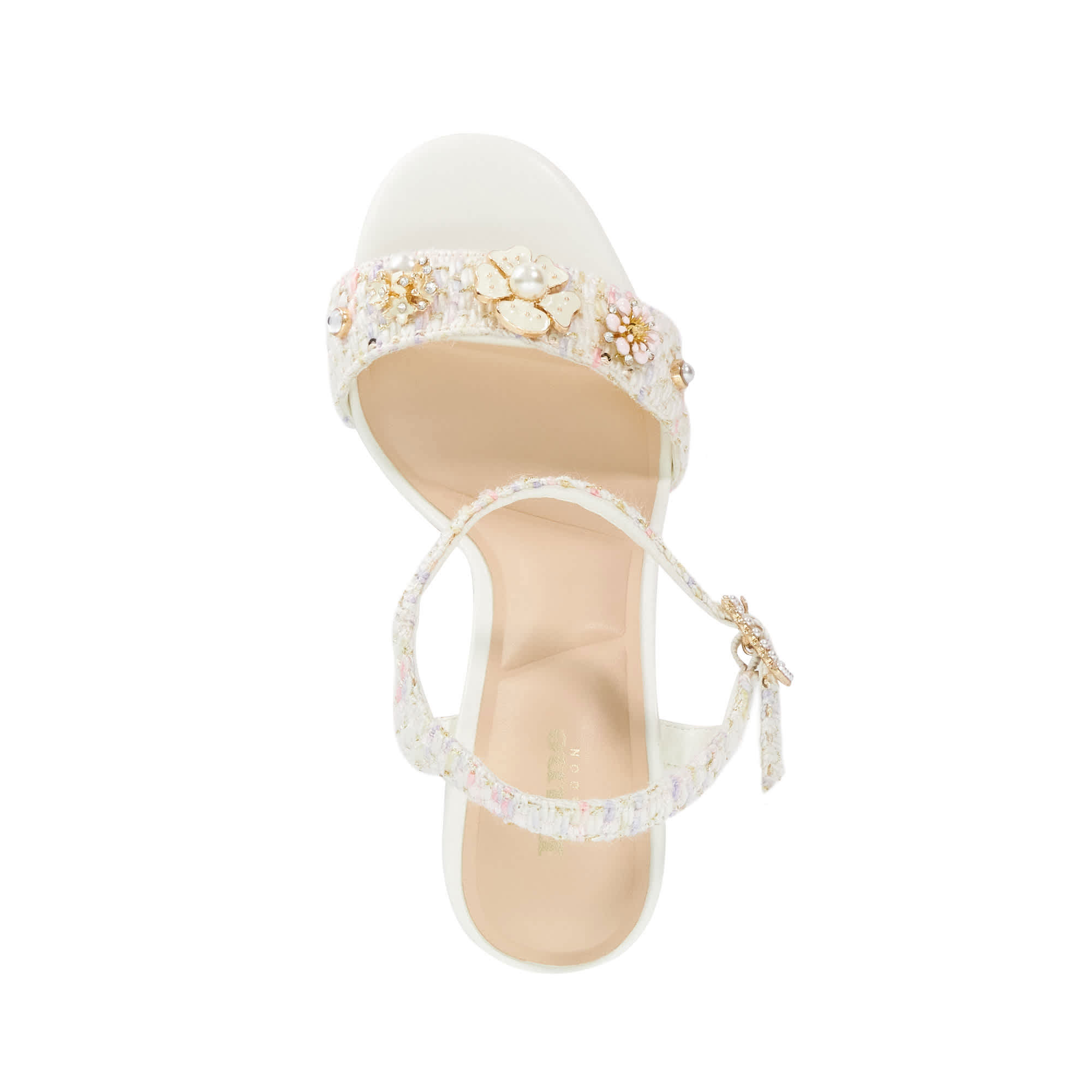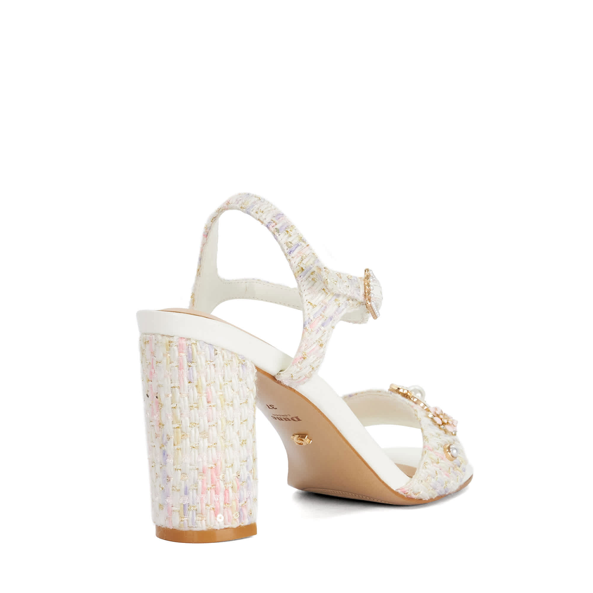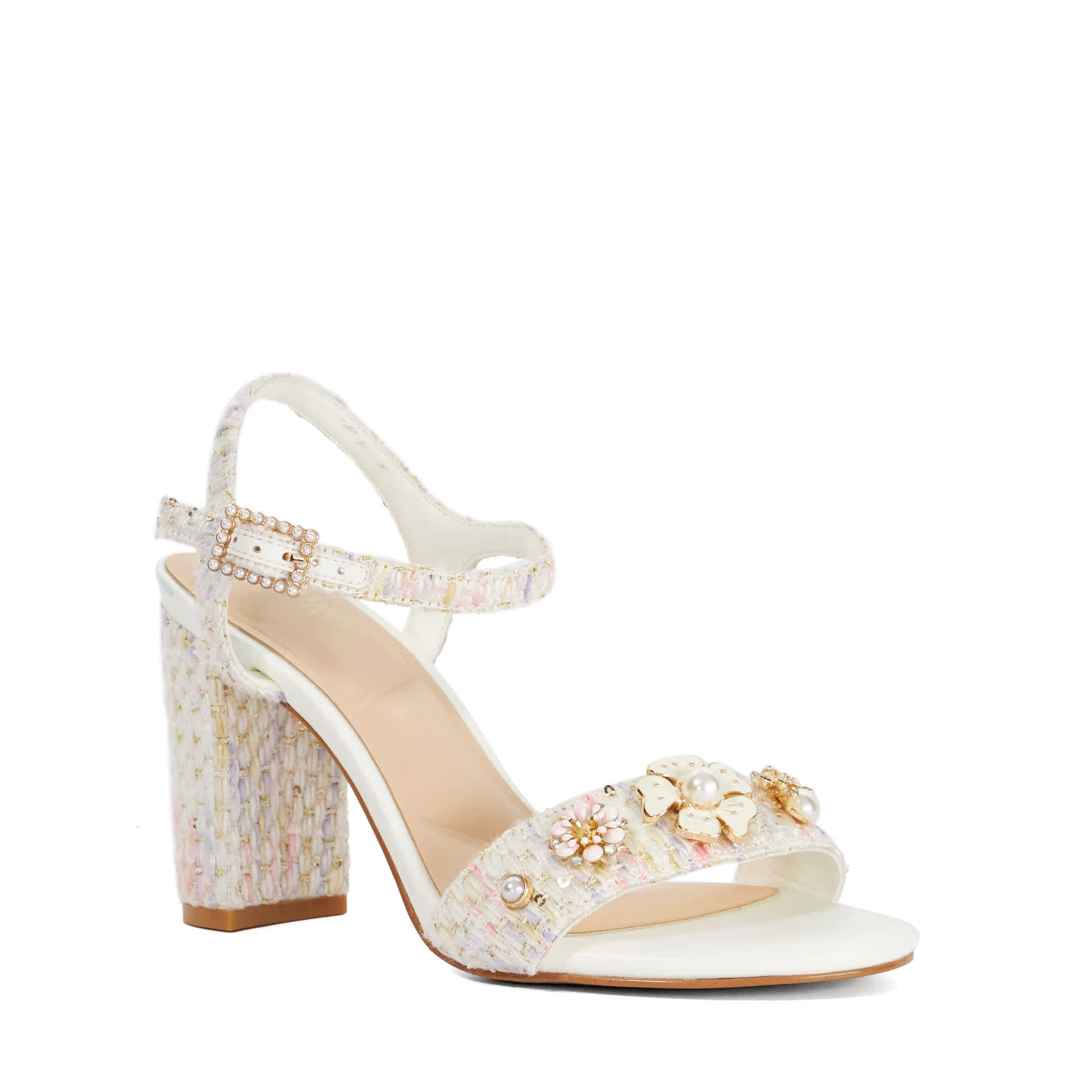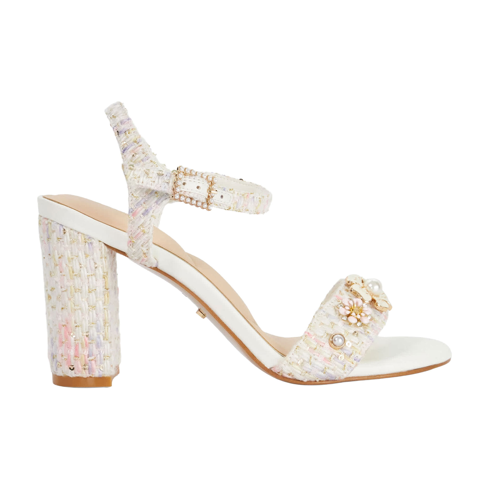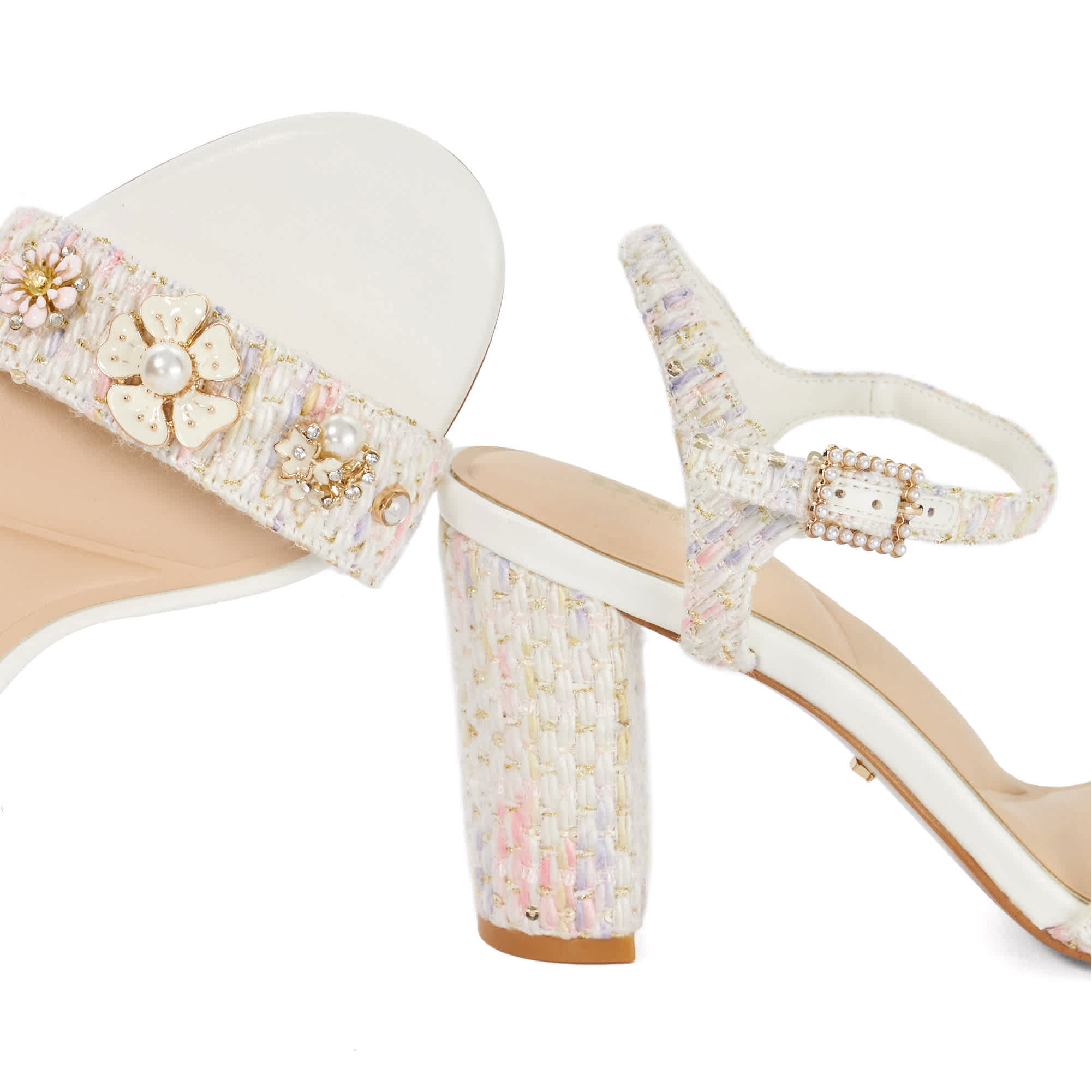 - Block heel, two-part silhouette, floral embellishment, adorned side buckle fastening, sandal toe, textured finish