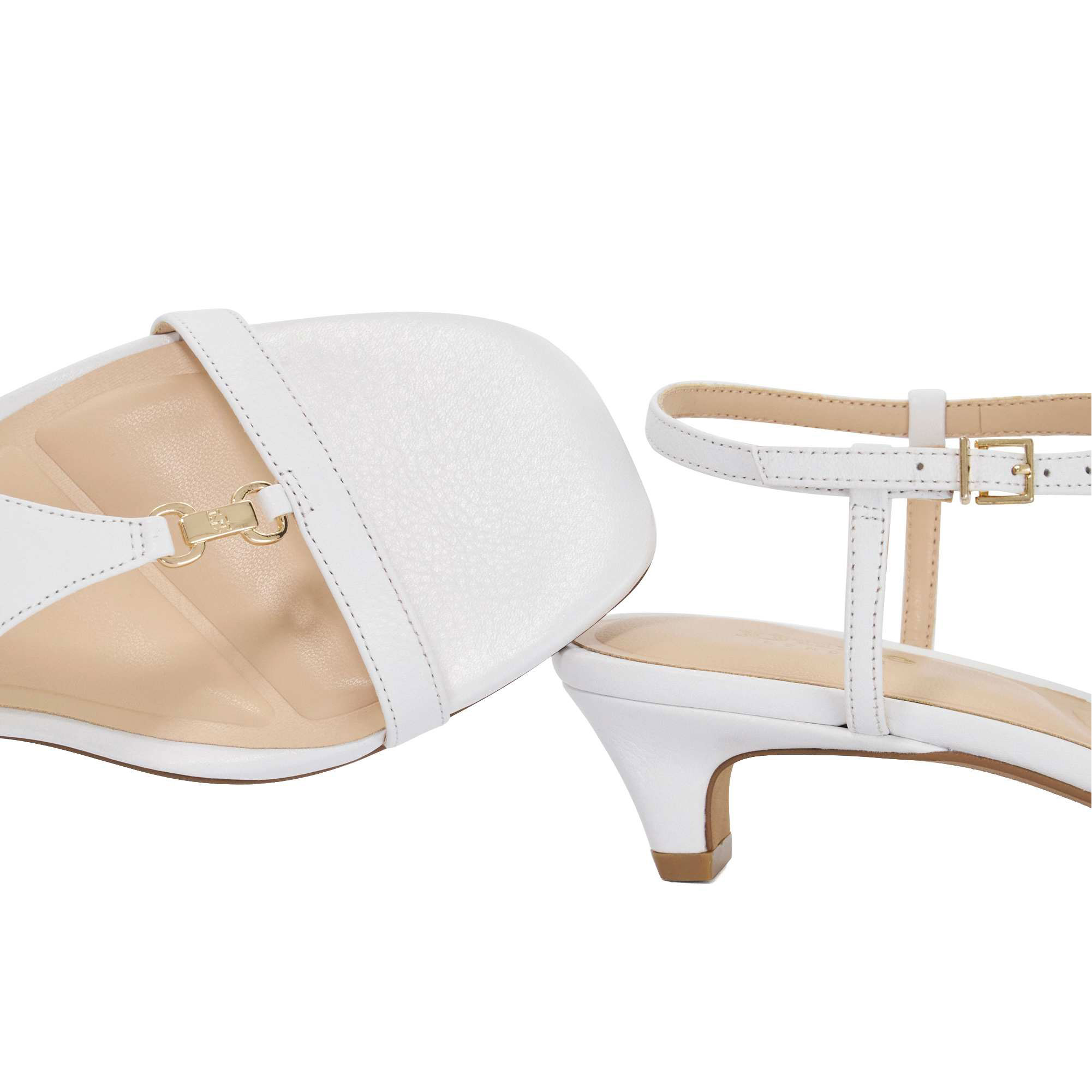 - T-bar fastening, leather, straps, gold-tone detailing, kitten heel, square toe, buckles, textured finish