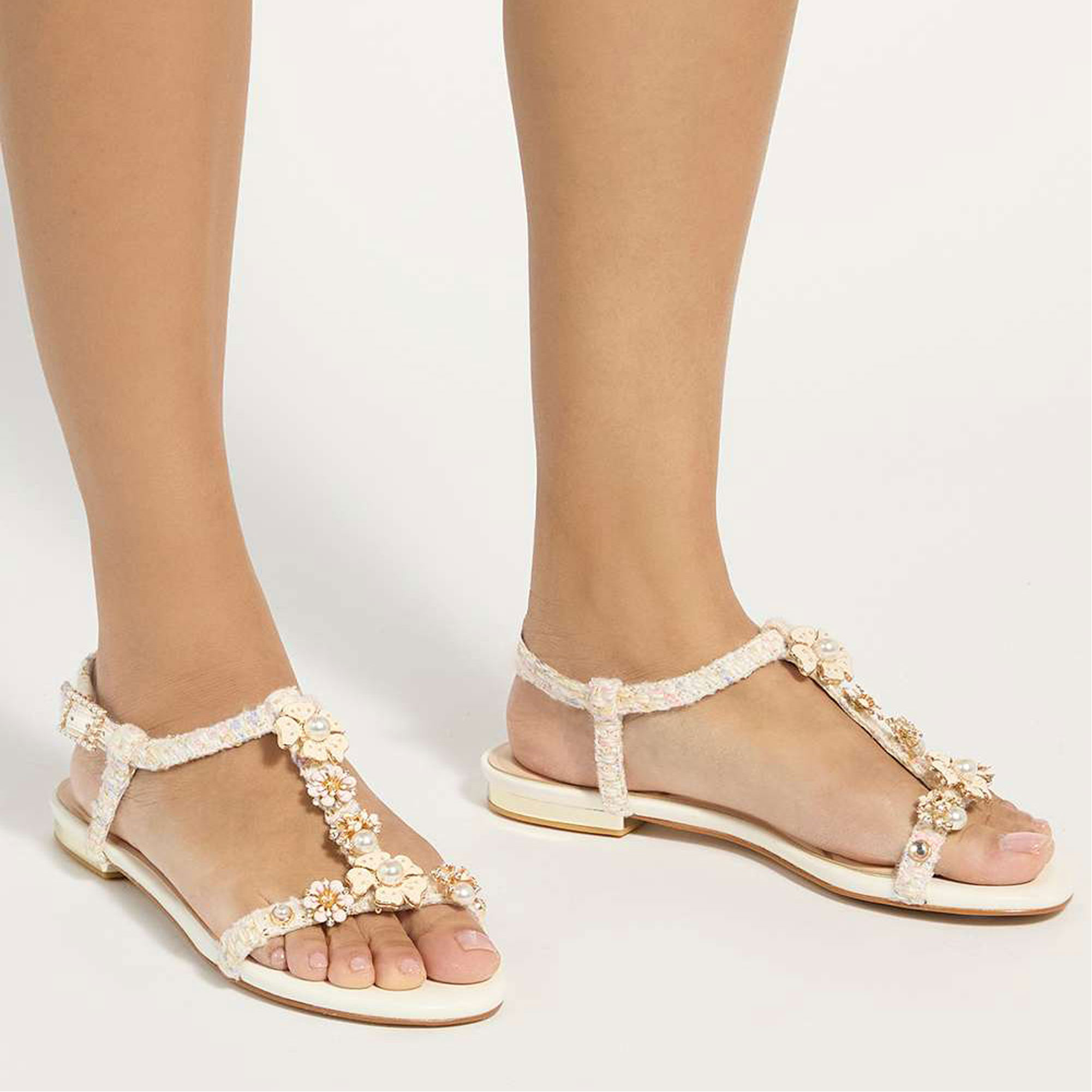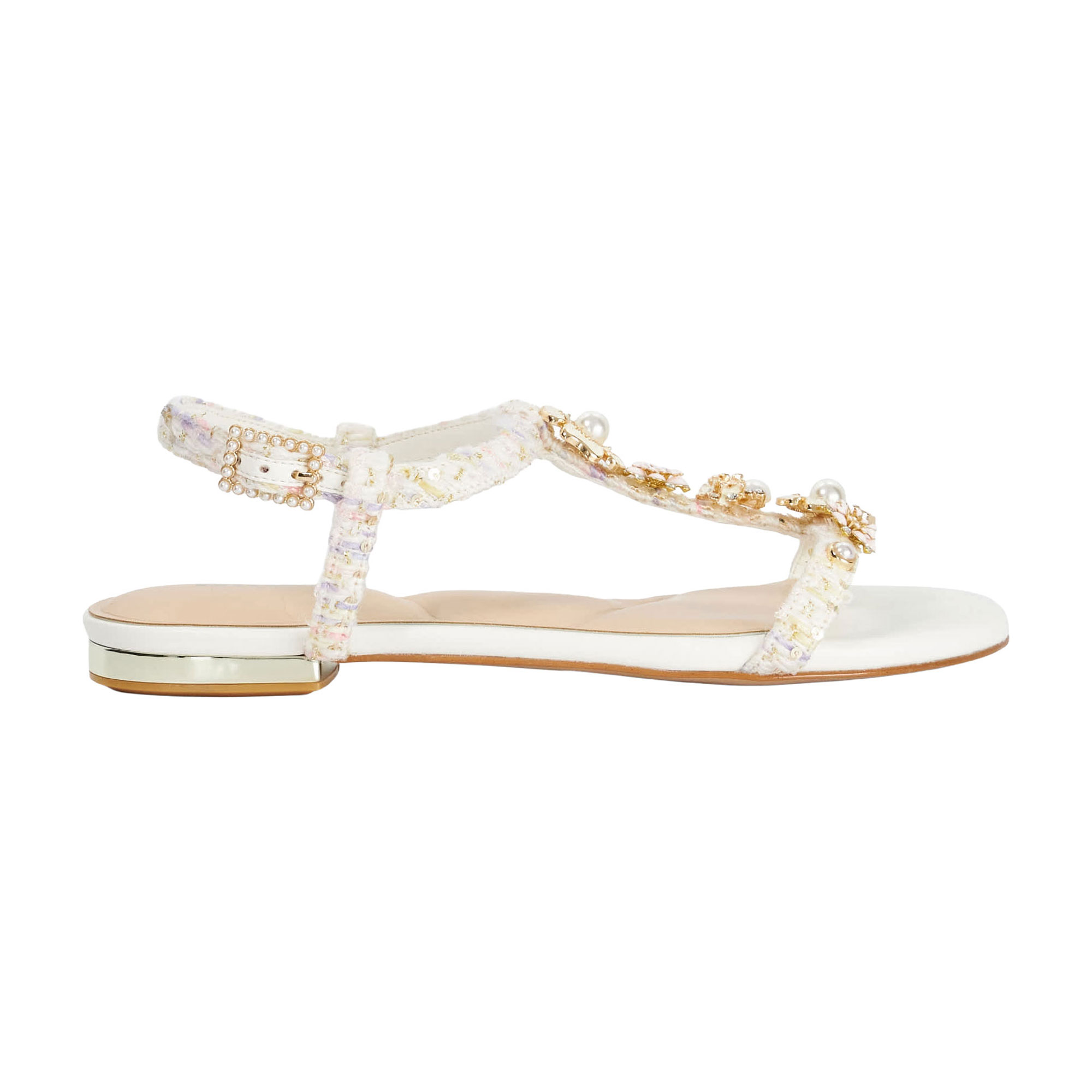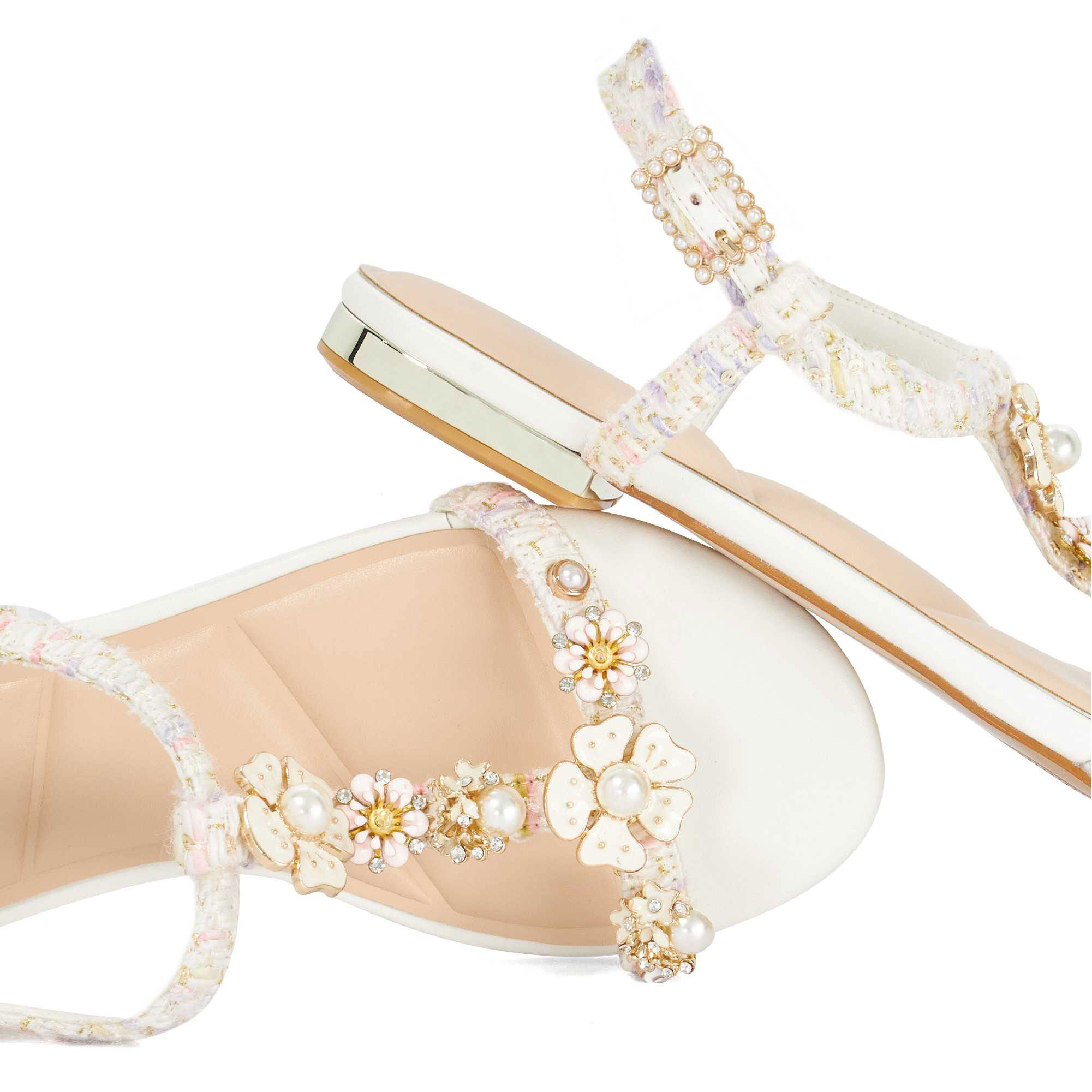 - T-bar detail, hand-placed flower embellishment, enamel and crystal beaded details, gold-tone hardware, sandal toe, textured finish
