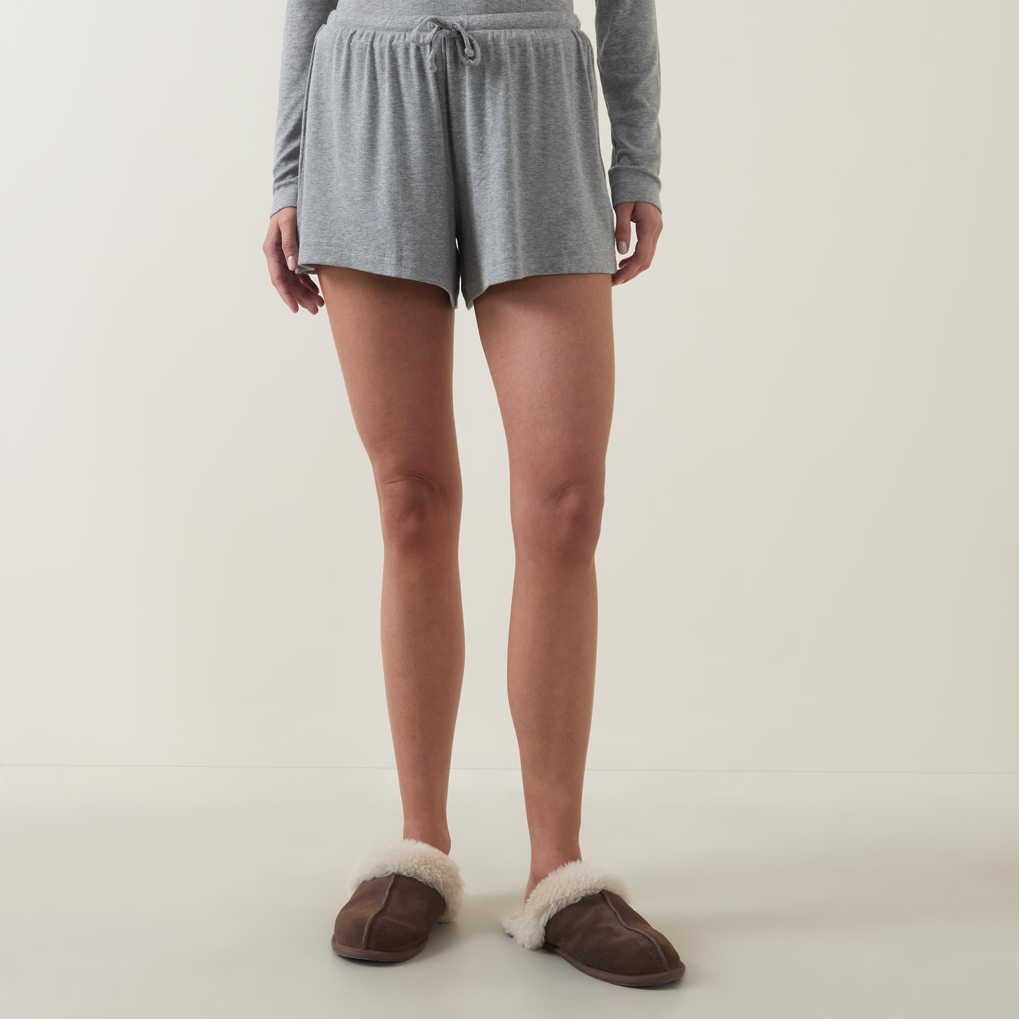 • Mid-rise, straight-leg, above-the-knee length, delicate flat waistband, flat drawstring fastening, clean hems, buttery soft rib-knit finish