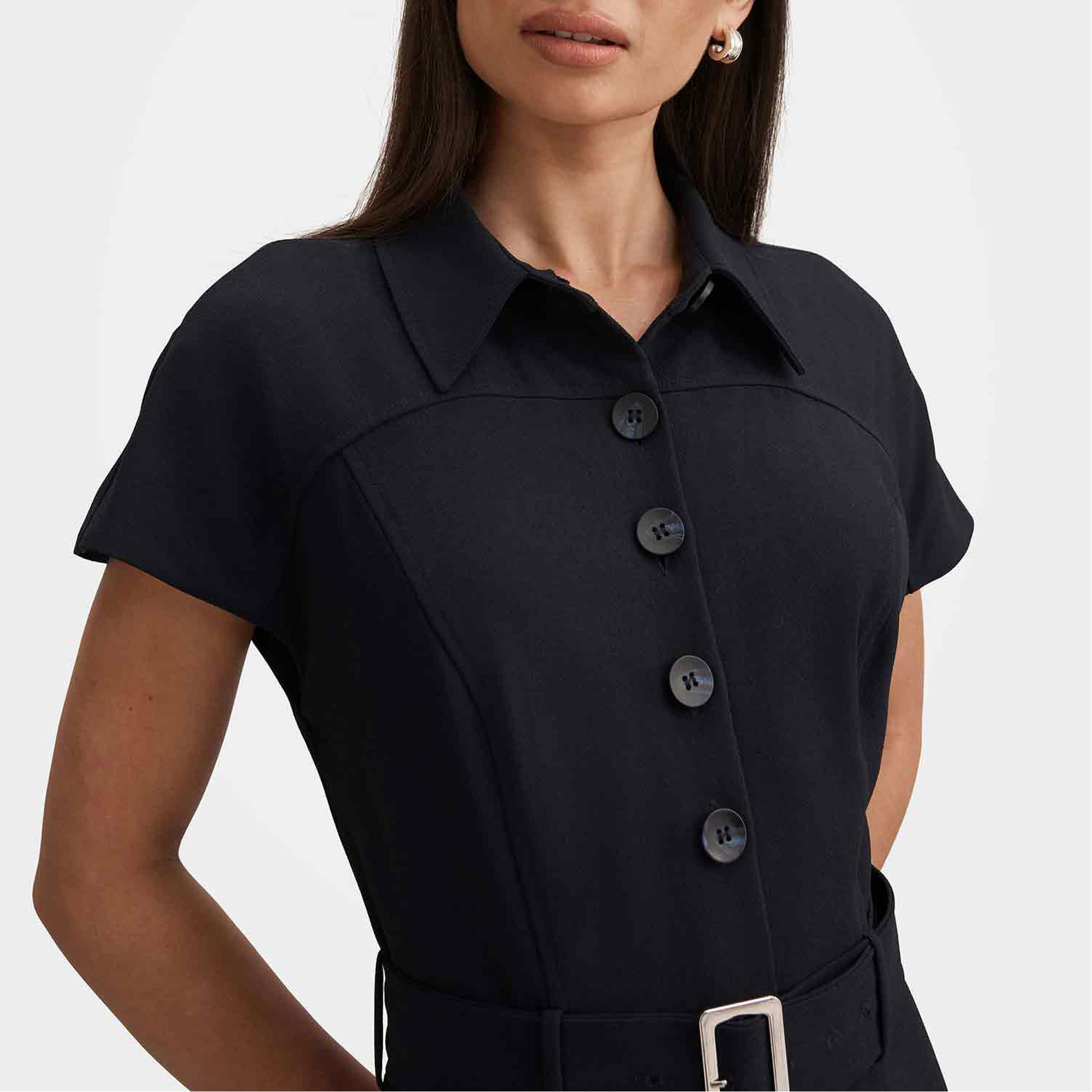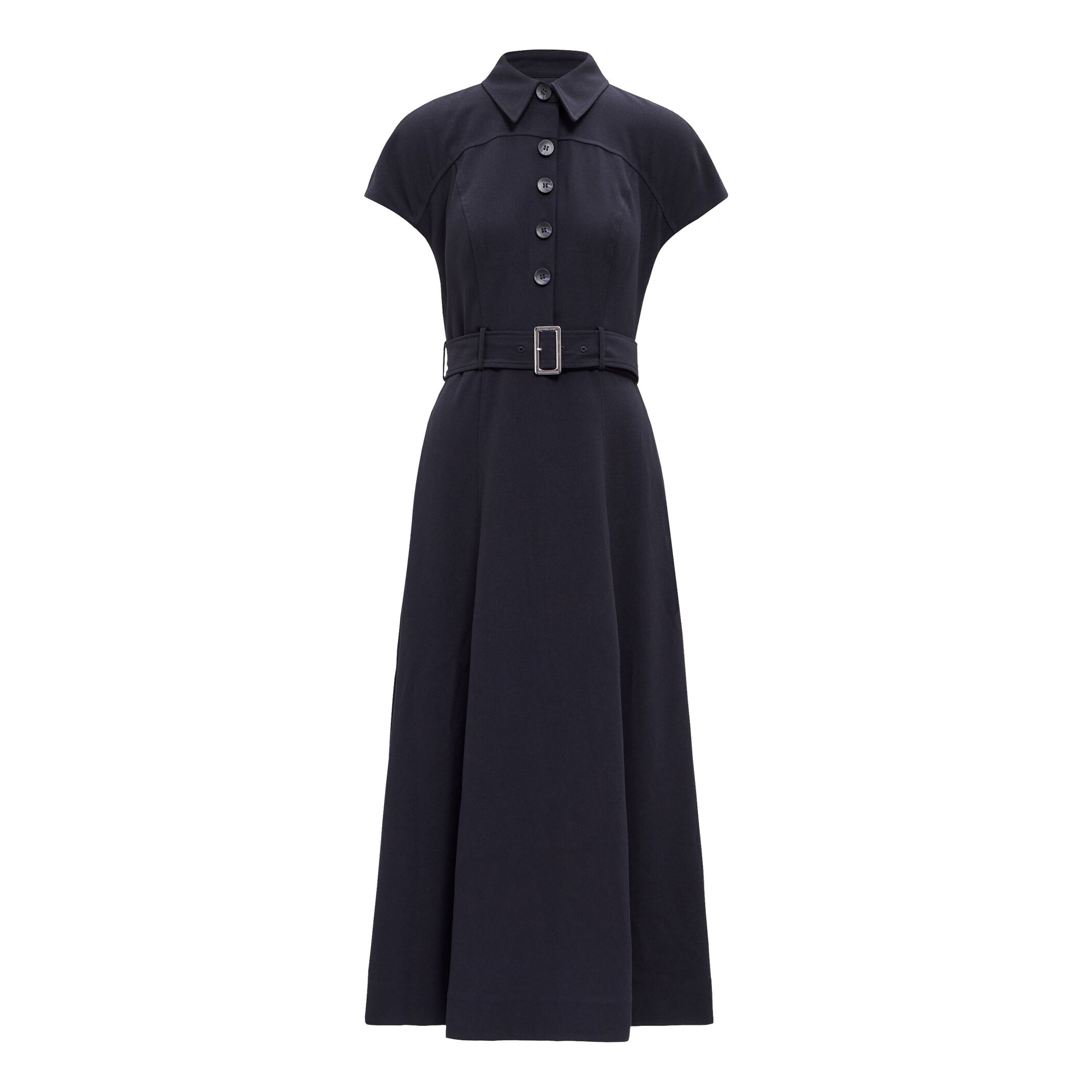 - Regular fit, classic fold-down collar, short sleeves, adjustable belted waist, A-line skirt, button front placket, lined