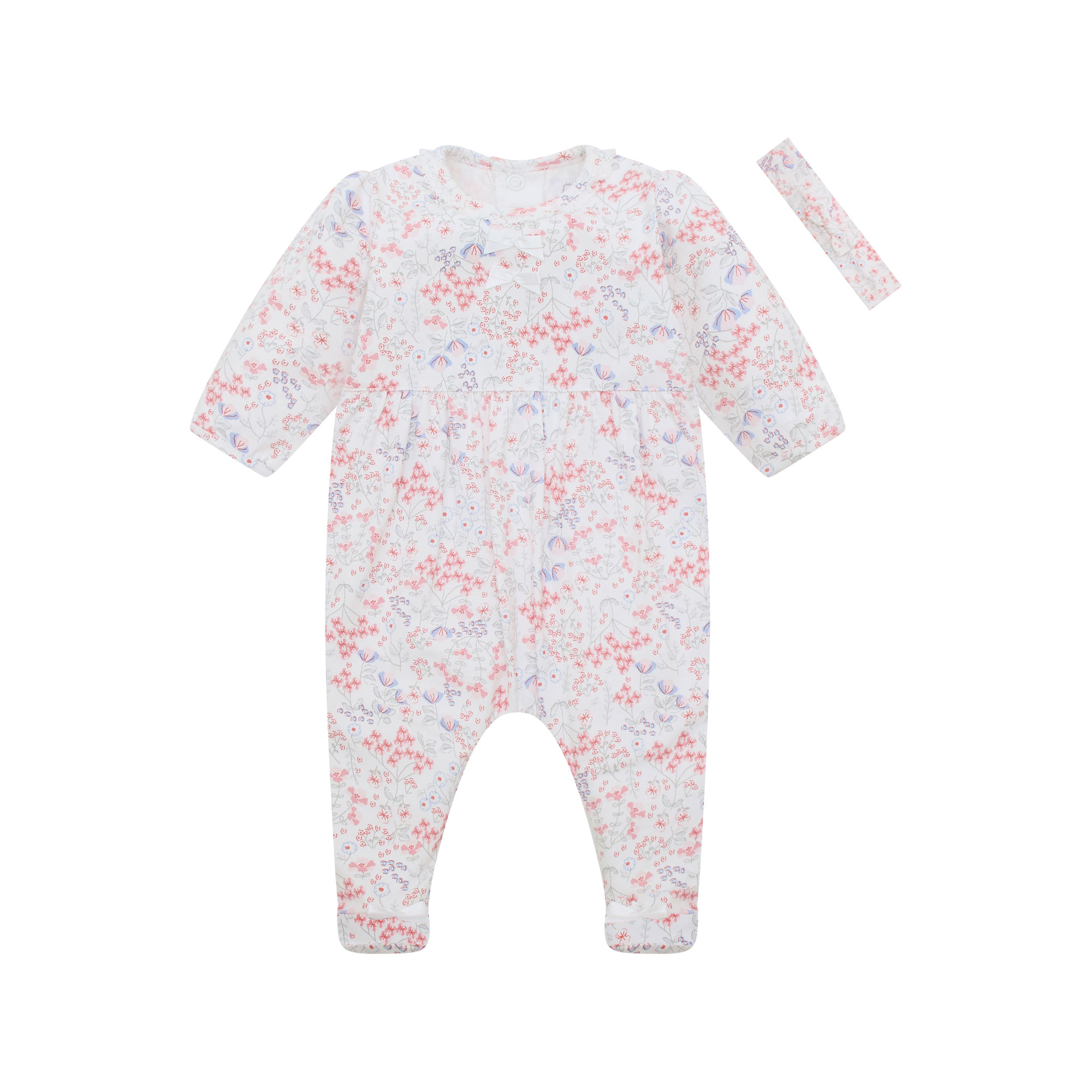 • Babygrow: All-over floral, lace trim, round neckline, long sleeves, round neckline, snap button fastenings, satin bow details. Hairband: Floral print, bow