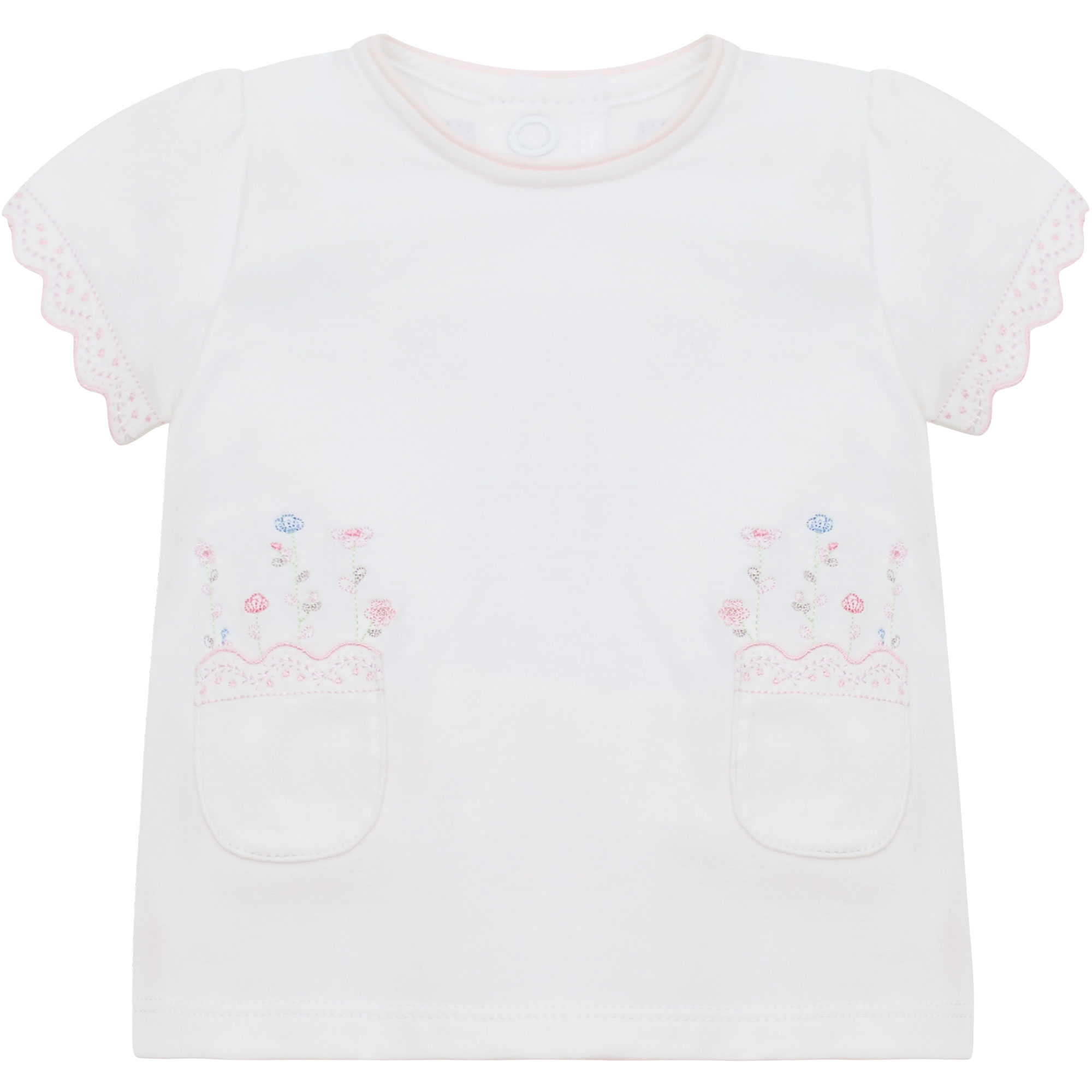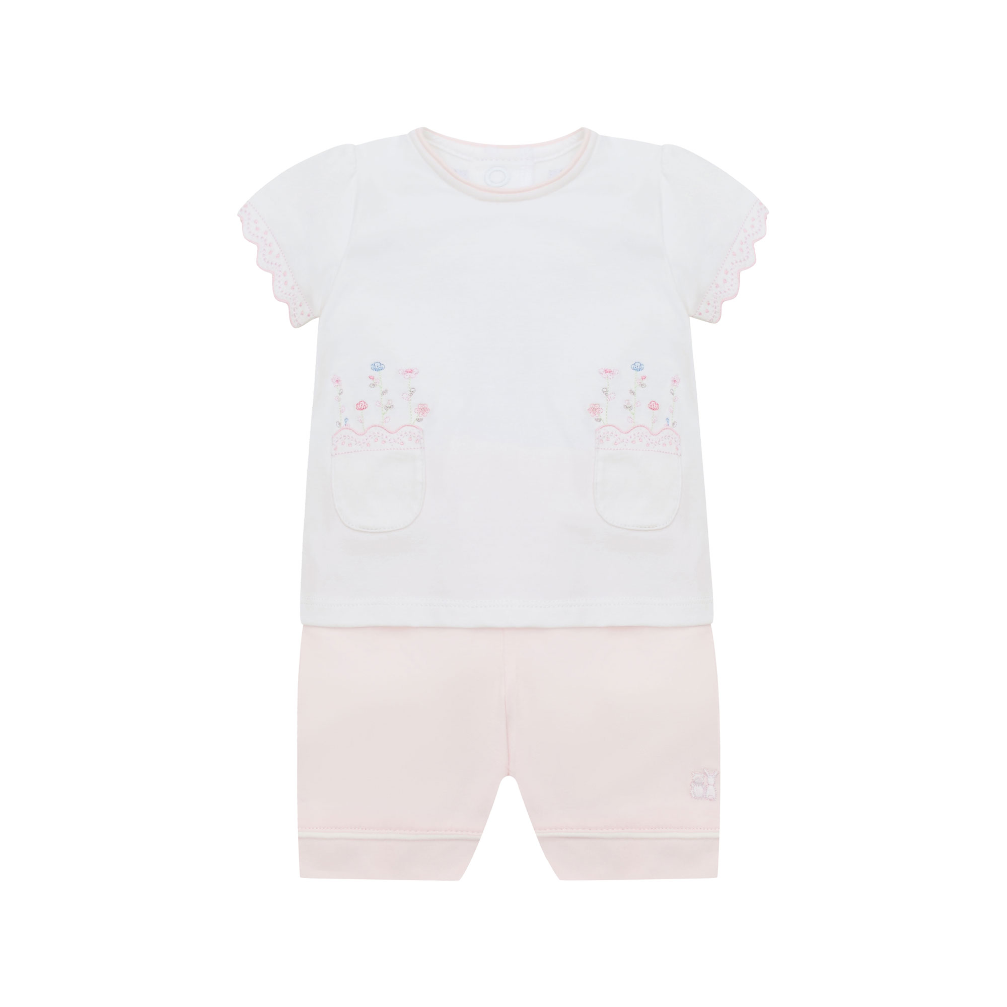 - Top: Curved pockets, scalloped lace-effect edges, short sleeves, embroidered floral stems, snap button fastenings. Shorts: Logo detail, elasticated waistband
