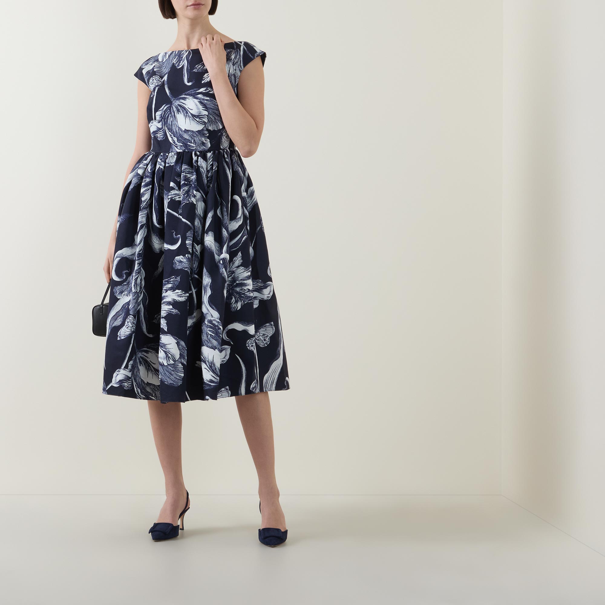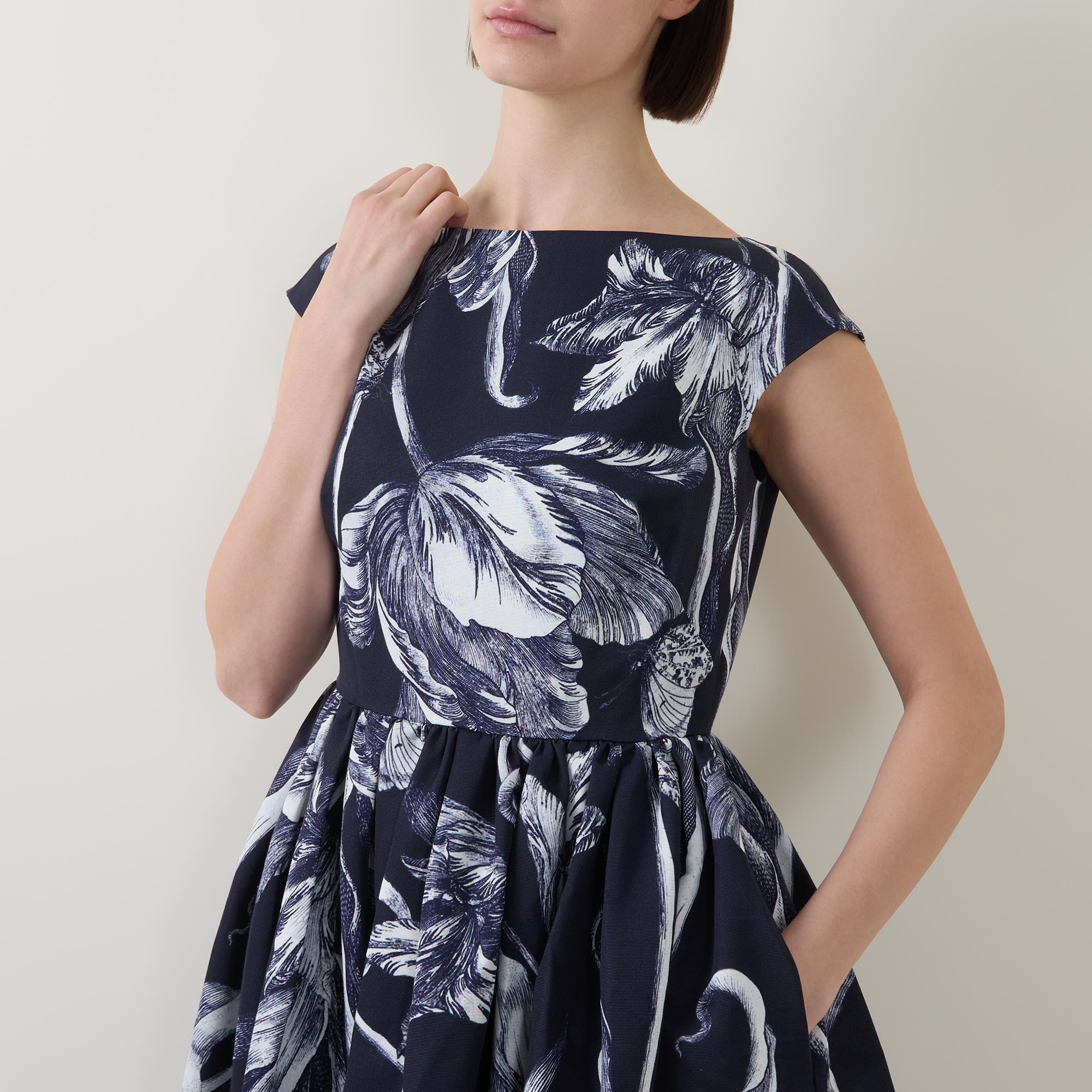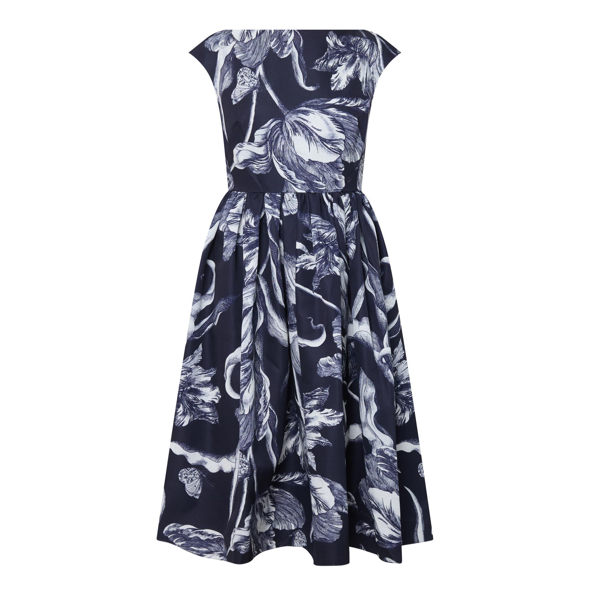 • Boat neckline, short cap sleeves, V-shape back, back zip-fastening closure, floral design, two side in-seam pockets, pleated flared silhouette, midi length