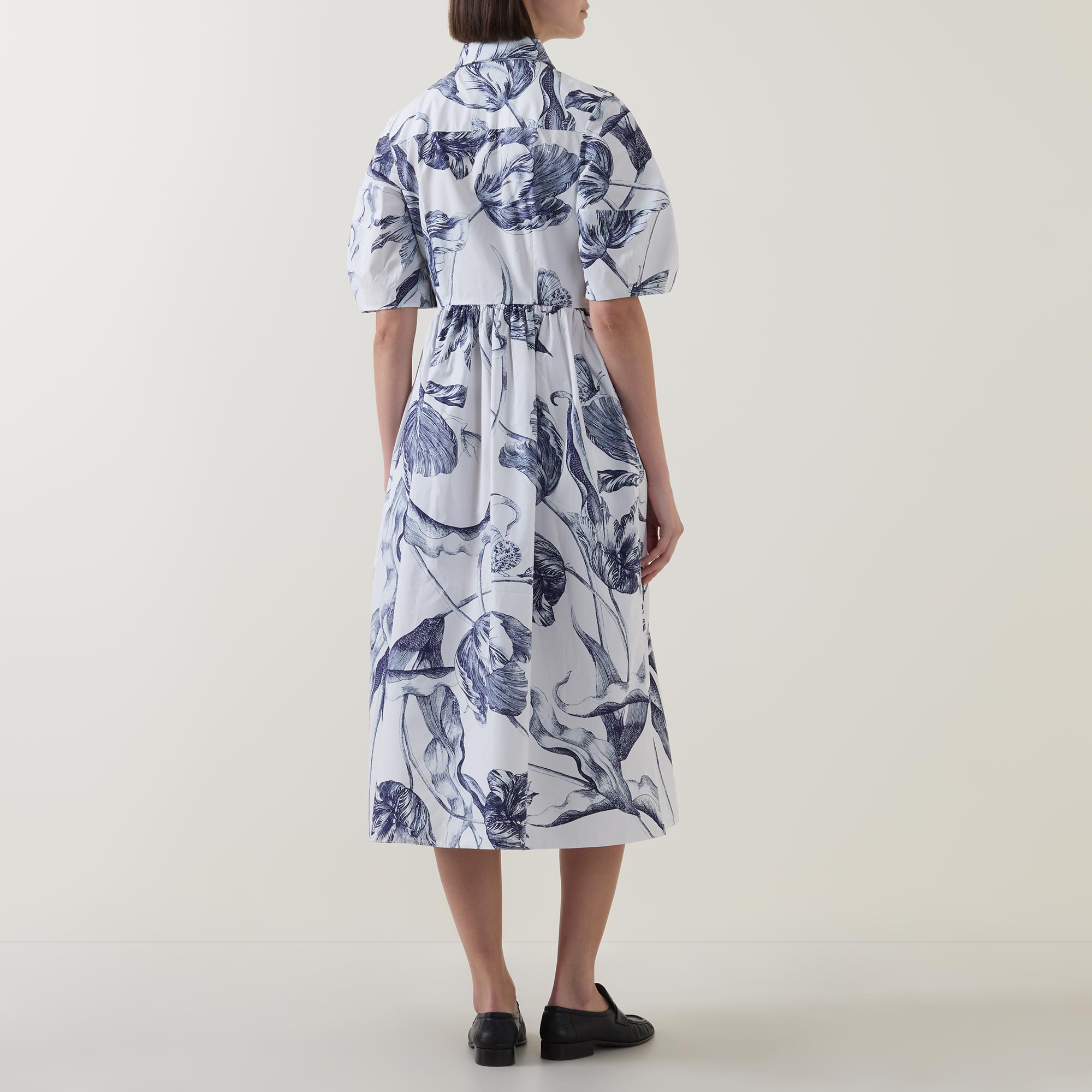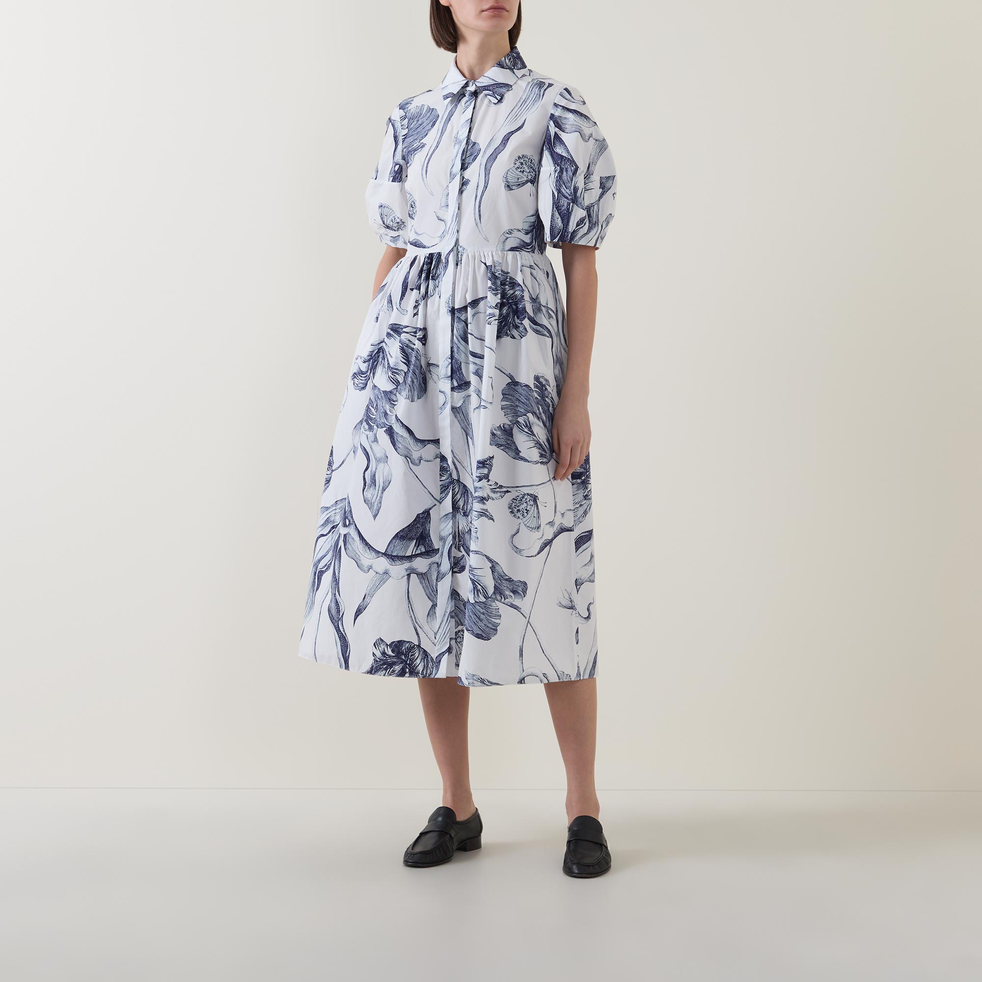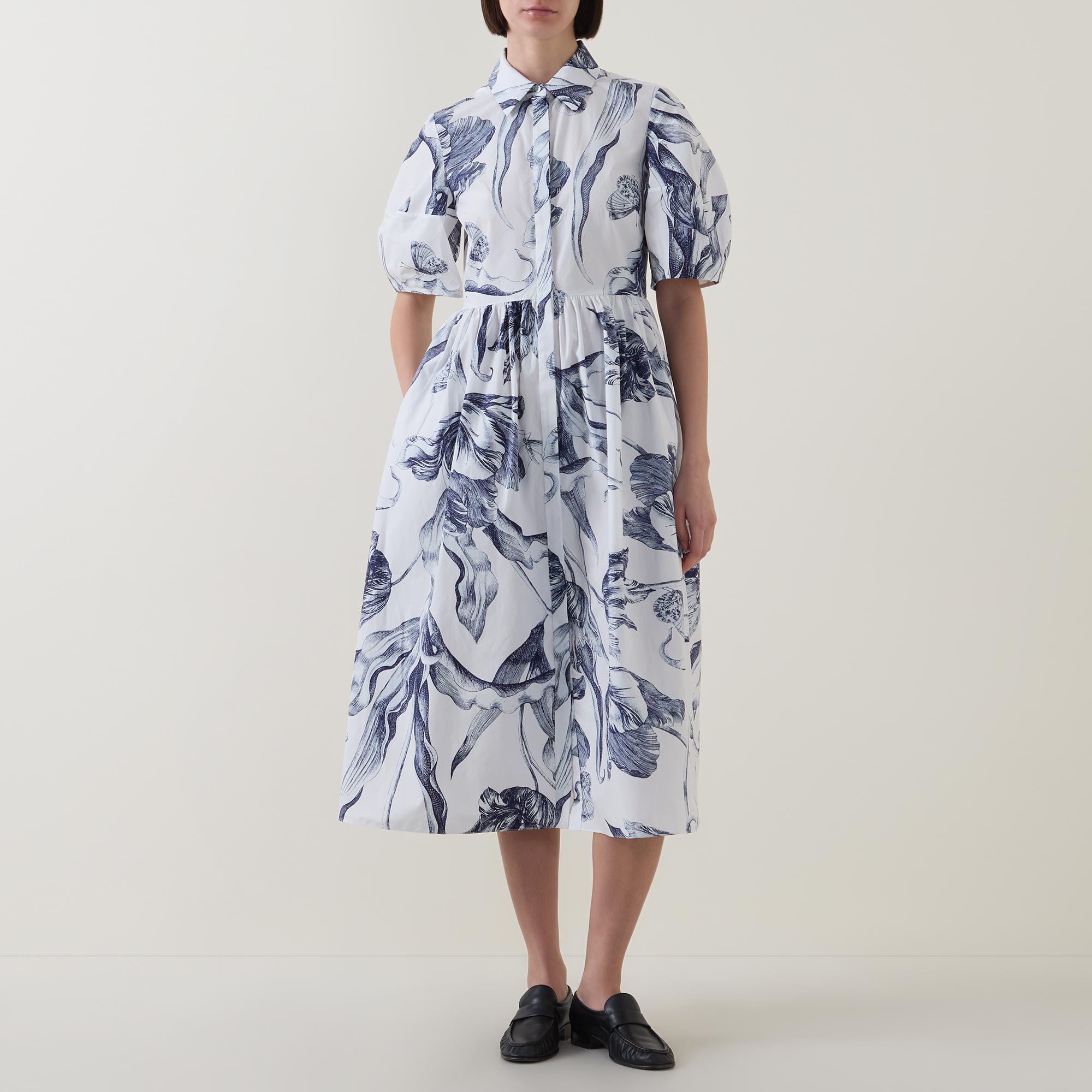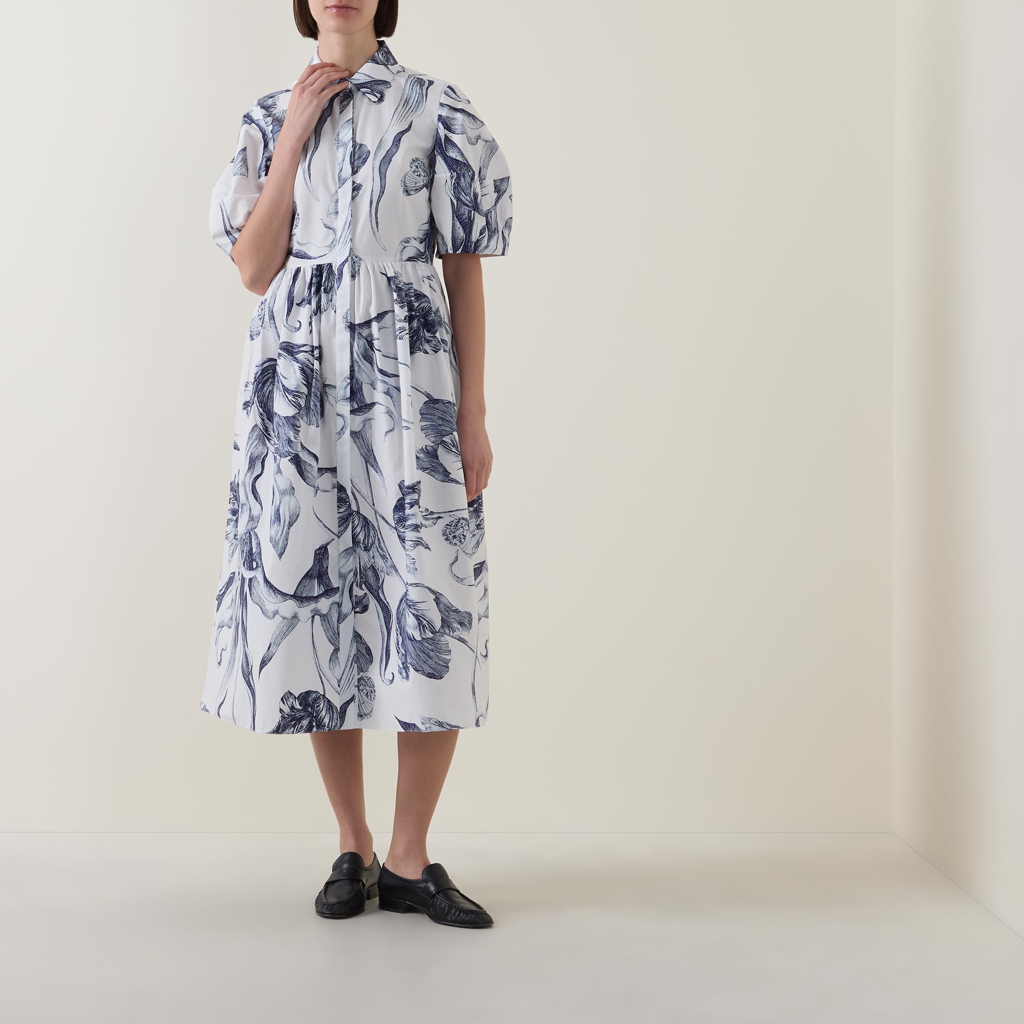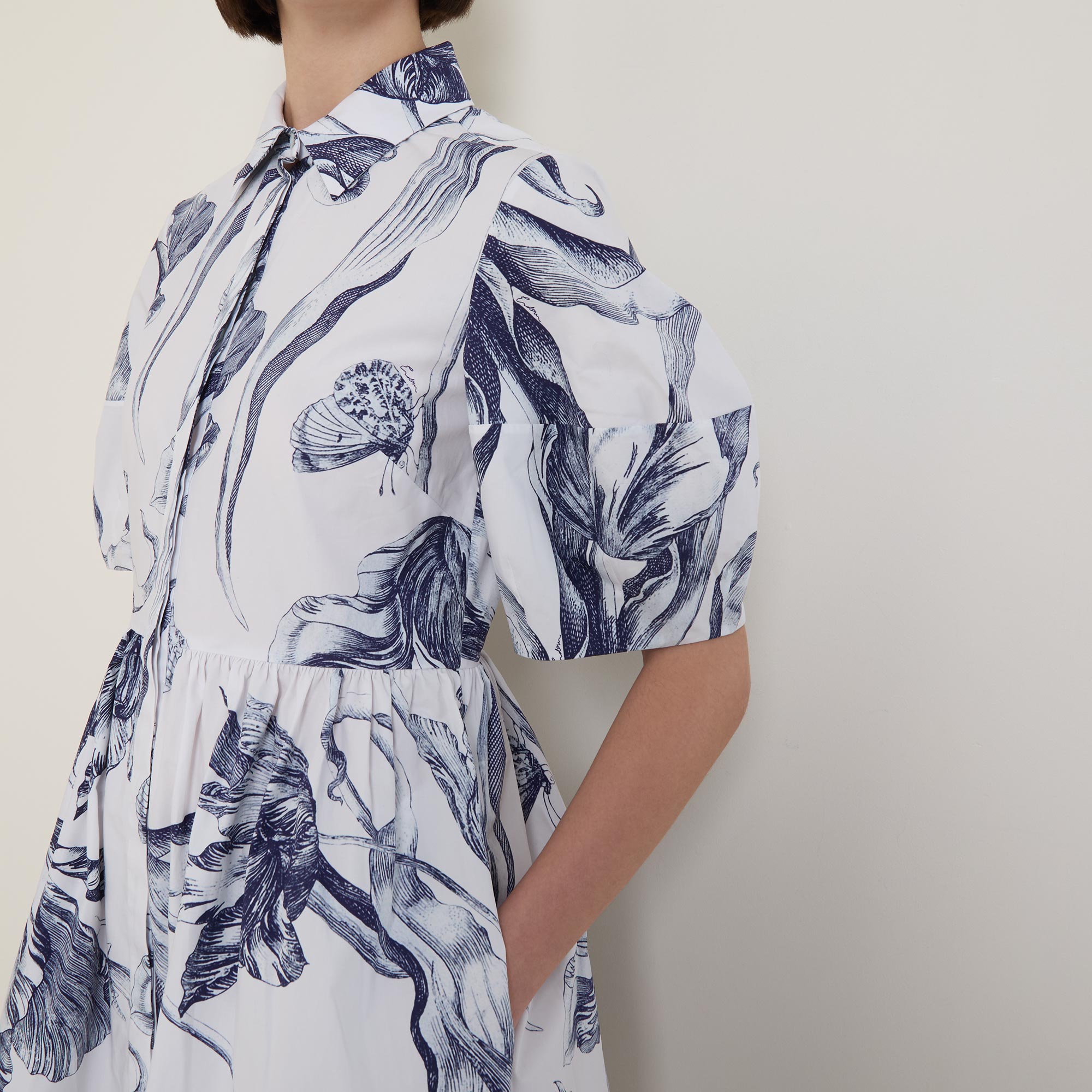 - Collared neckline, button fastening, midi length, short puff sleeves, voluminous hemline, side entry pockets, midnight botanical print, heavy poplin fabric