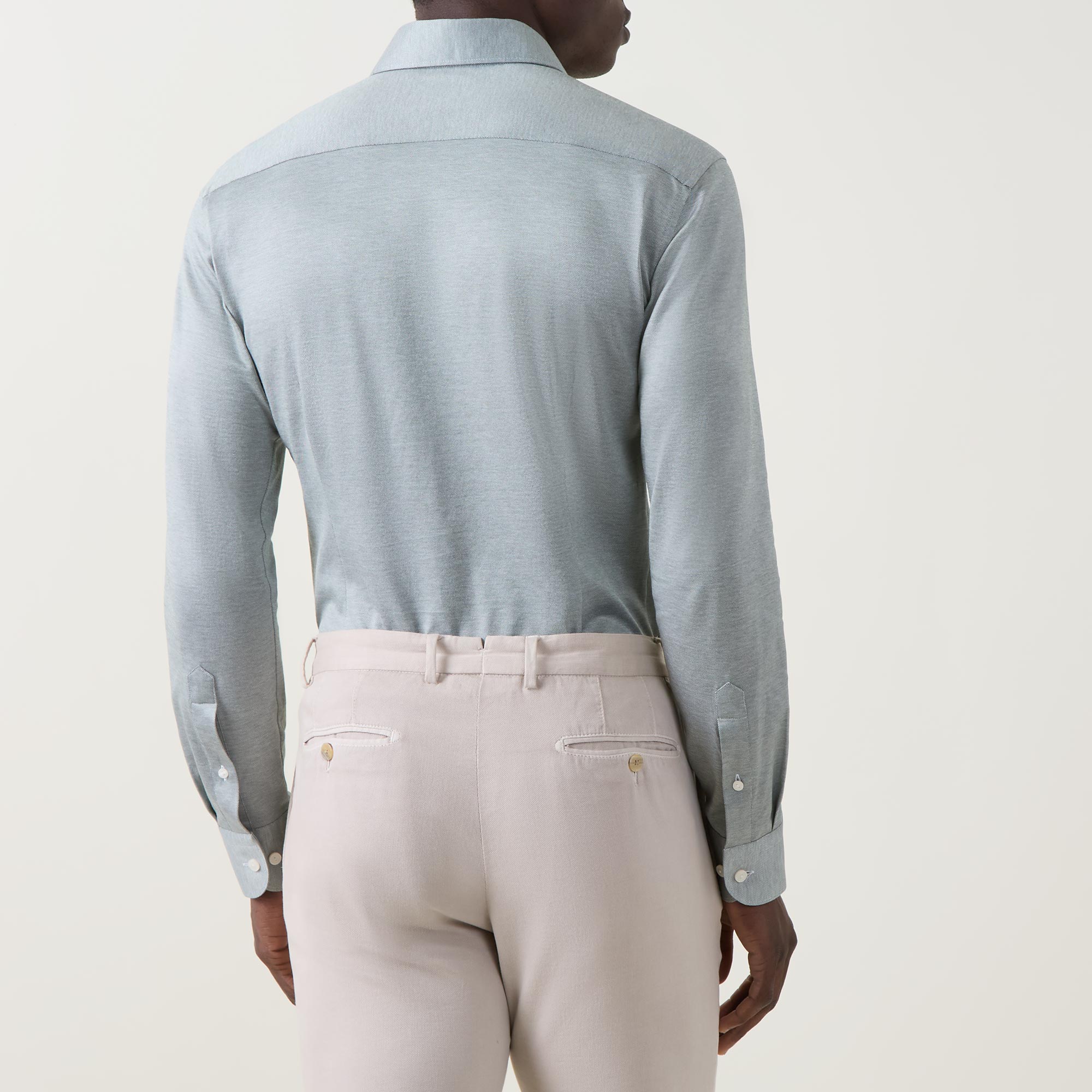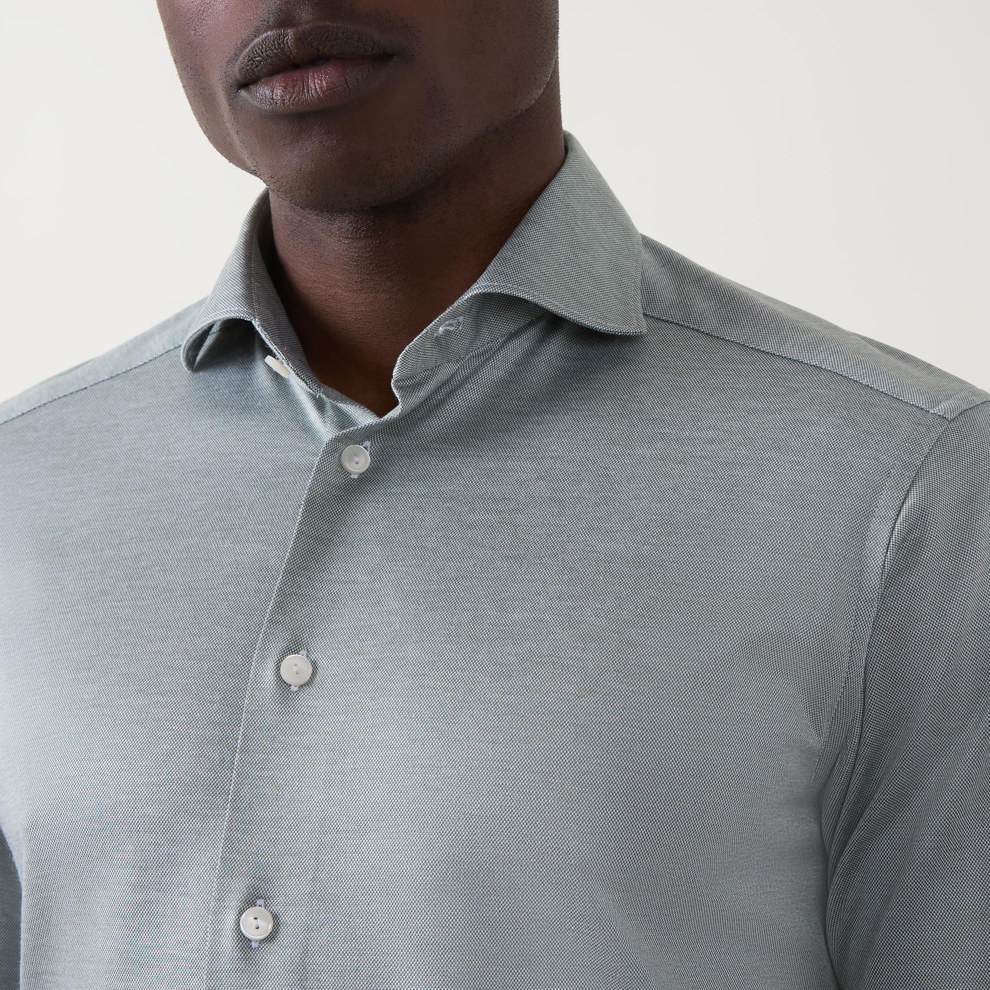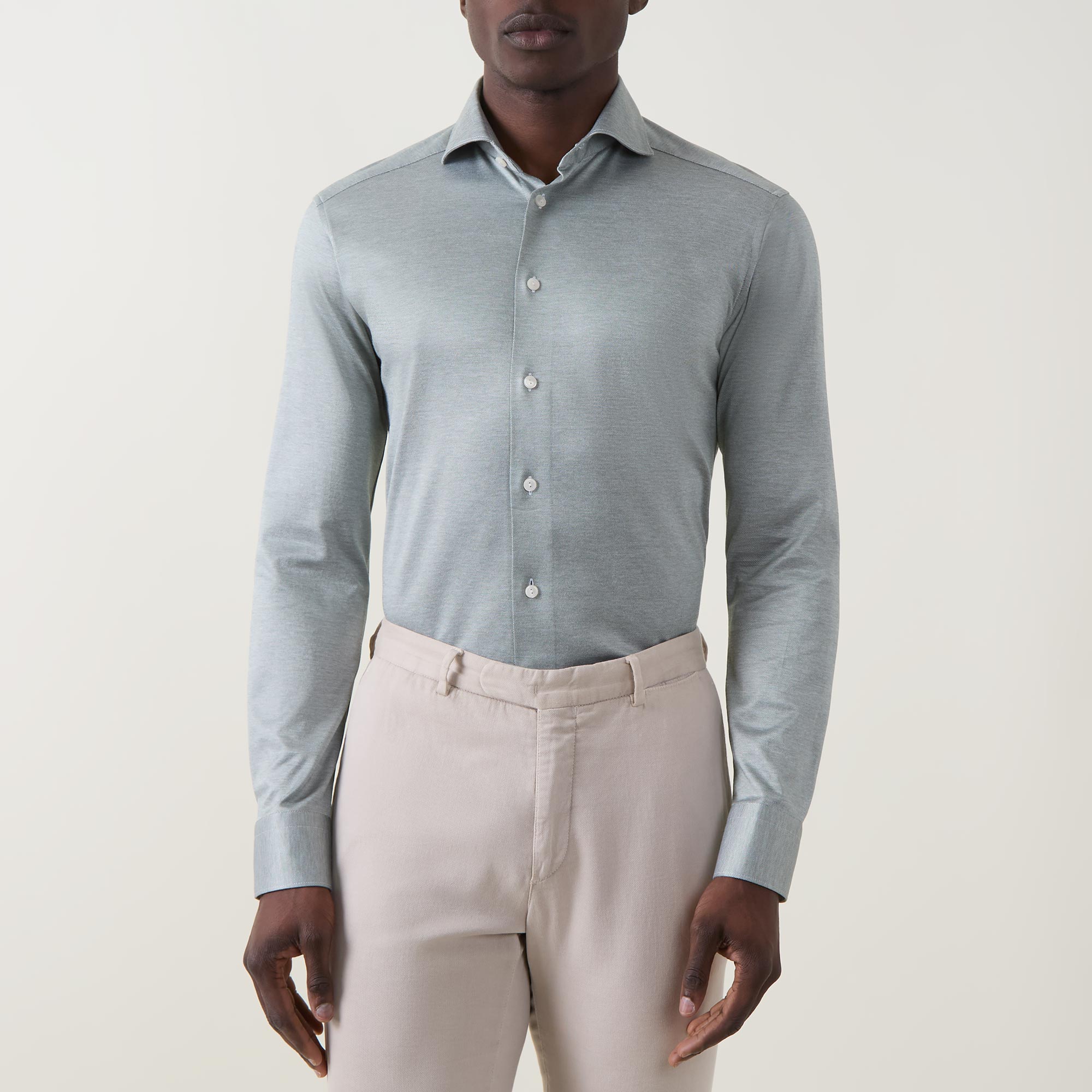 - Wide spread collar, long sleeves, rounded single button cuffs, front button placket, curved hem, knit construction, jersey fabric, silky sheen finish
