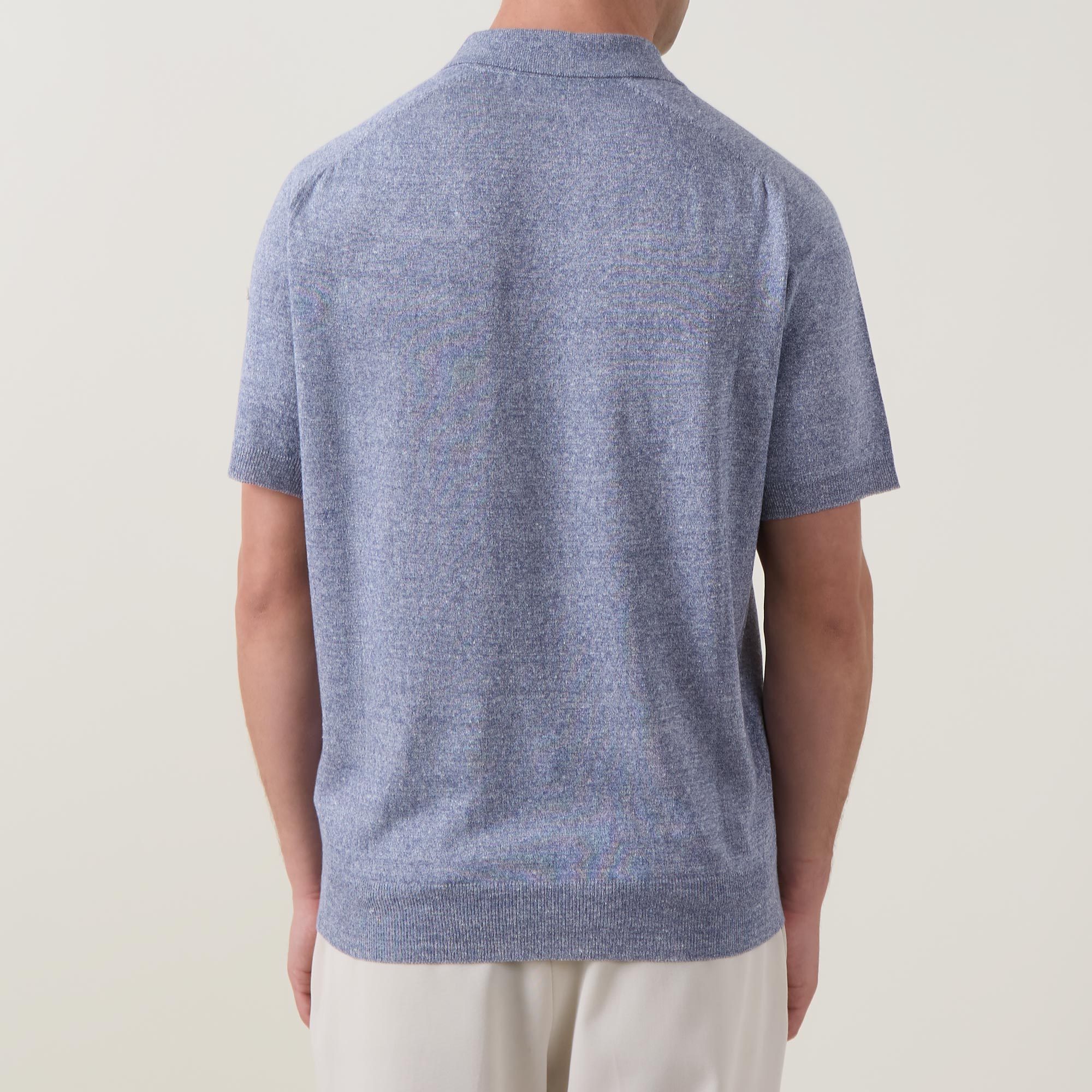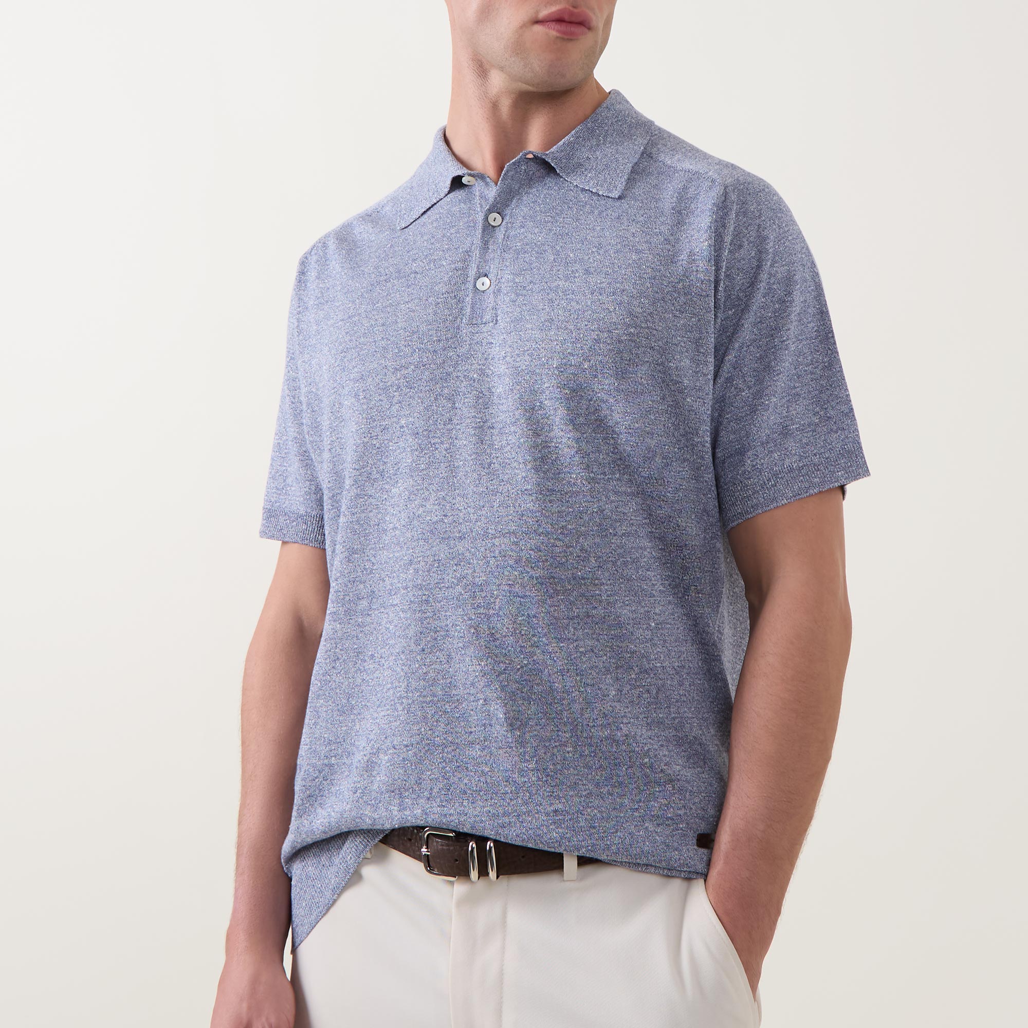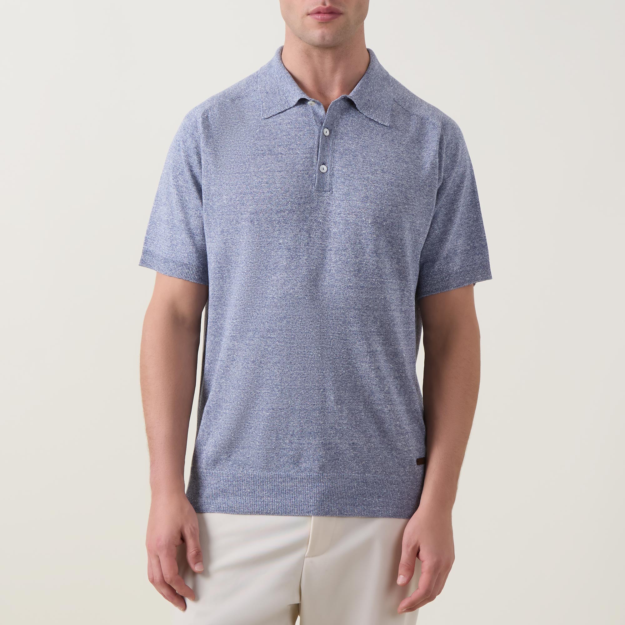 - Polo collar, three-button placket, short sleeves, straight hem, ribbed trims, logo detail, textured finish