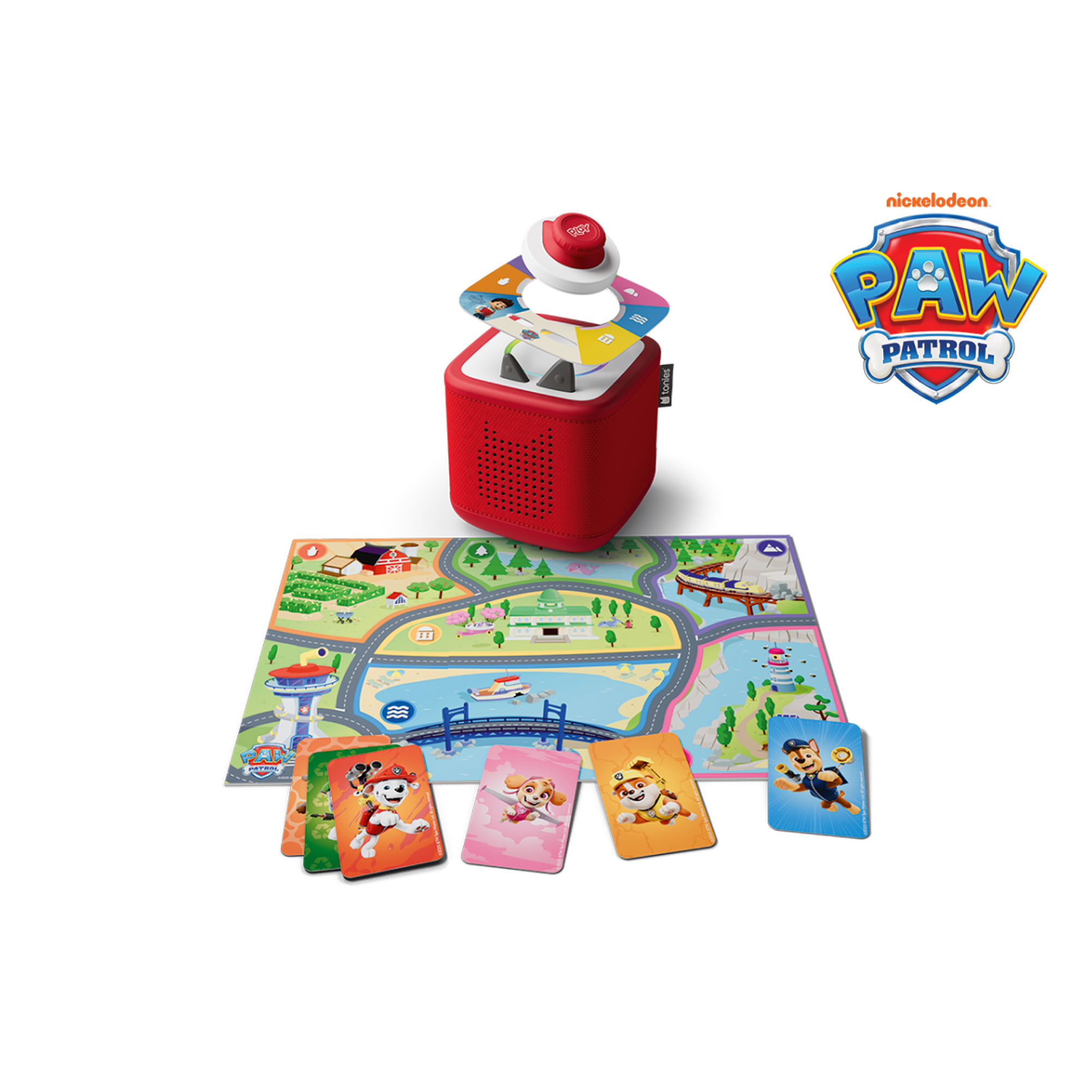 - Tonieplay Game, PAW Patrol theme, six action-packed missions, 10+ mini games, one Adventure Bay Map game board, six Pup Cards, 92 mins of total play time, booklet, instructions
