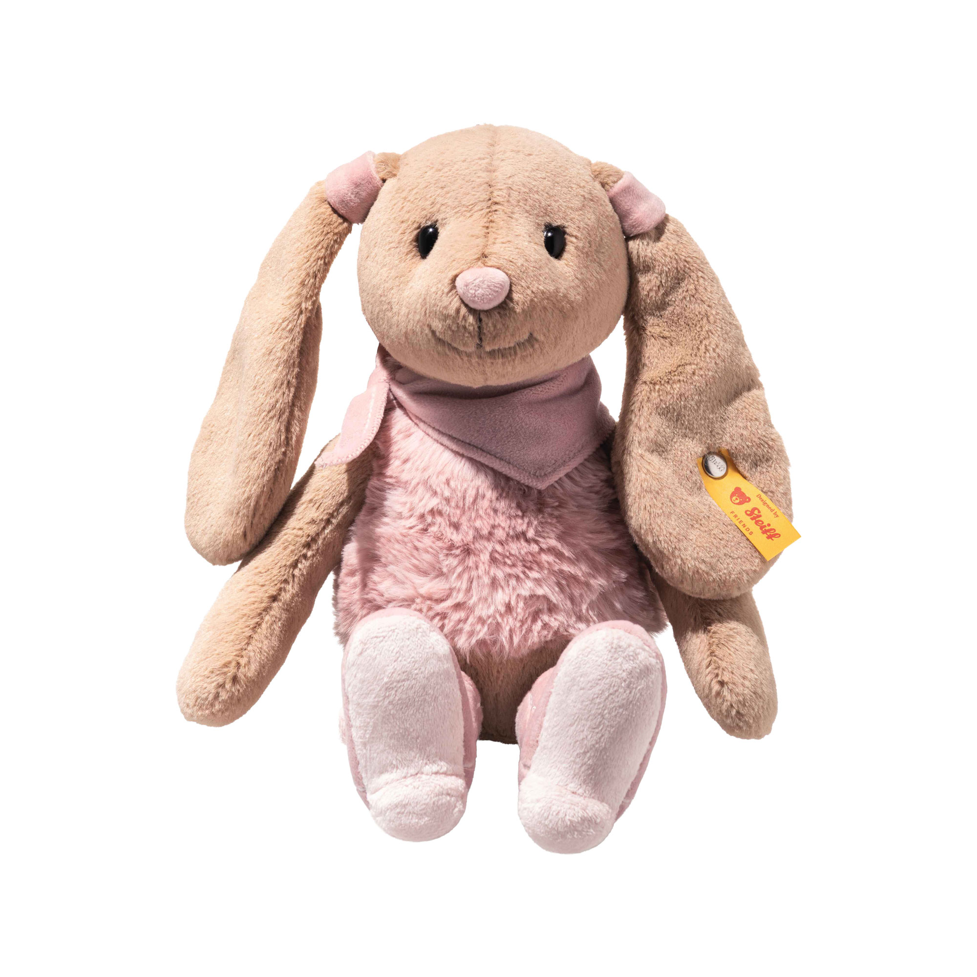 As the prairie sky glows at sunset, Hoppie cowgirl rabbit is already setting off on her next adventure. Made from snuggly soft plush, she sits steadily thanks to little bean bags in her bottom. Her gentle eyes and sweet little nose are simply made for cuddles. Delicate star embroidery decorates her cowgirl boots, while the iconic Steiff “Button in Ear“ is there to ride along on every journey through the Wild West.