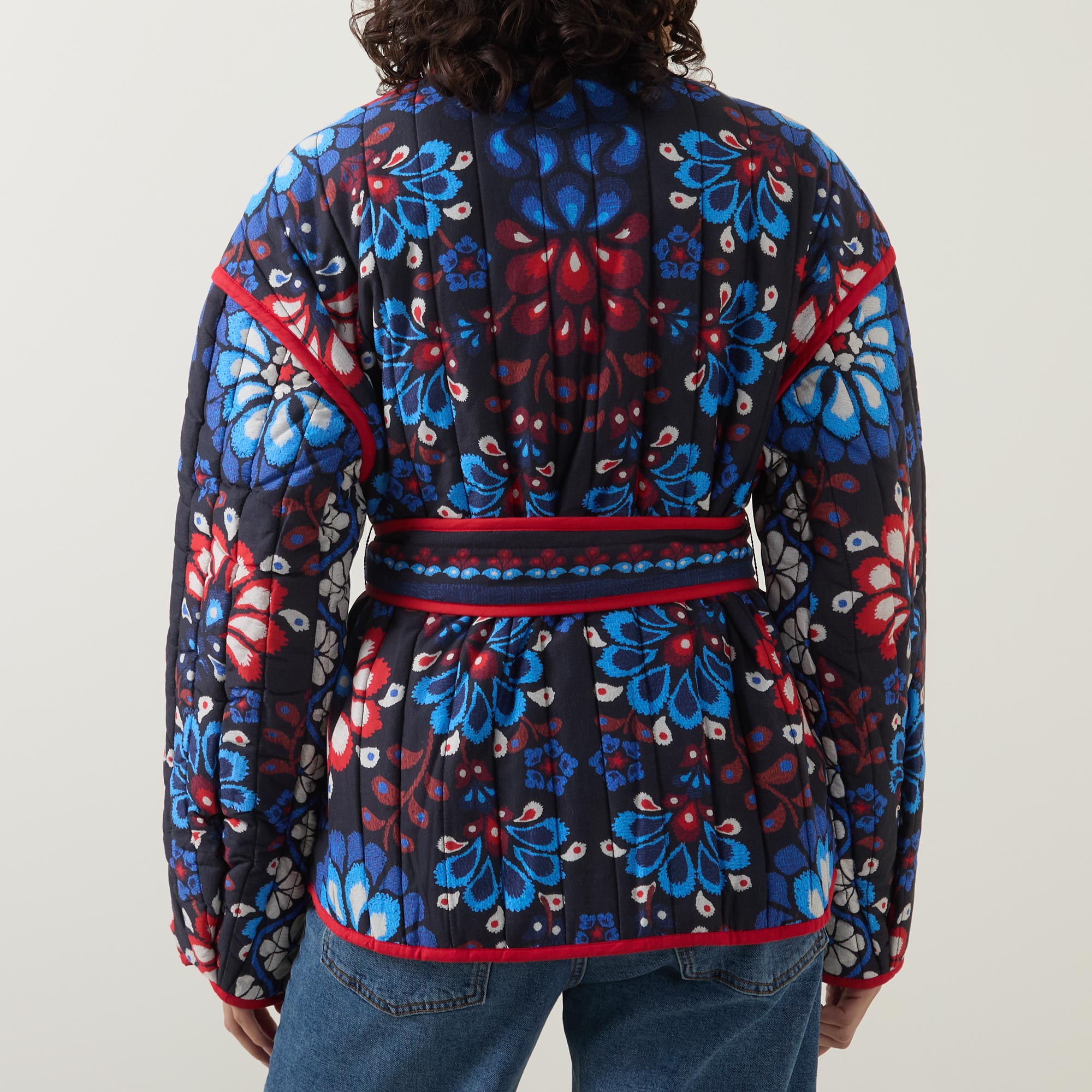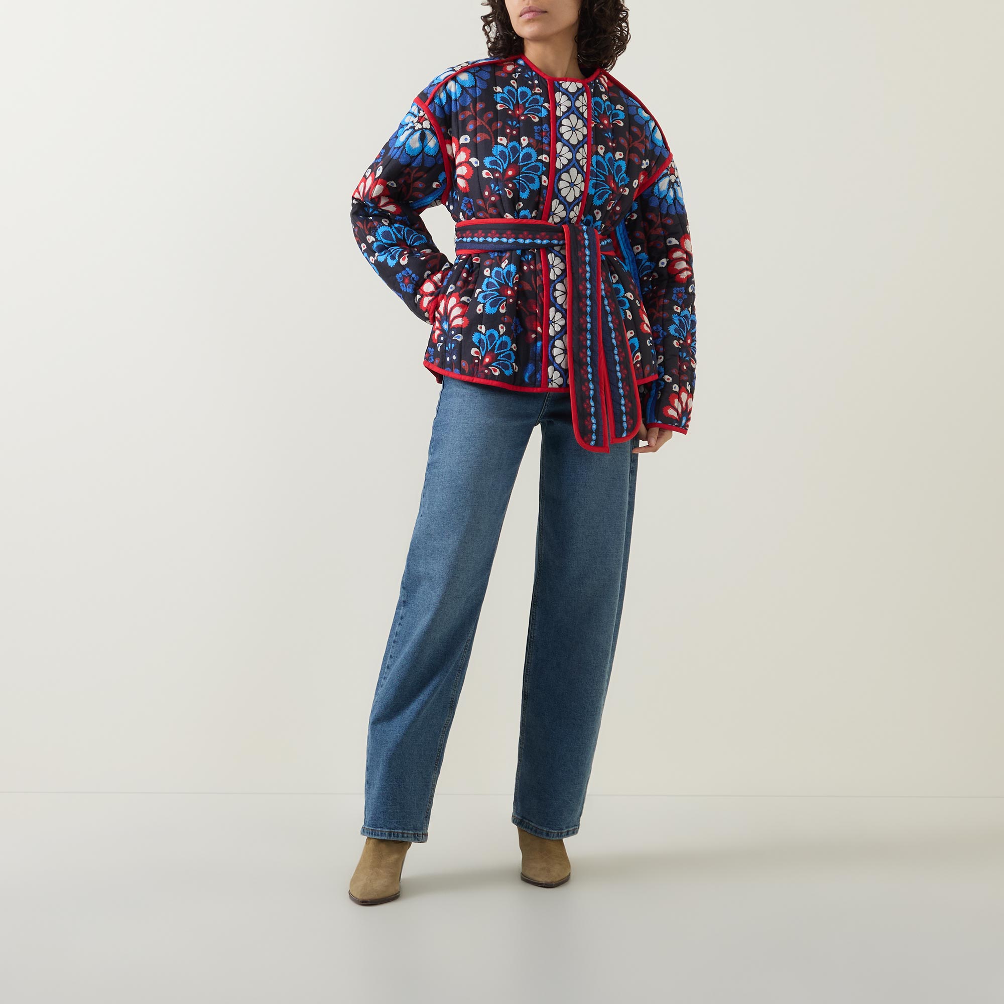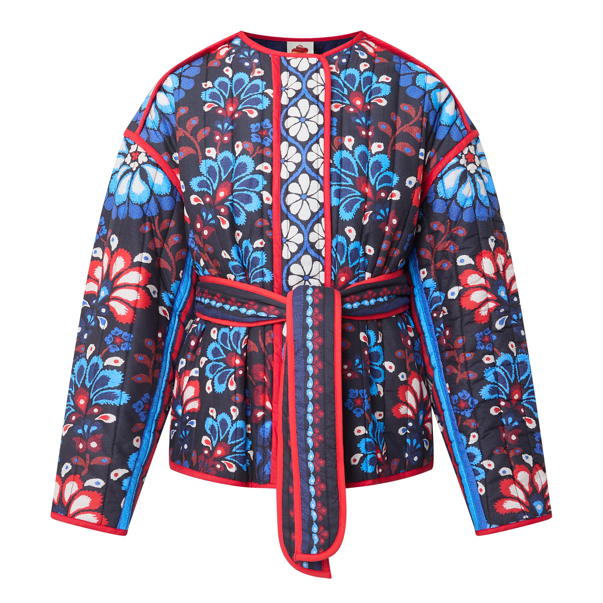 - Round neckline, dropped shoulders, long sleeves, concealed front fastening, matching belt, straight hem, contrast piping, playful print throughout, quilted finish