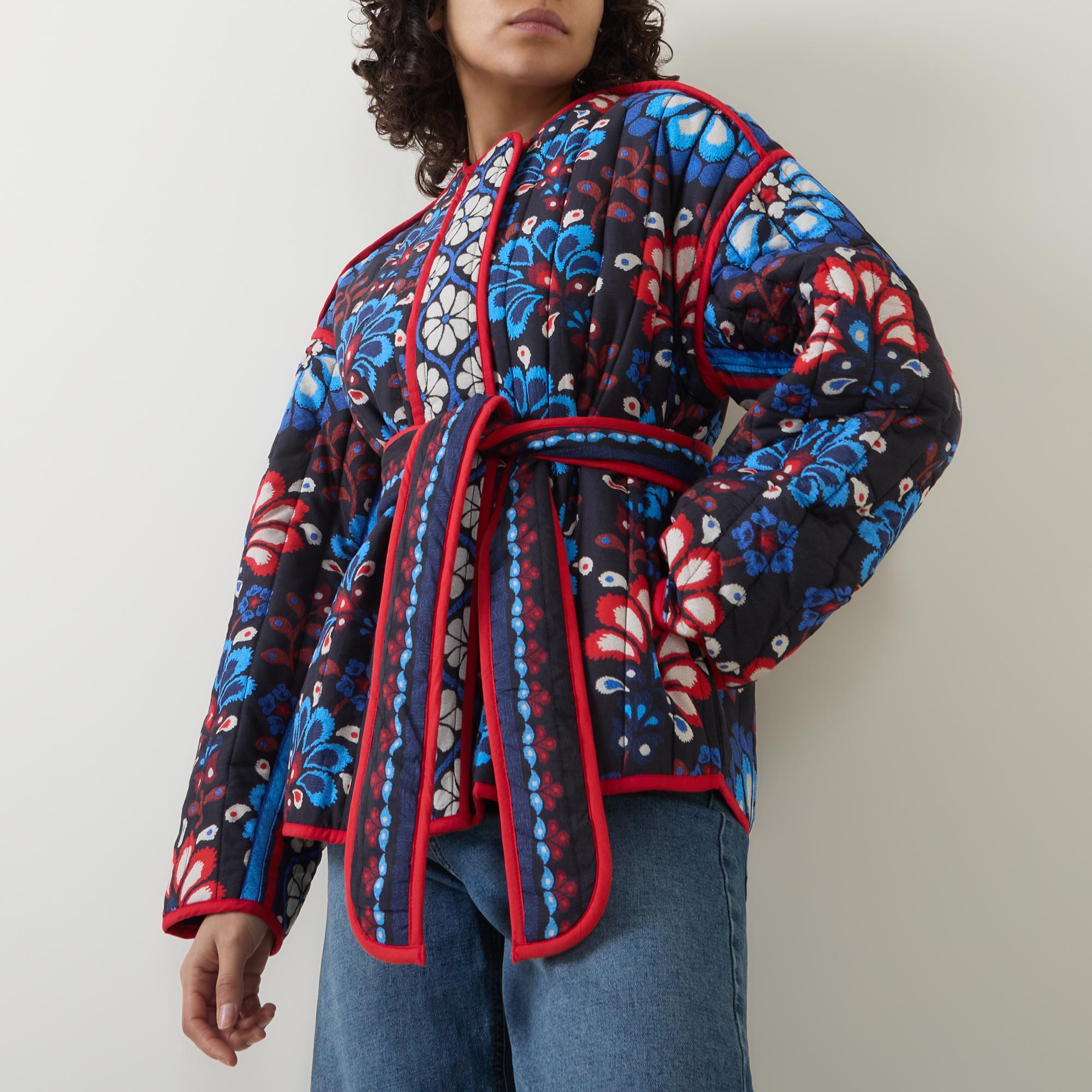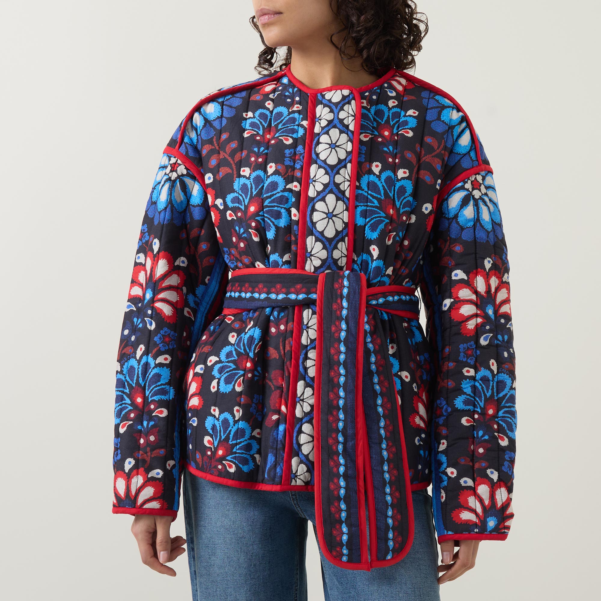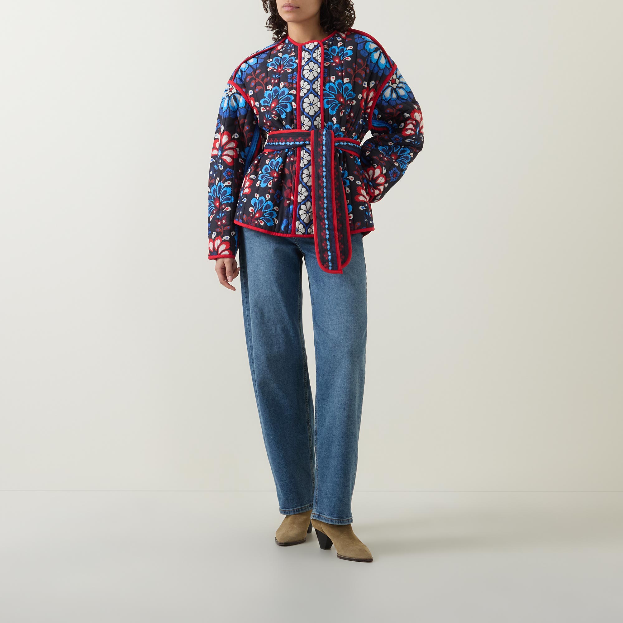 - Round neckline, dropped shoulders, long sleeves, concealed front fastening, matching belt, straight hem, contrast piping, playful print throughout, quilted finish
