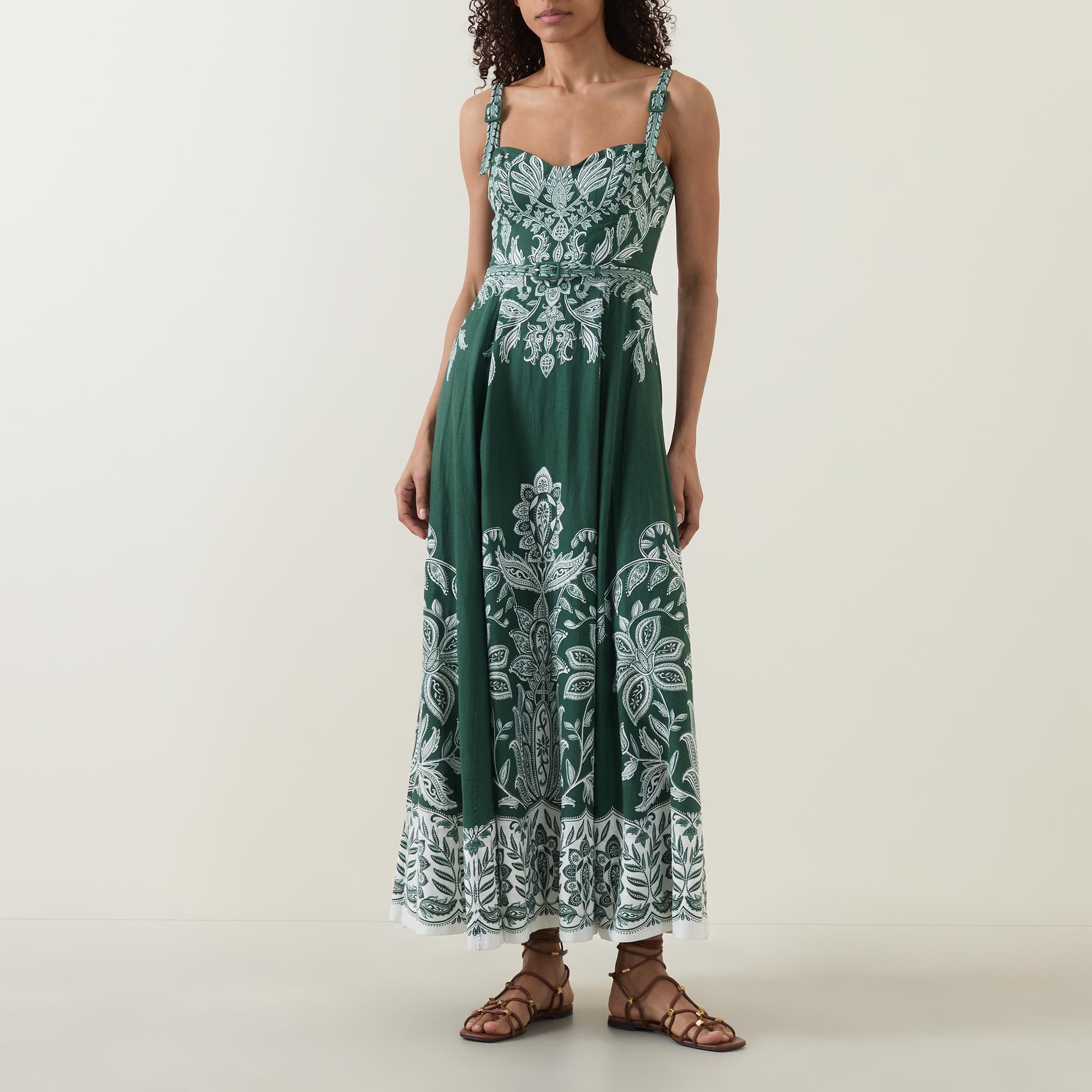 - Sweetheart neckline, adjustable straps with buckle fastenings, rear smocking, zip fastening, matching belt with buckle closure, fitted through the waist, two side seam pockets, flared skirt, scalloped hem, embroidered detailing throughout, midi length