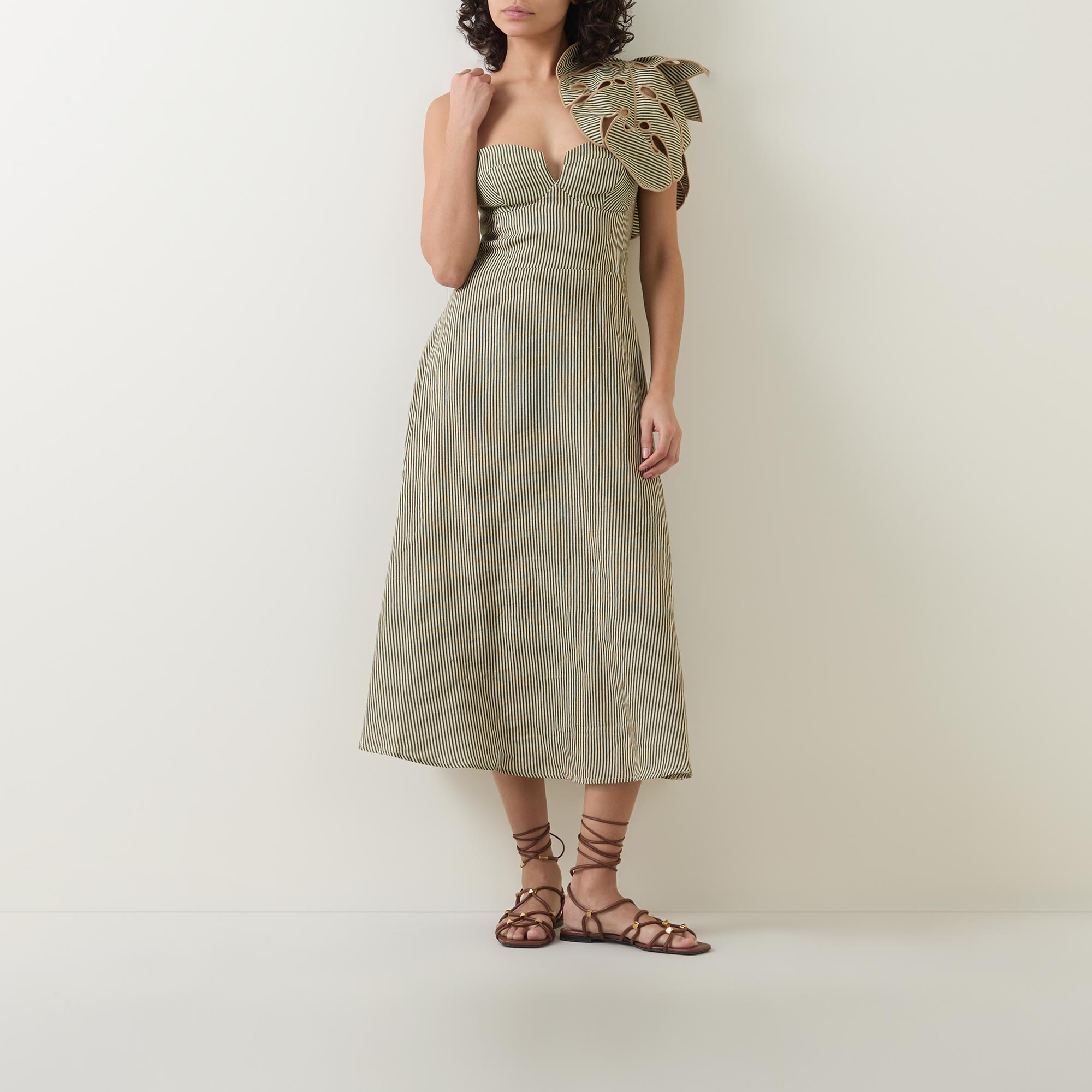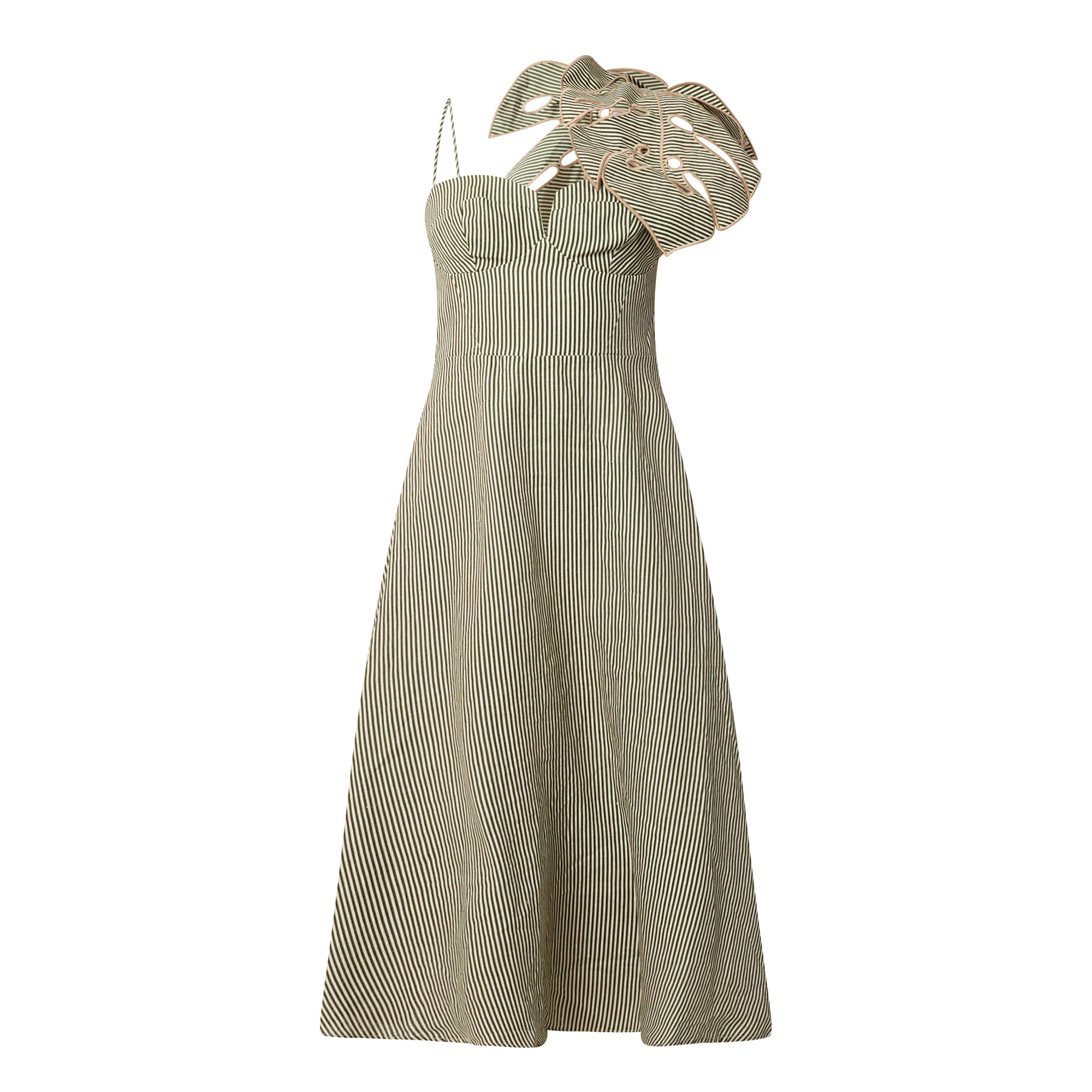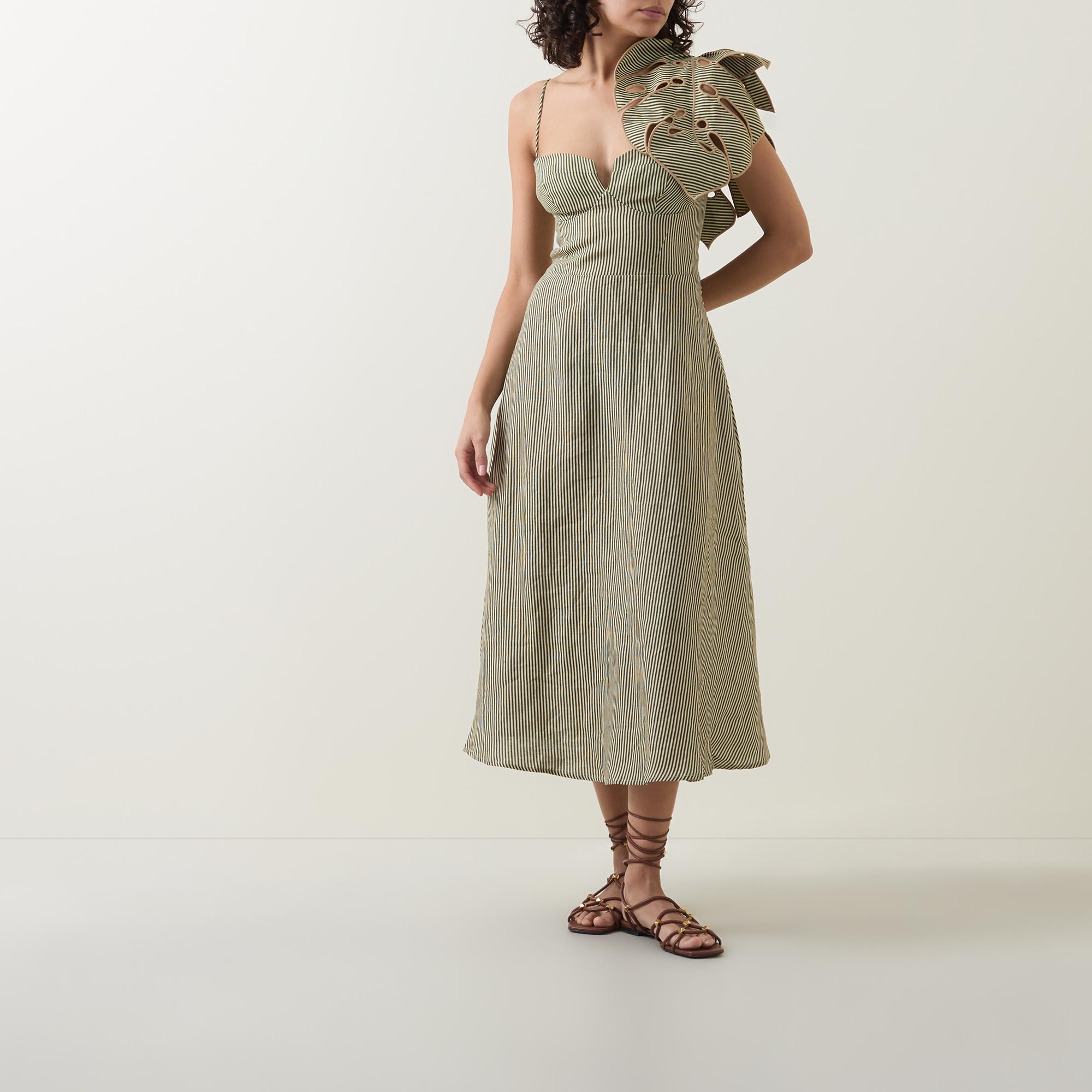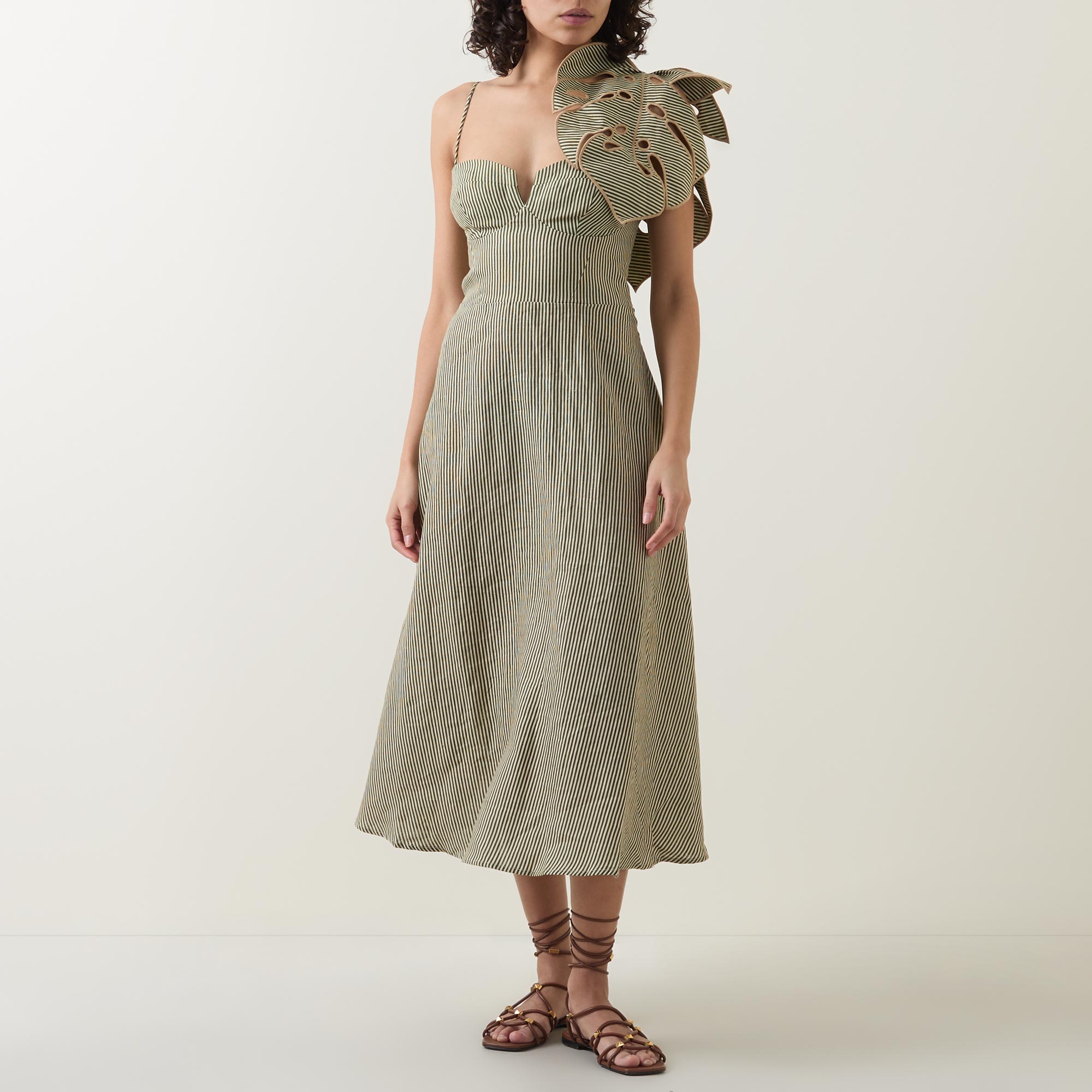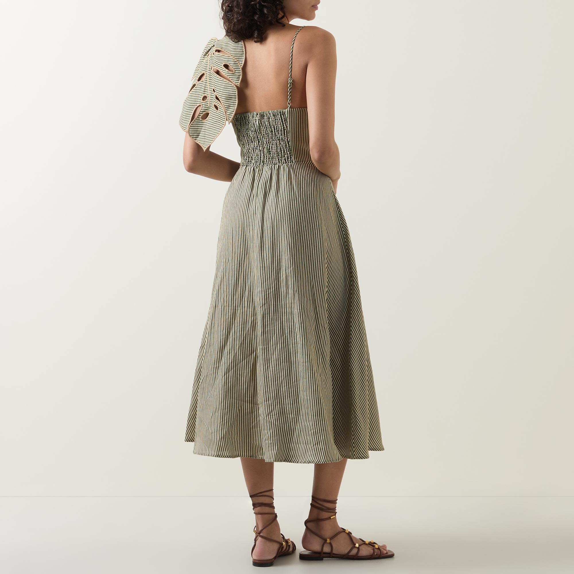 - Sweetheart neckline, narrow adjustable straps, fitted bodice, rear shirred back and zip closure, full flared skirt, straight hem, striped design, monstera leaf appliqué, midi length