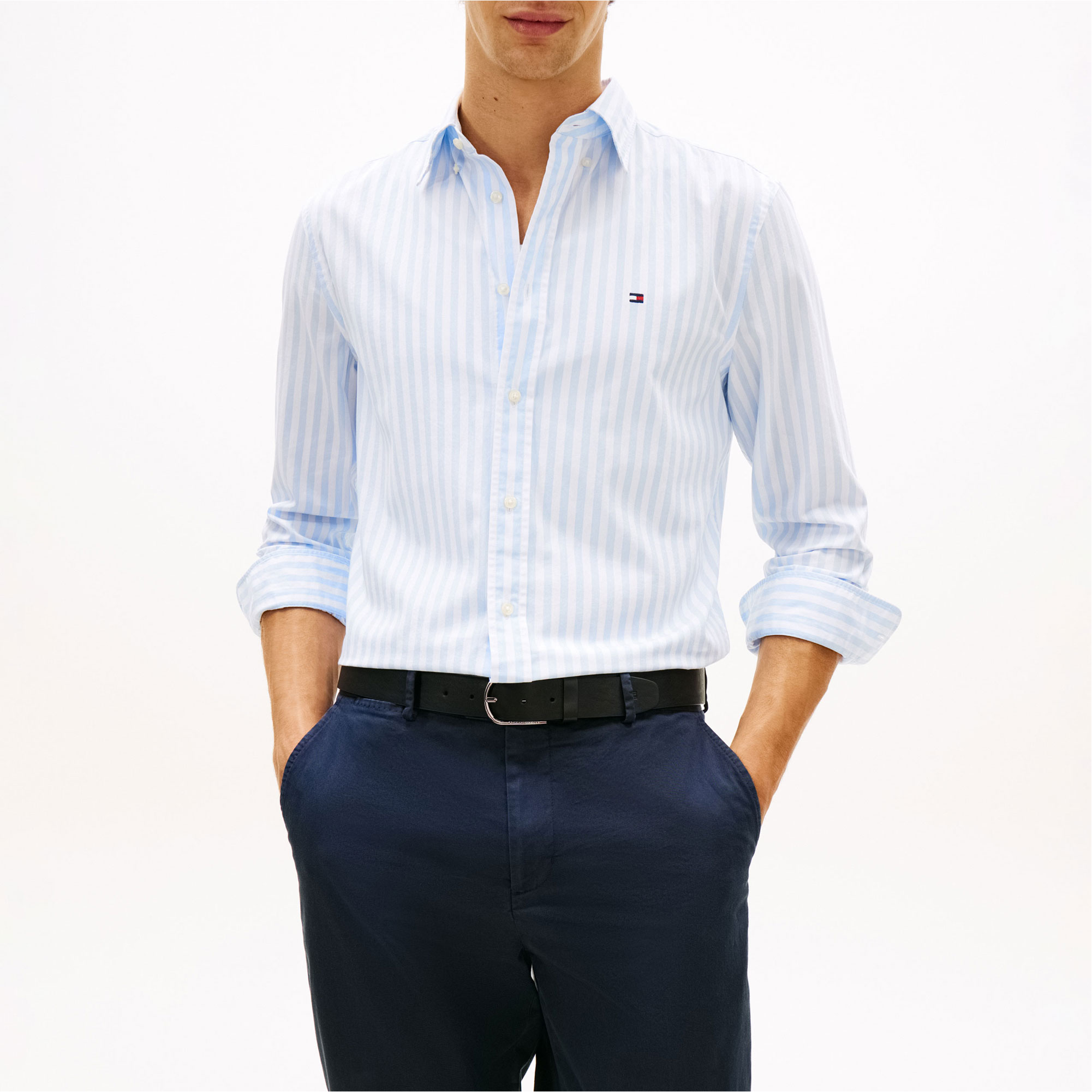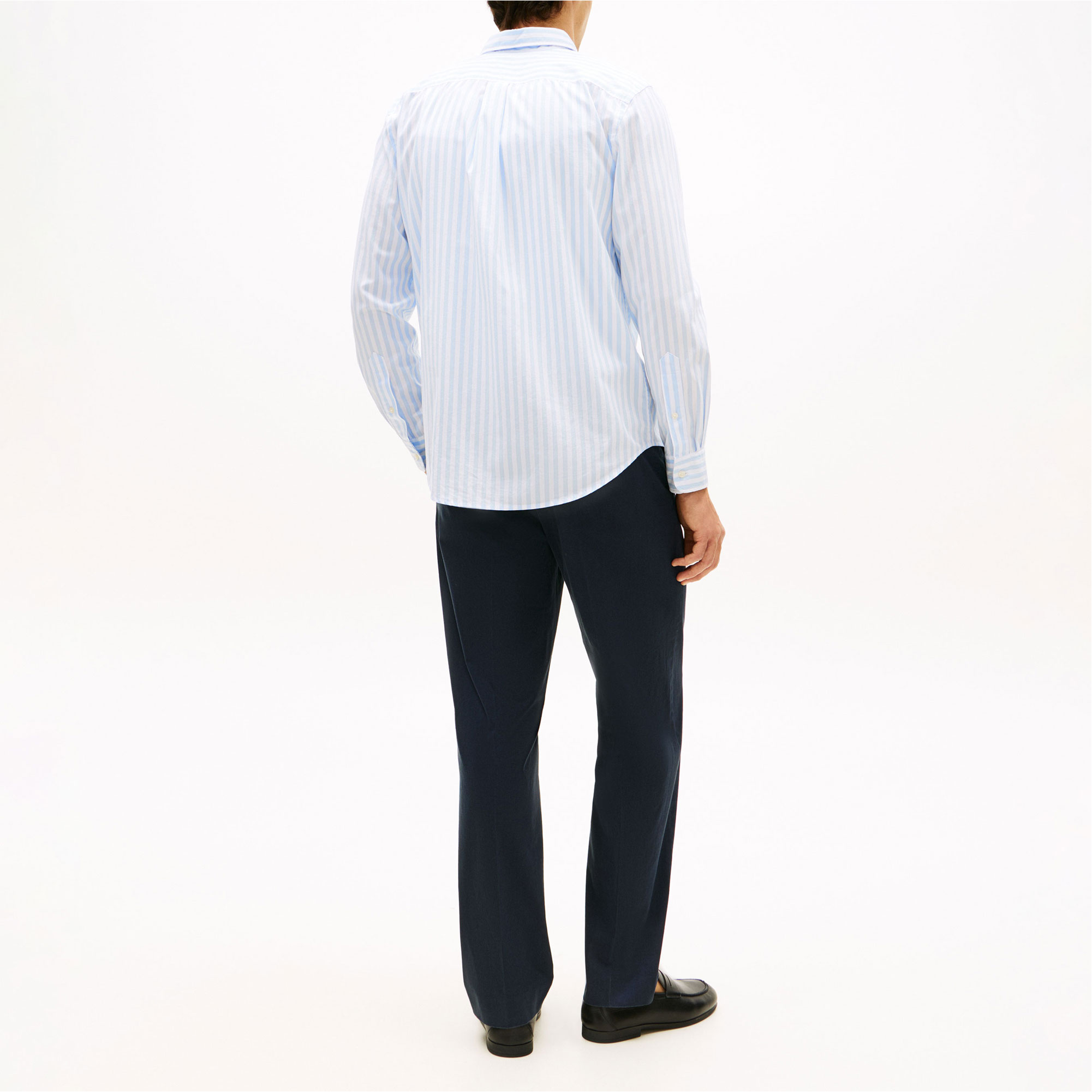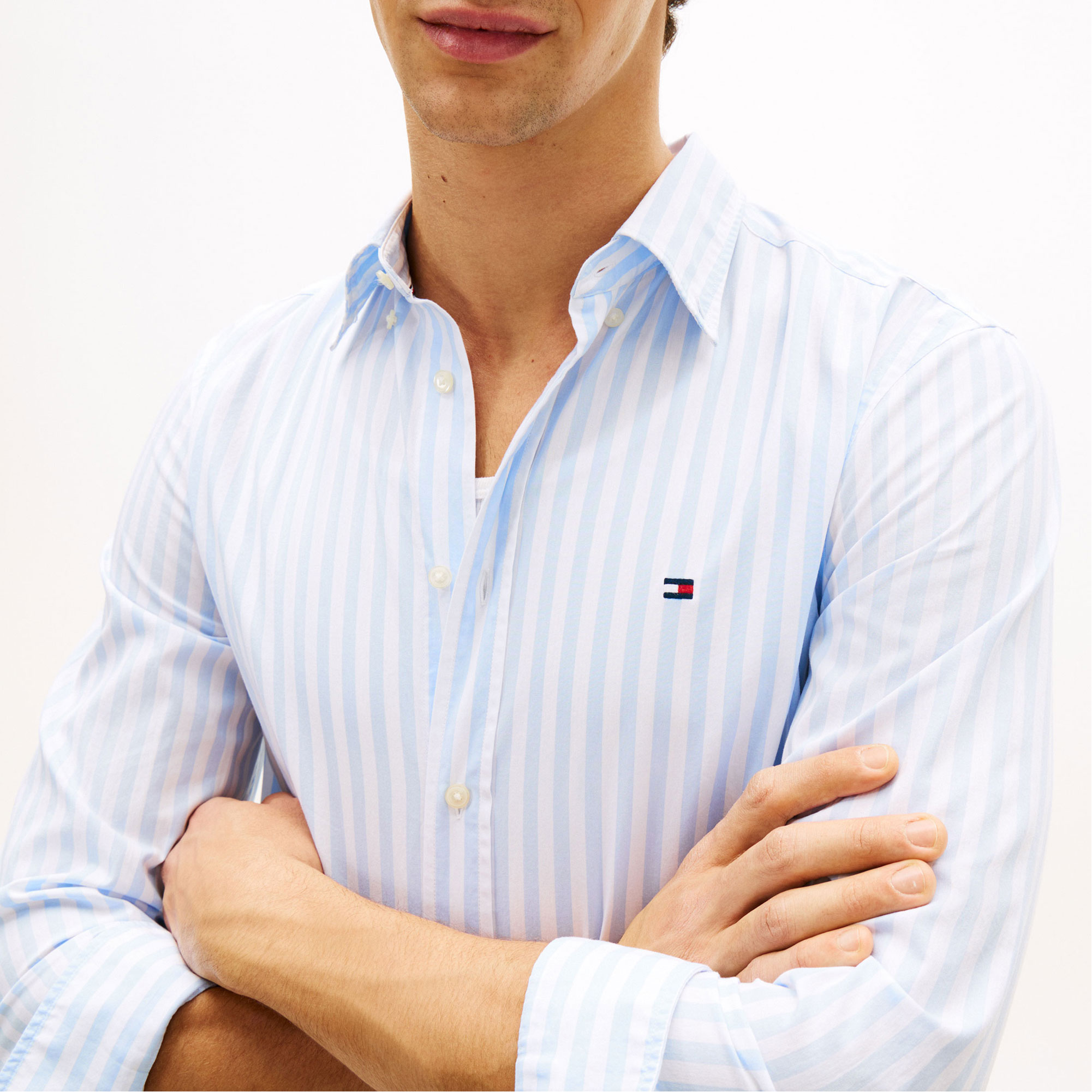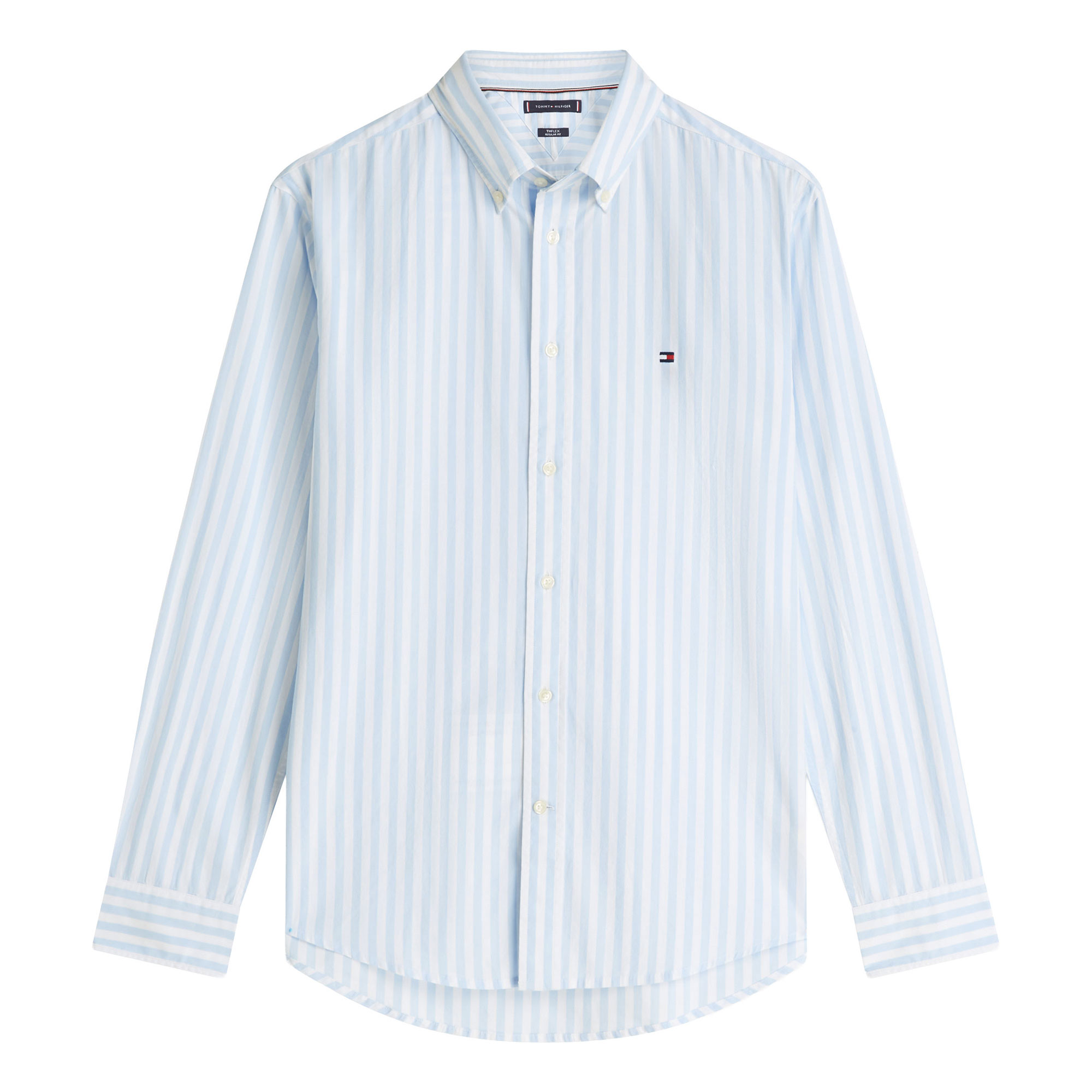 • Peached poplin fabric, flex technology, all-over vertical stripe design, button-down collar, rounded one-button cuffs, box pleat, shirttail hem, signature tape inside neckline, branding details, flag logo embroidery, long sleeves