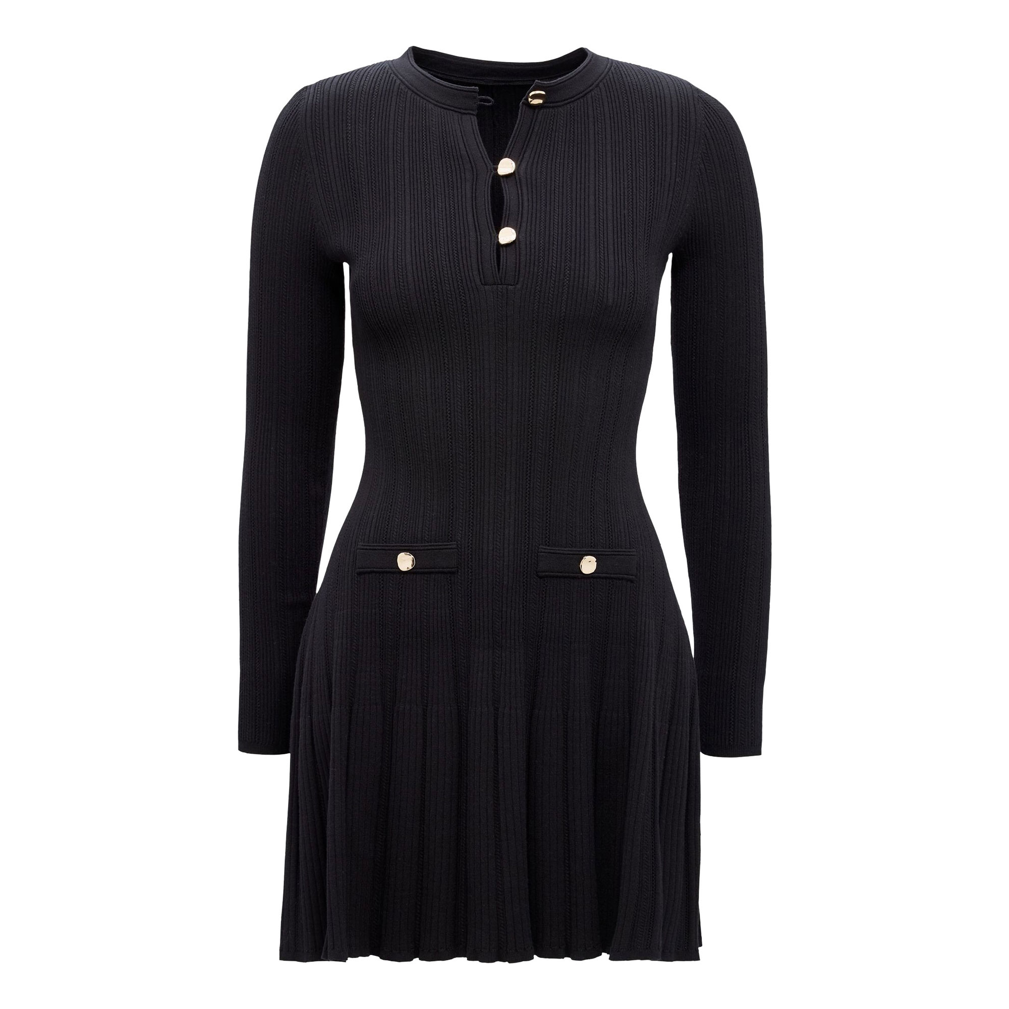 • Soft panel detailing at hem, long-length sleeves, knitted fabrication, gold-tone front button detailing, front pocket welts, easy slip-on style