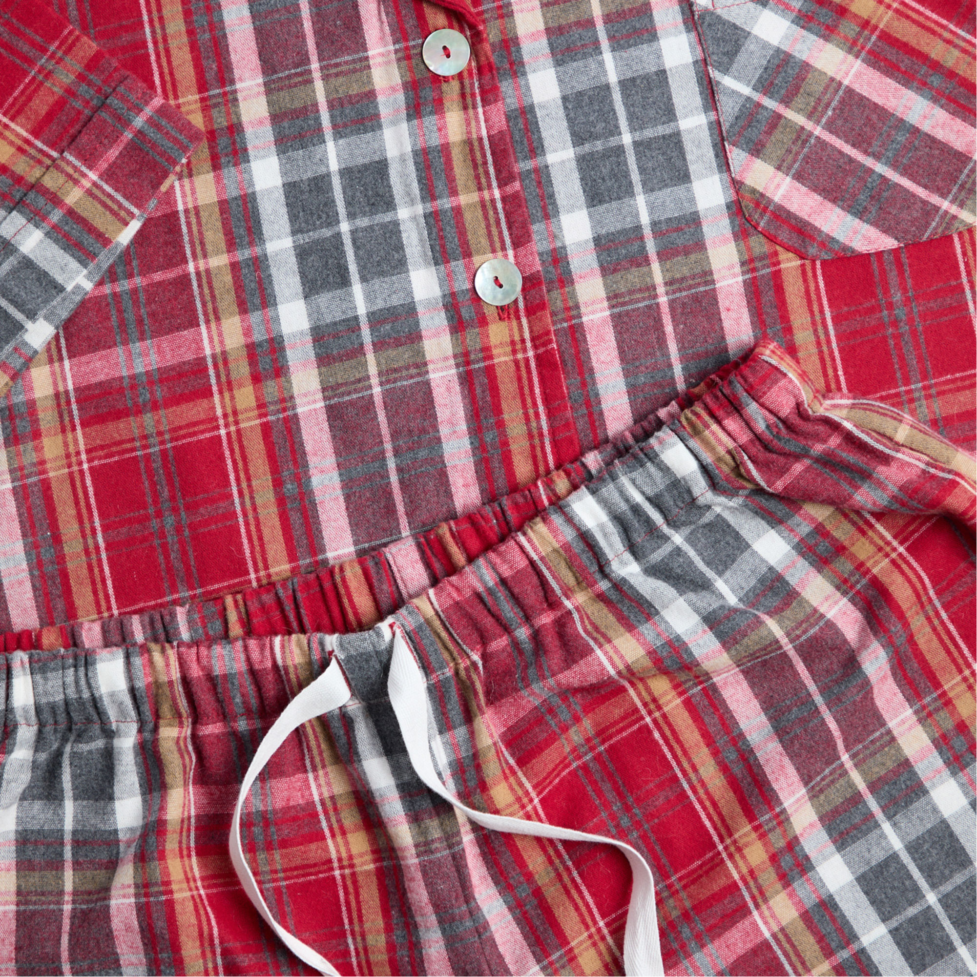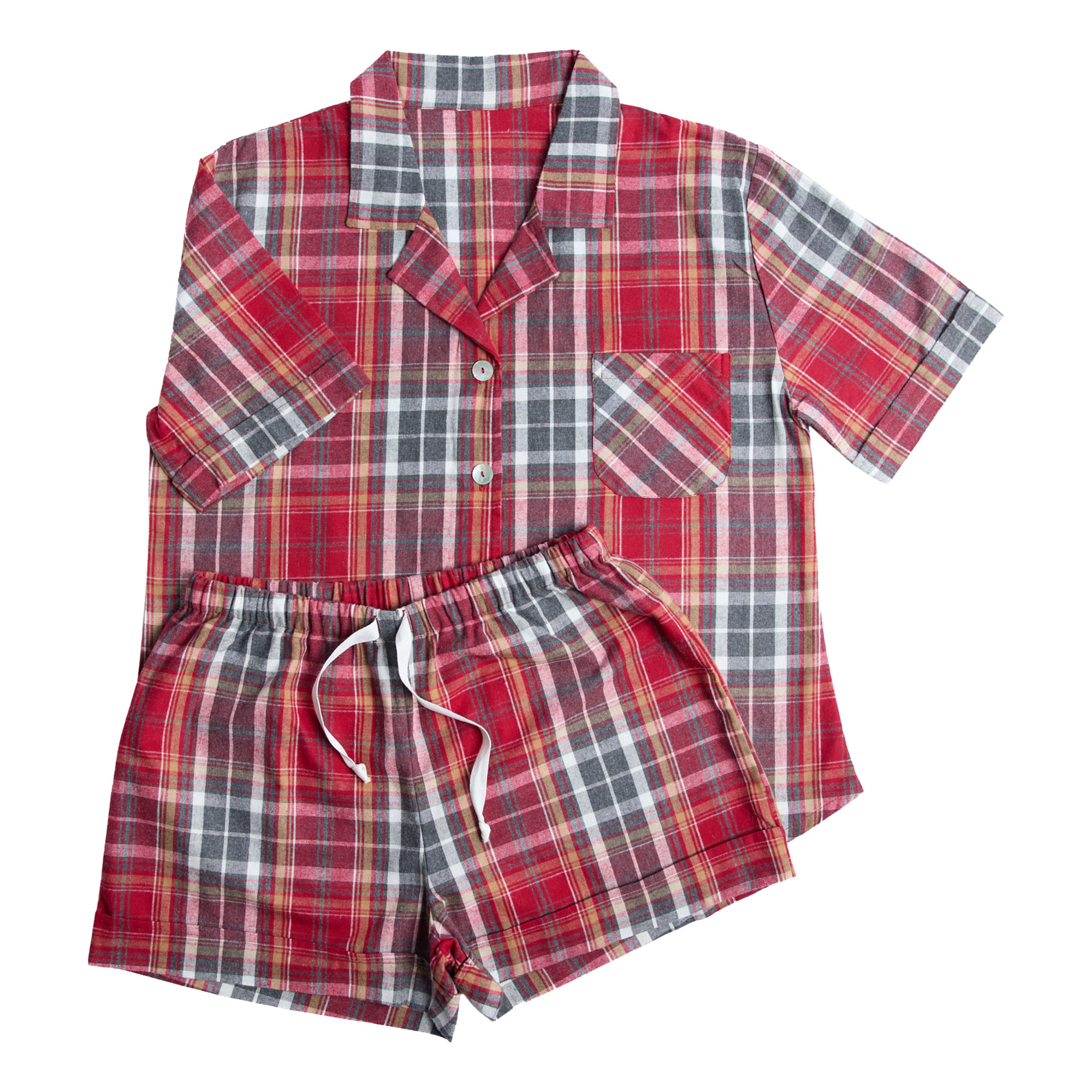 • Top: Tartan check pattern, brushed flannel fabric, short sleeves, front button fastenings, revere collar, chest pocket. Bottoms: Tartan check pattern, brushed flannel fabric, drawstring waistband