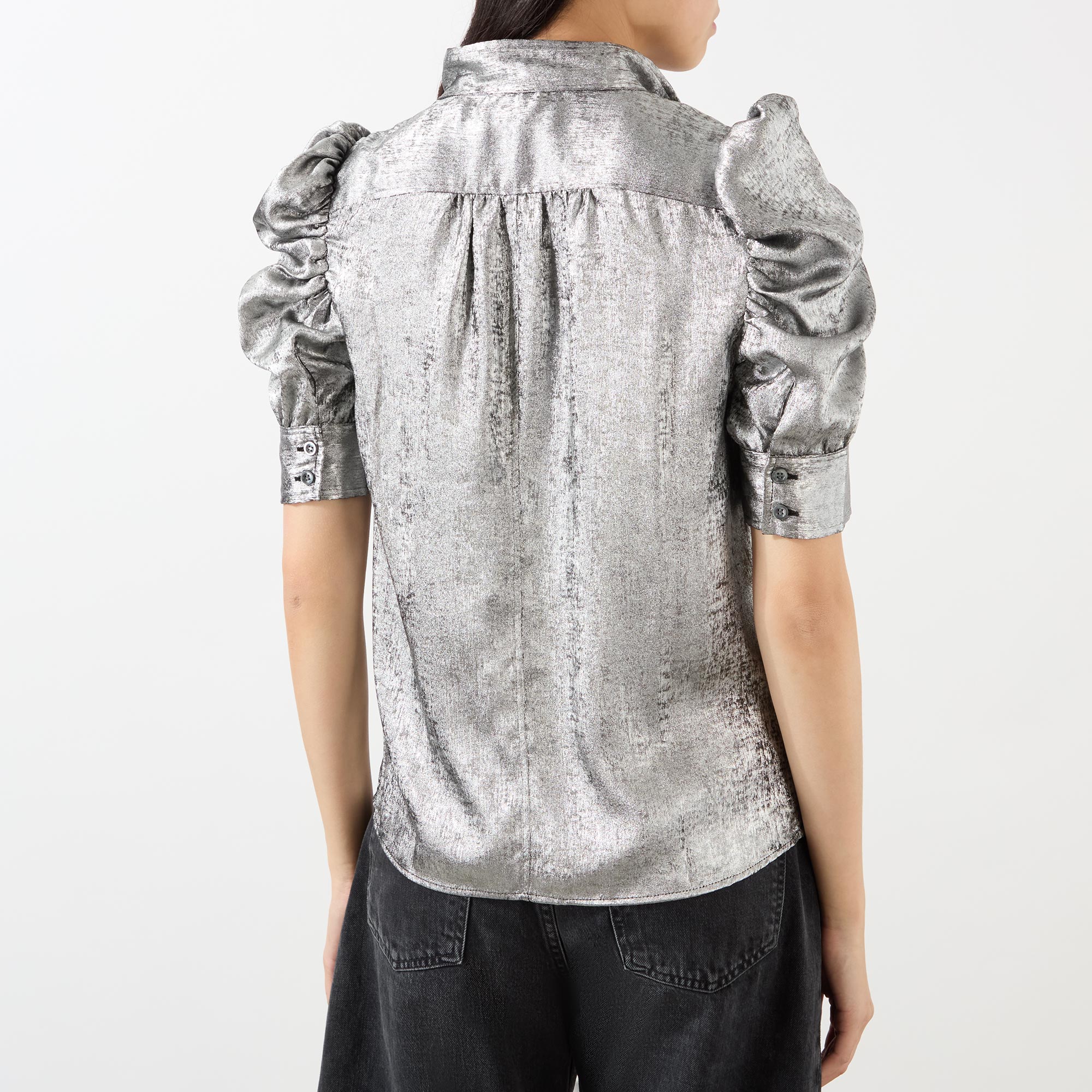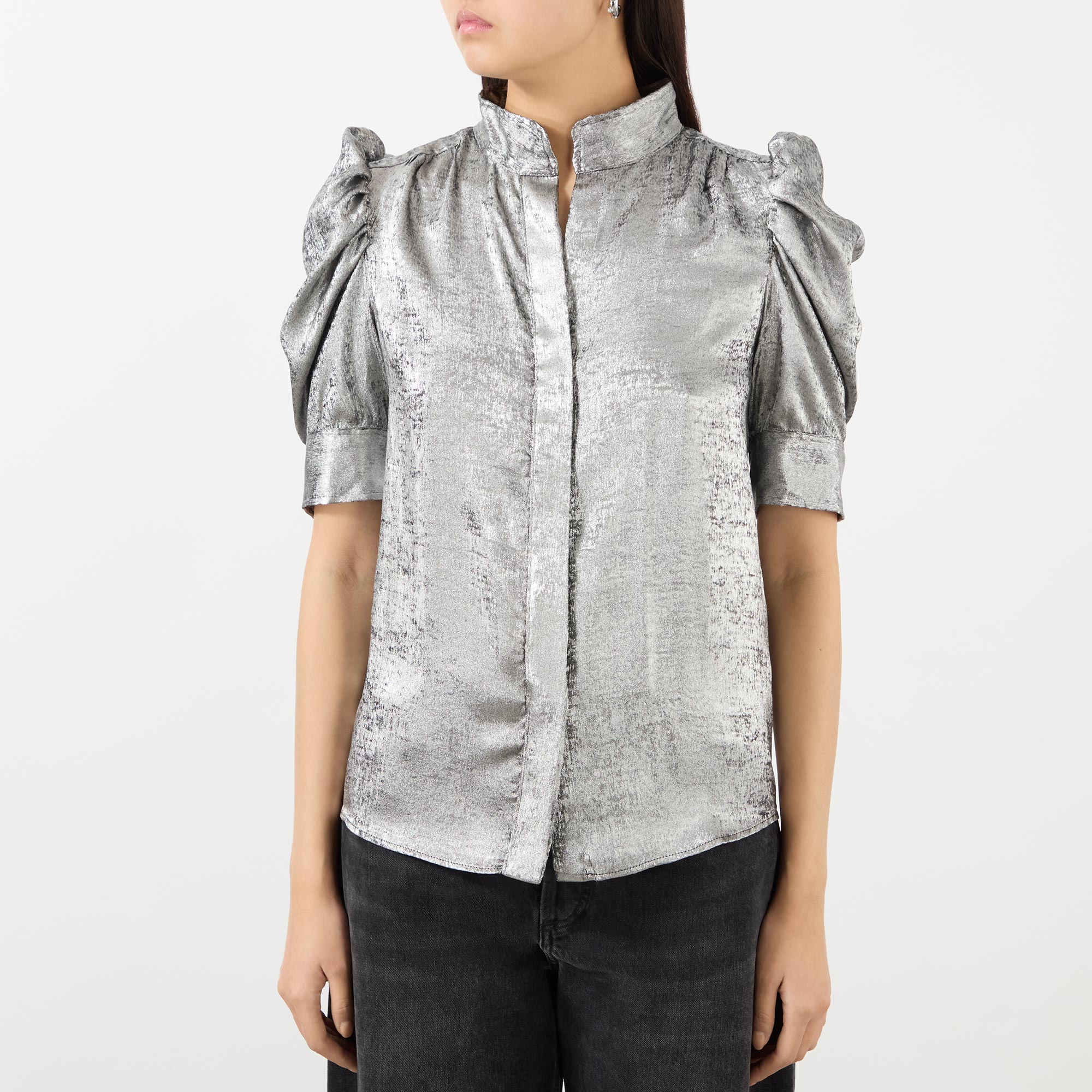 - Stand-up collar, short ruched puff sleeves, subtle V-neckline, double-button cuffs, curved hemline, shiny finish