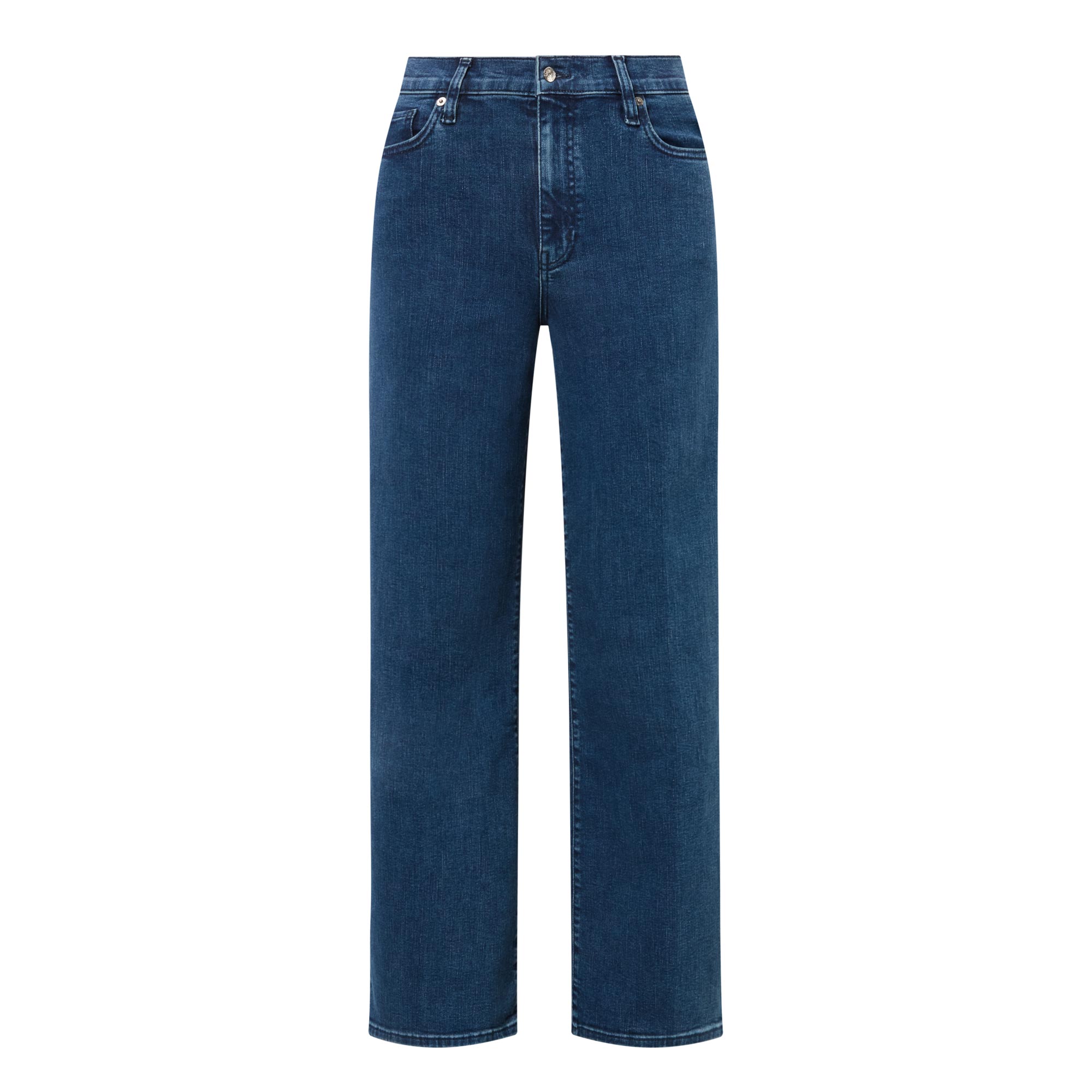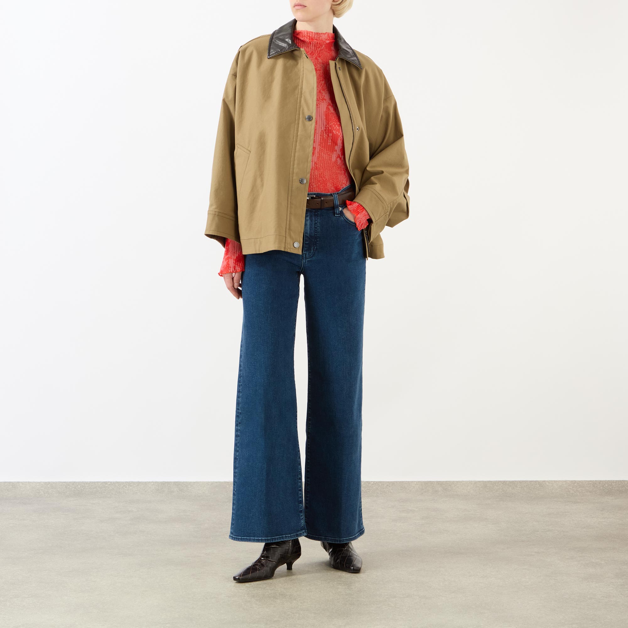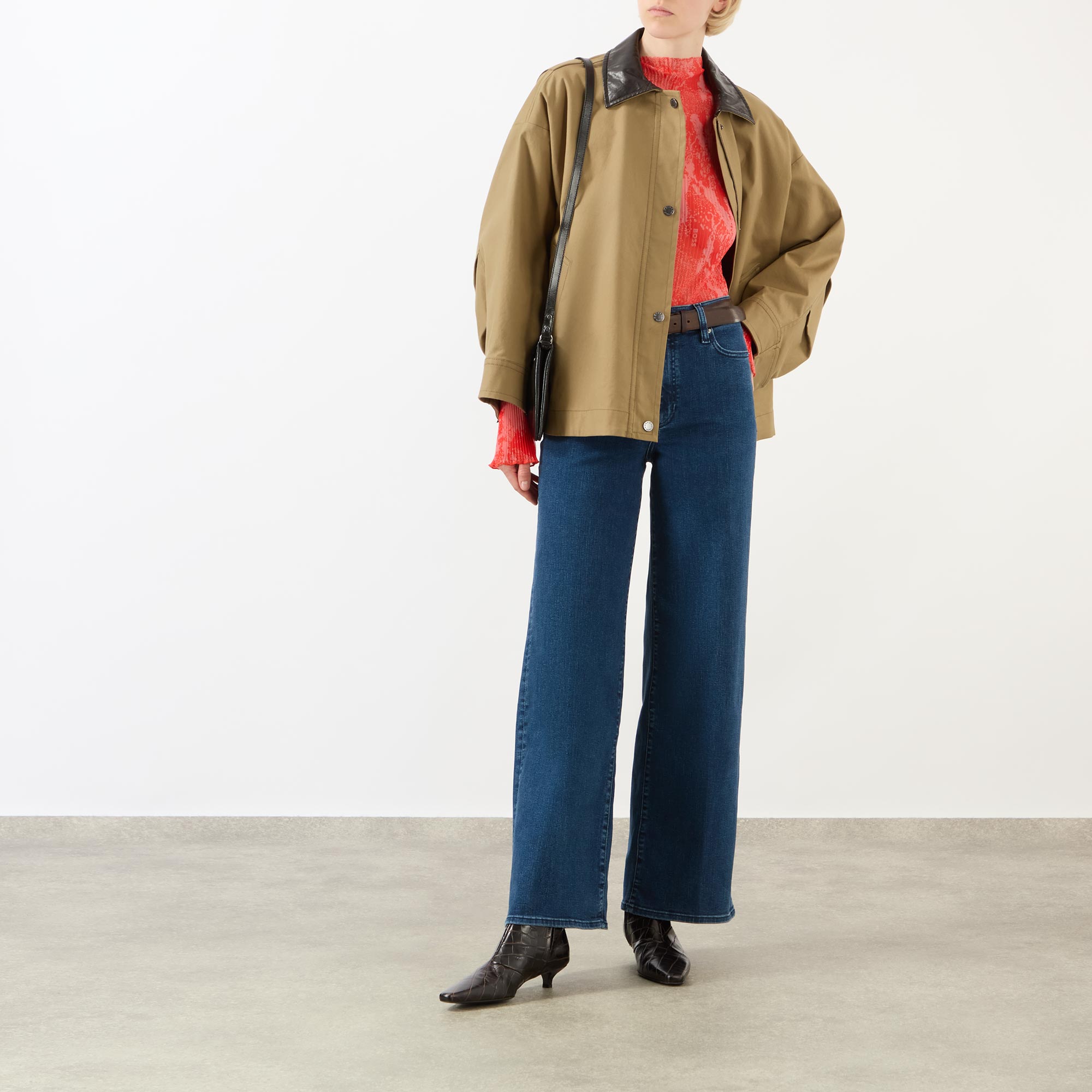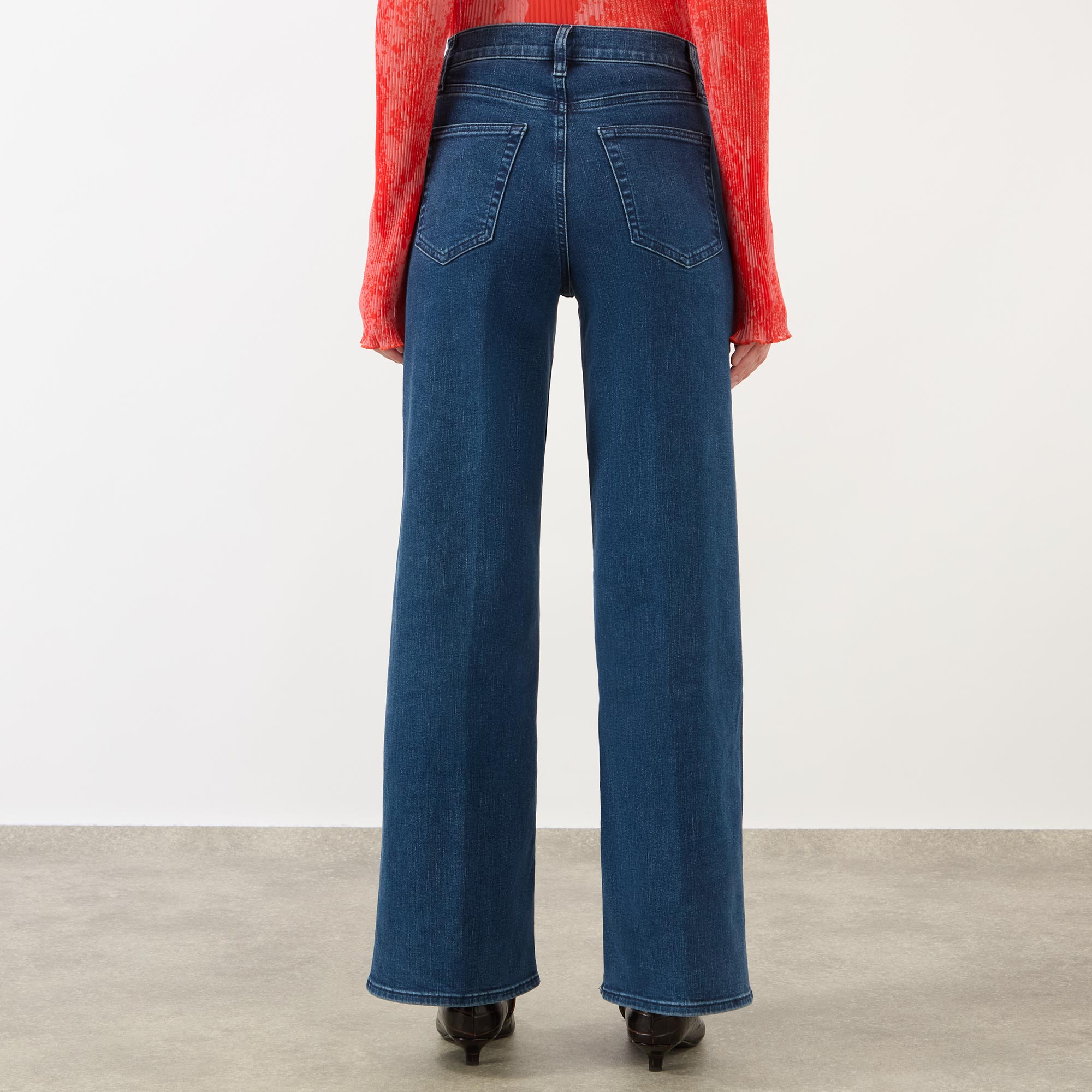 • High rise, wide leg, belt loops, zip-fly and button fastening, five-pocket design, clean hems, tonal stitching, whiskering and faded detailing, dark wash finish, stretch denim