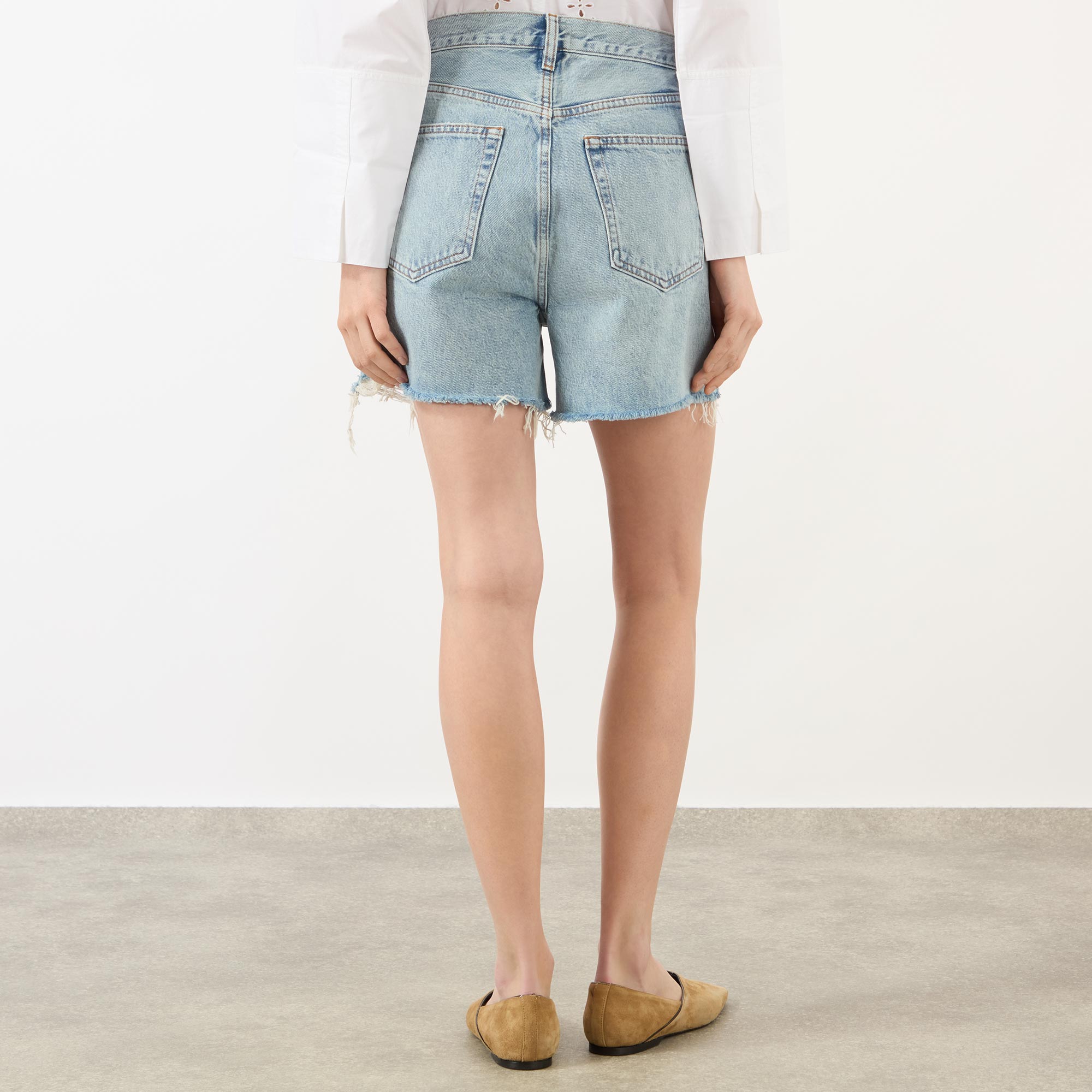 - Mid rise, straight leg, belt loops, concealed fly and button fastening, five pocket styling, frayed hems, tobacco stitching, light wash finish, rigid denim