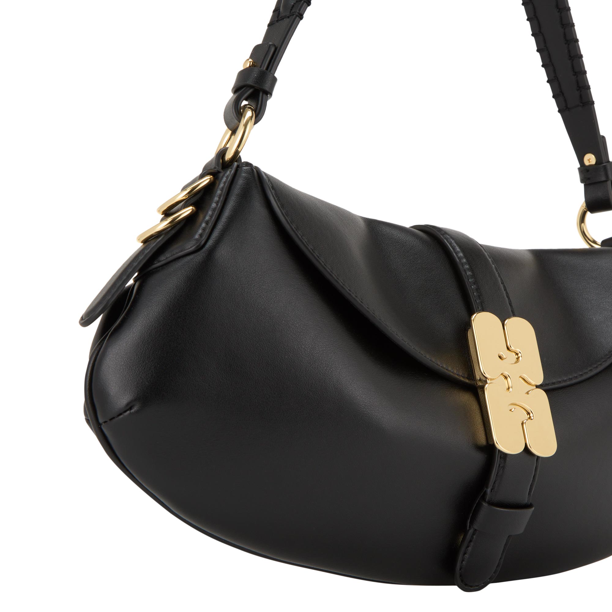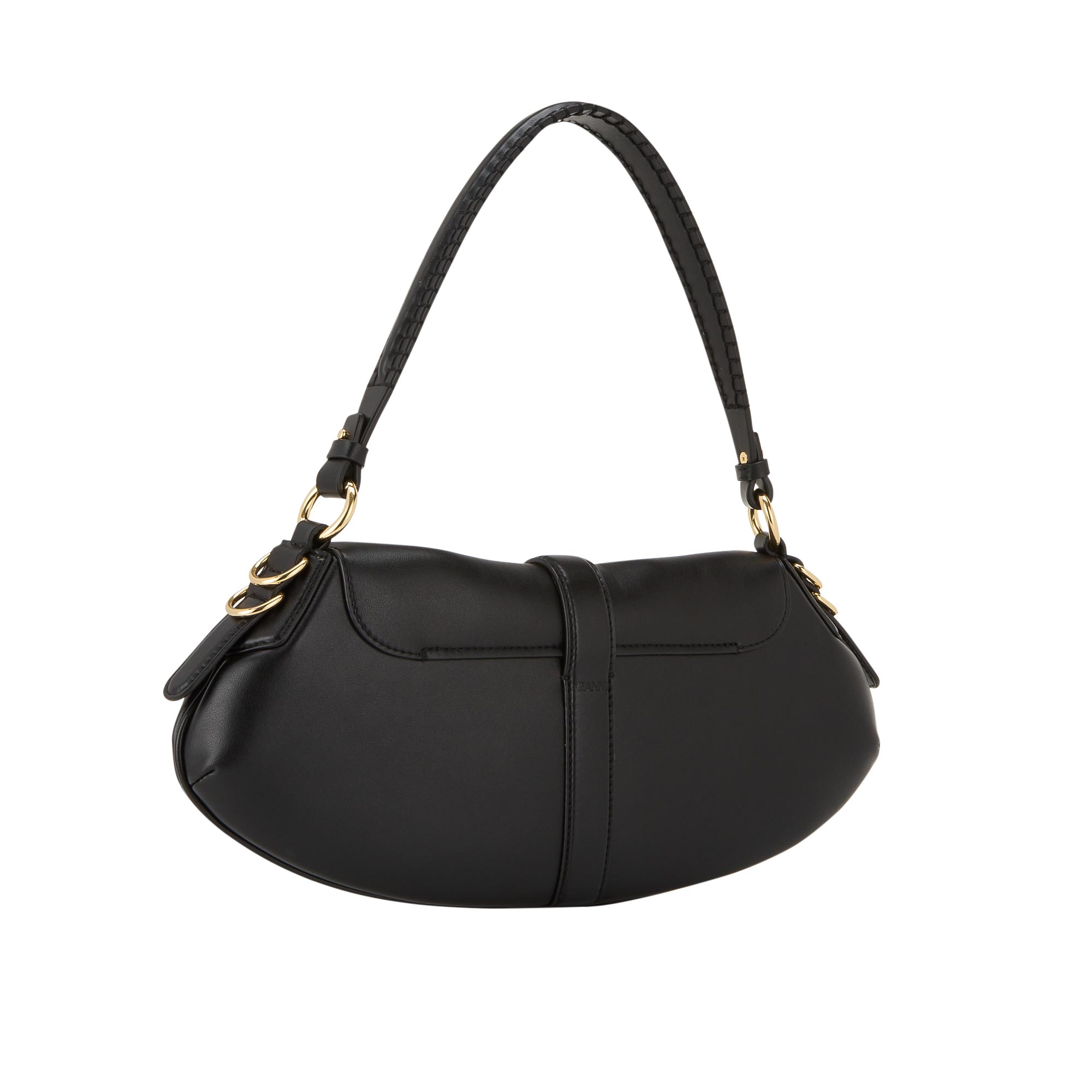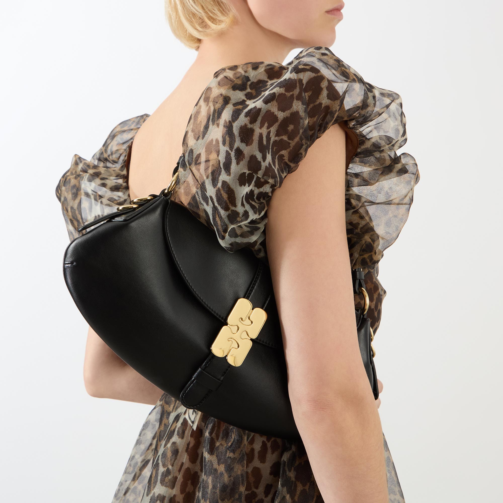 • Fixed shoulder strap, curved silhouette, foldover clasp with gold-tone Butterfly logo, secure snap-button closure, tonal stitching, smooth finish