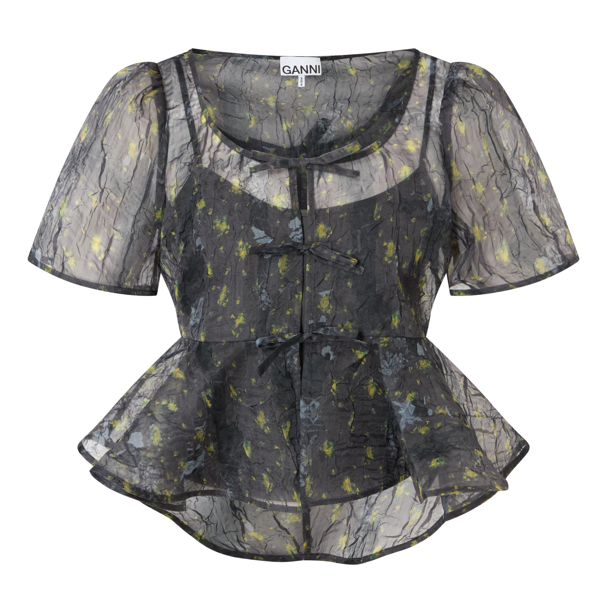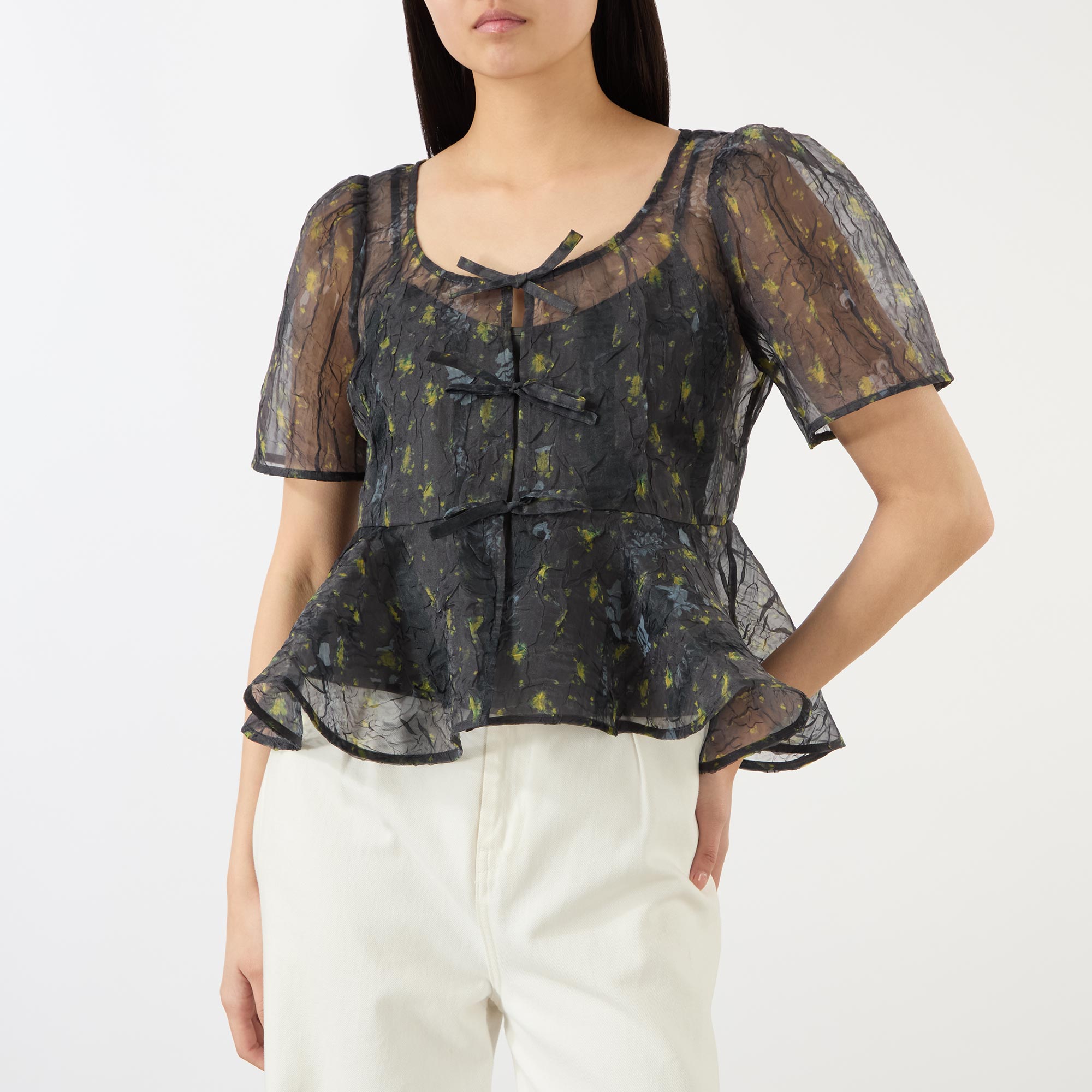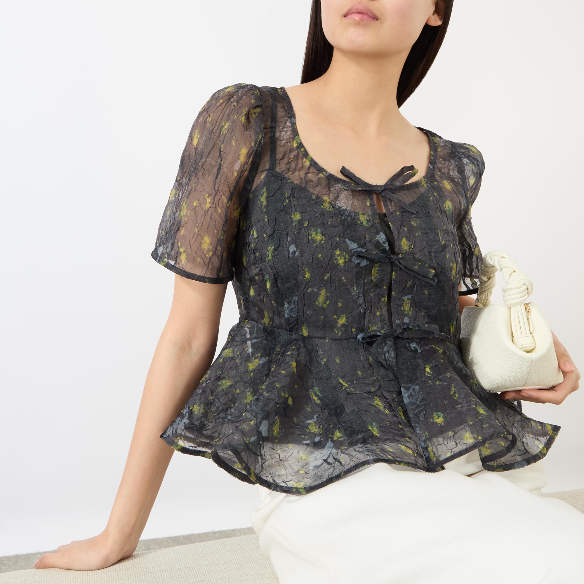 • Scoop neckline, short sleeves, bow detailing along the front, peplum hem, floral print, semi-sheer design