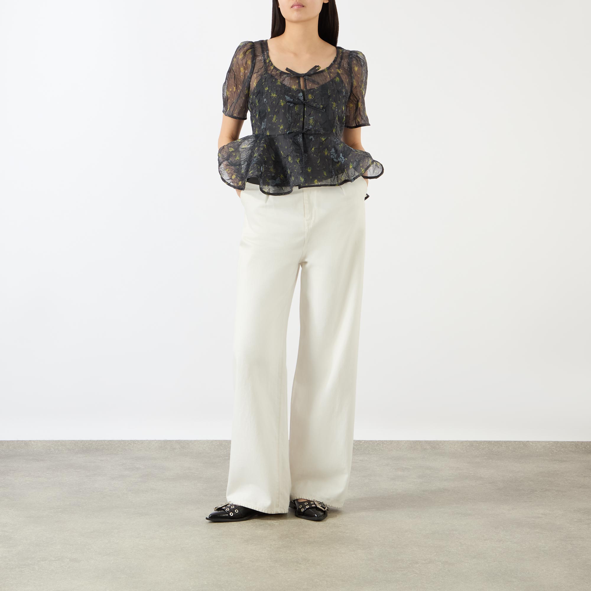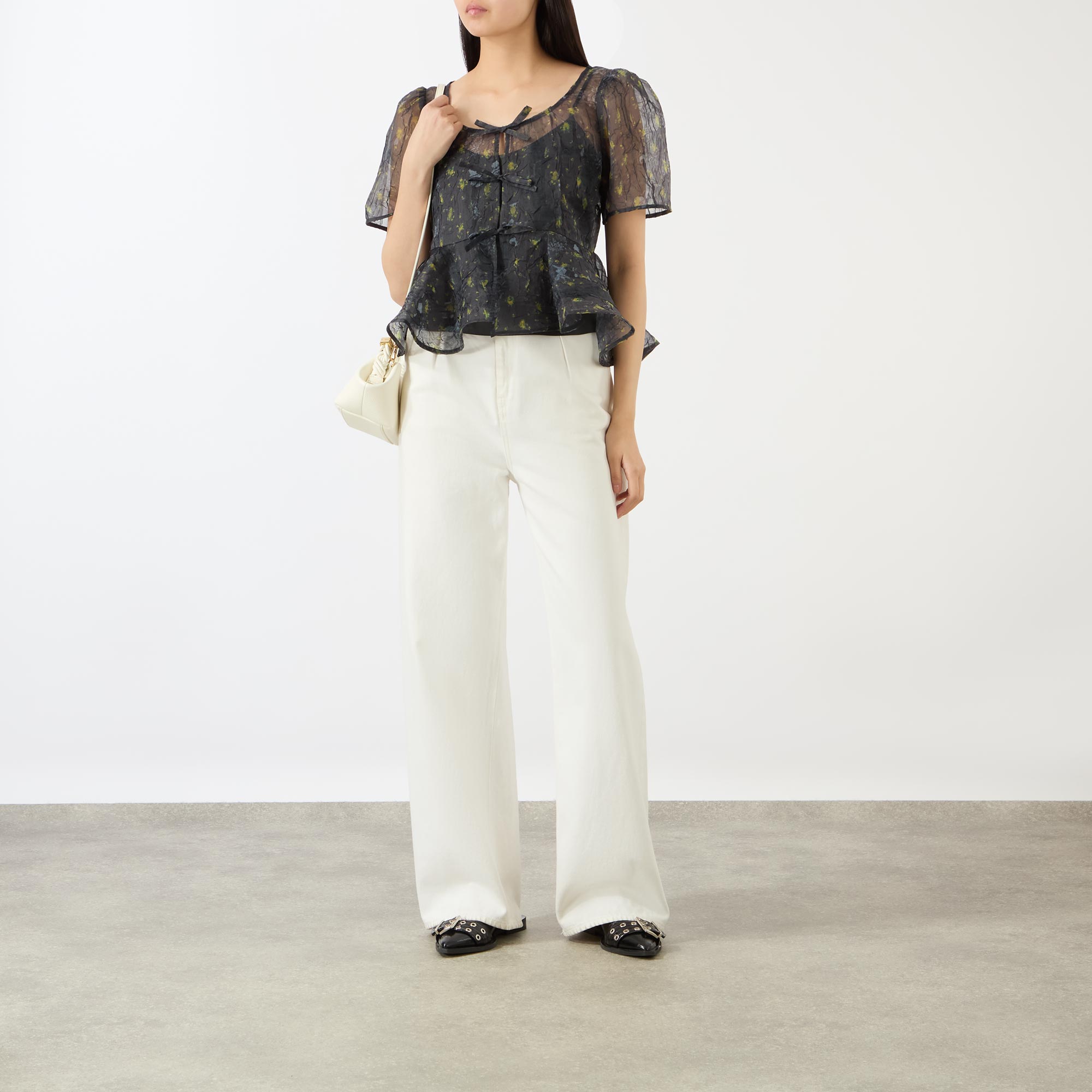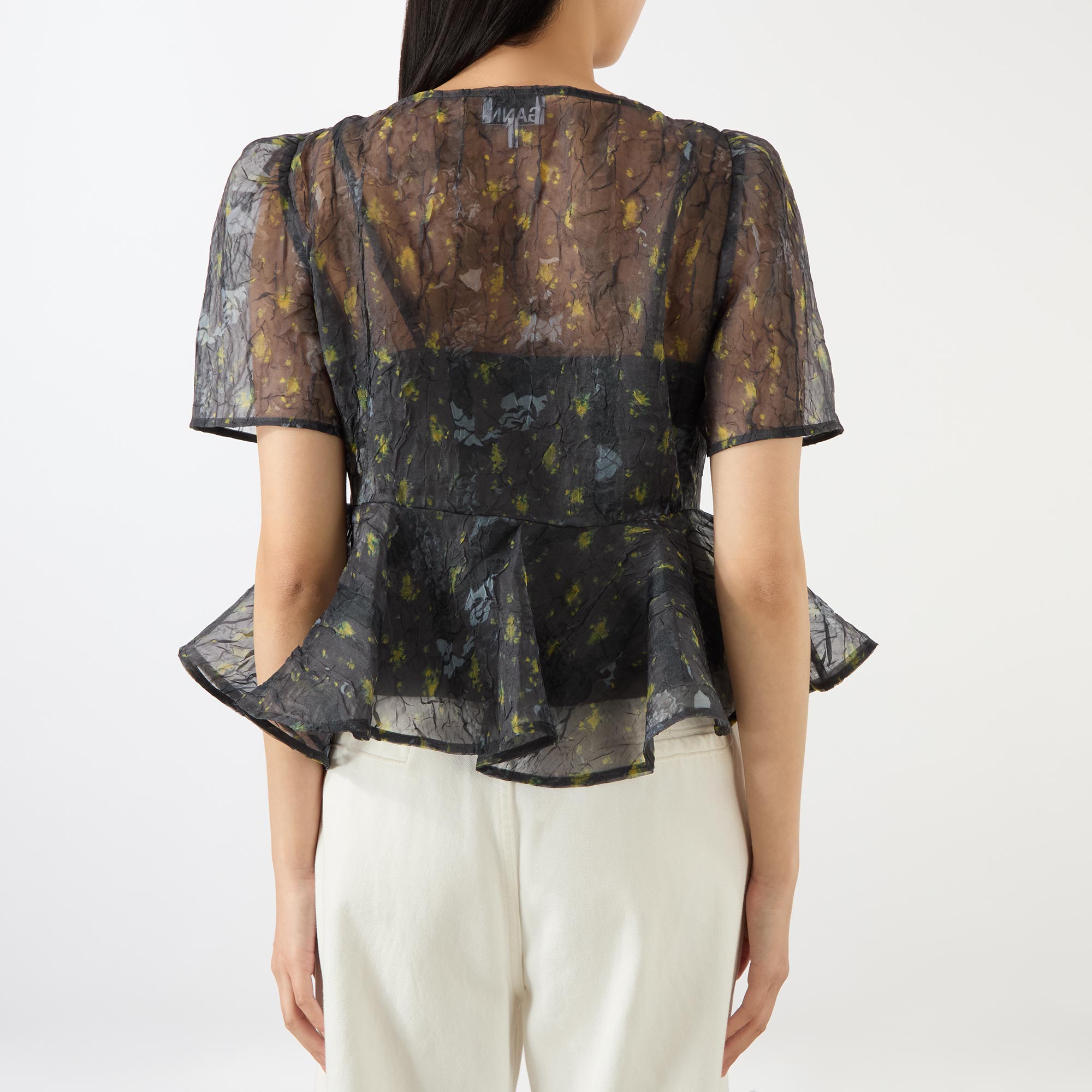 • Scoop neckline, short sleeves, bow detailing along the front, peplum hem, floral print, semi-sheer design