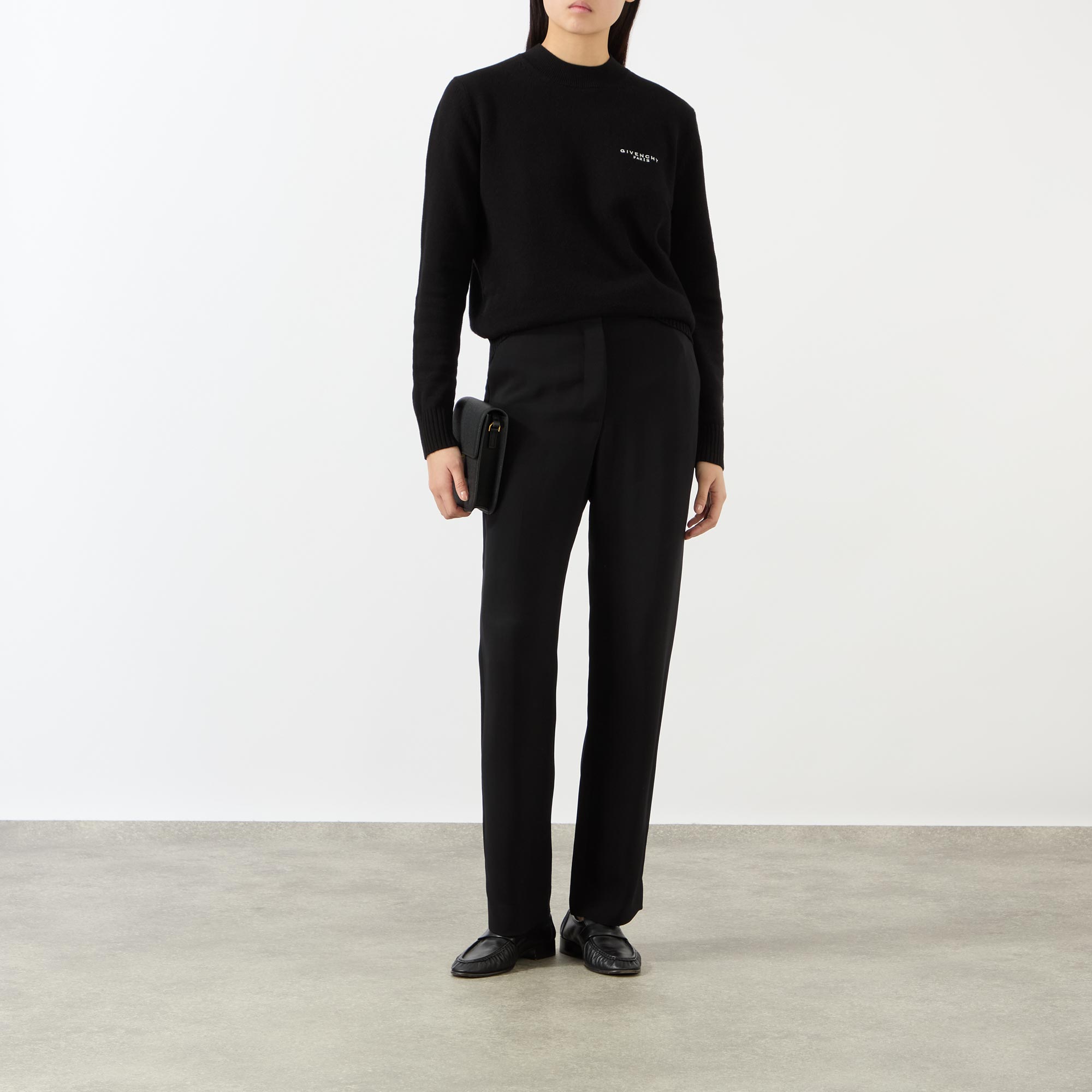 Givenchy’s SS26 collection embodies powerful femininity through sleek, sculpted silhouettes. These trousers, for example, sit high on the waist with a concealed zip-fly and hook-and-bar fastening, falling to a sharp, slim-cut leg with pressed creases and finished with two practical in-seam pockets.