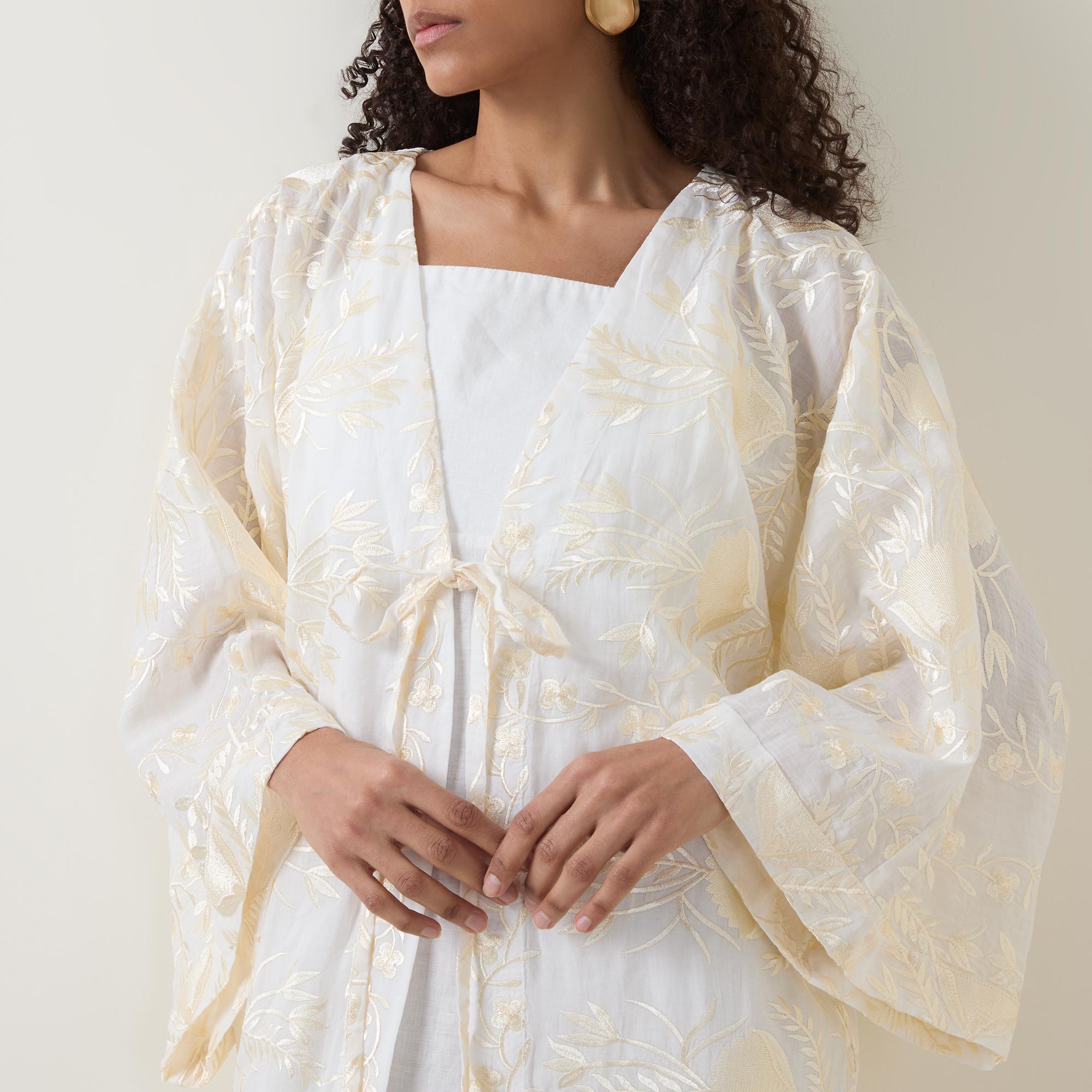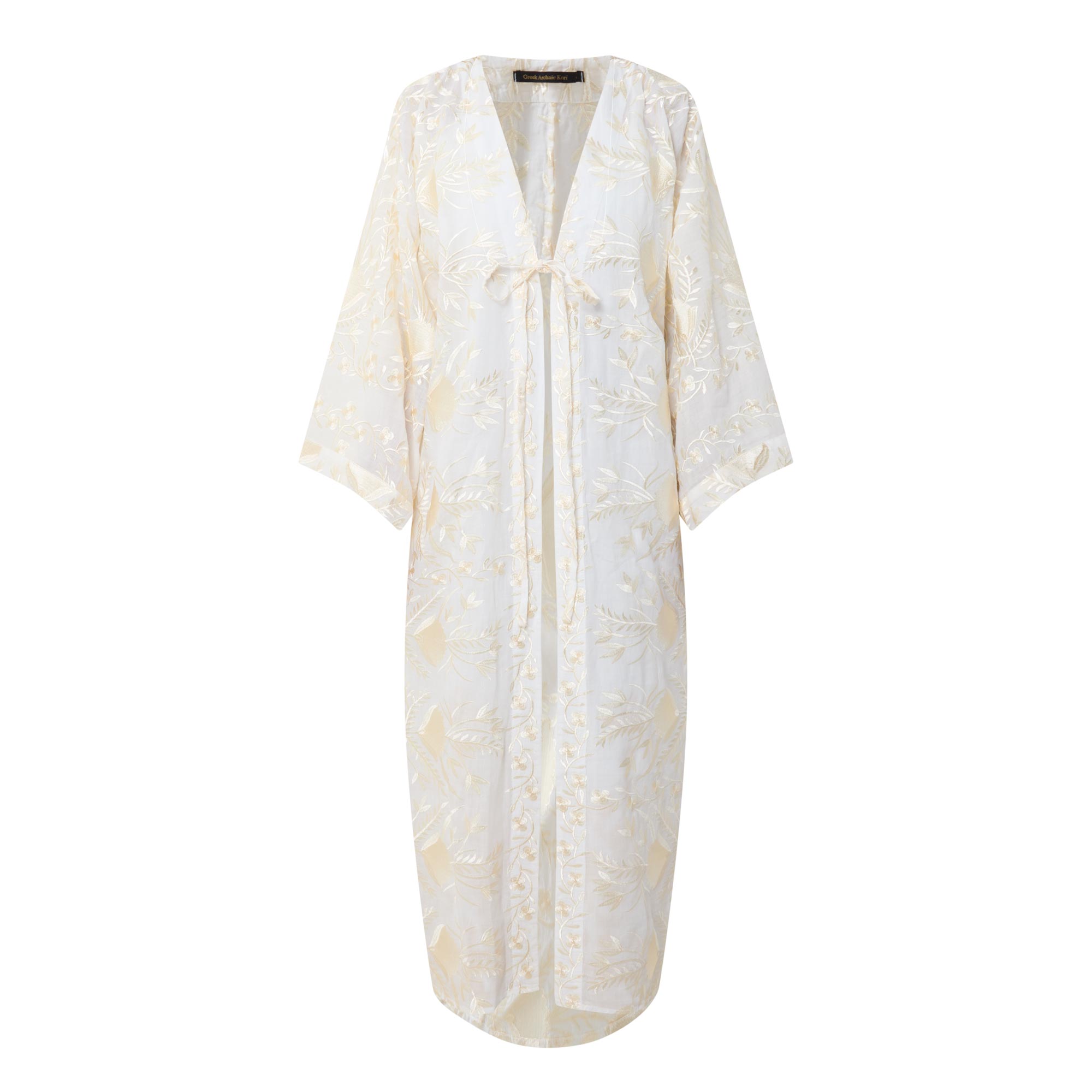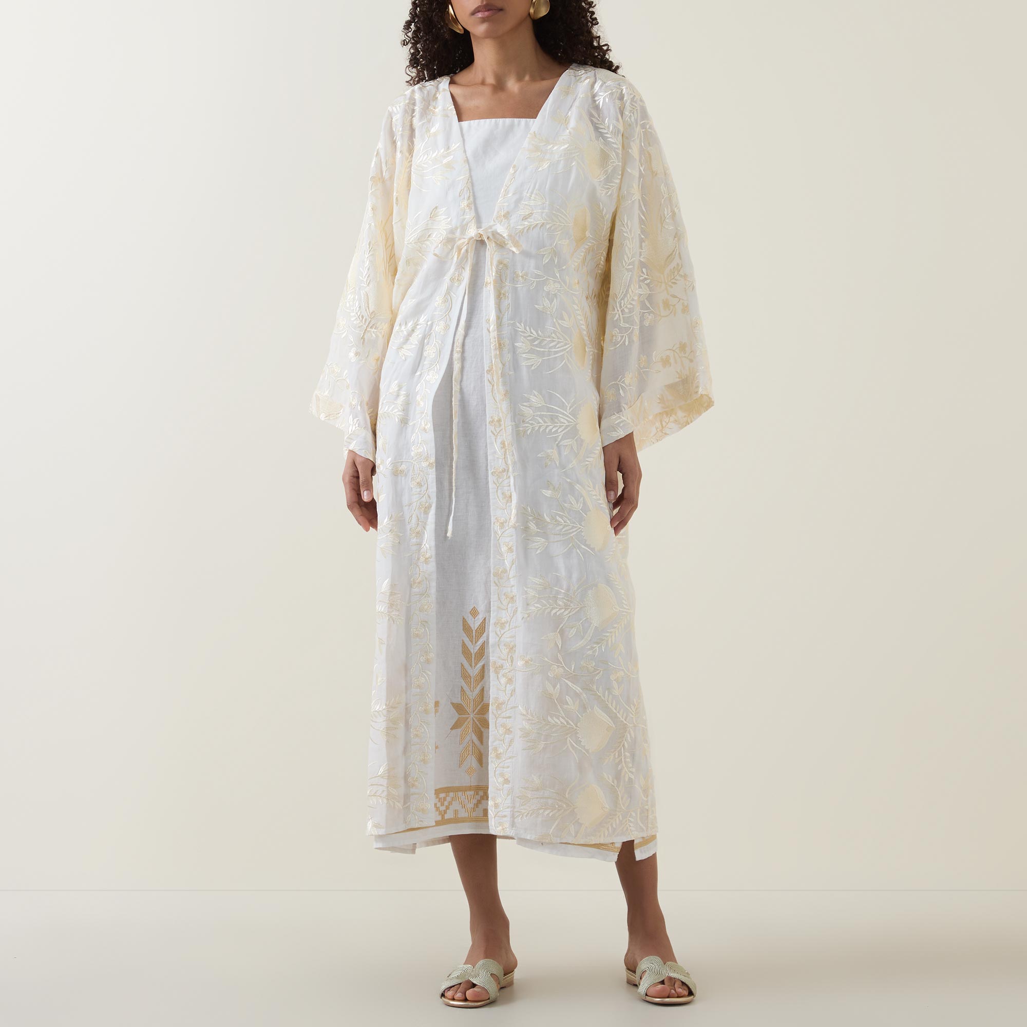 - V-neckline, dropped shoulders, wide kimono sleeves, front tie fastening, straight hem, intricate embroidered detailing, longline design