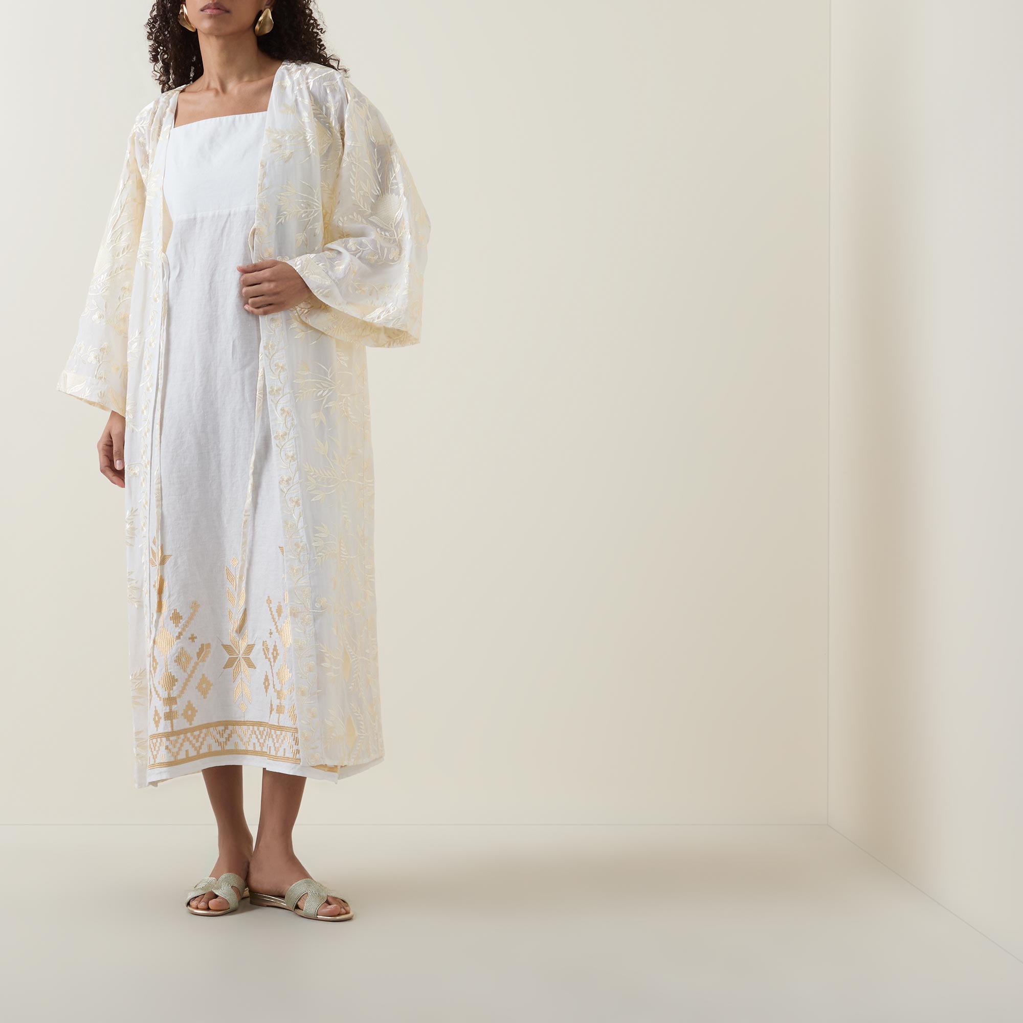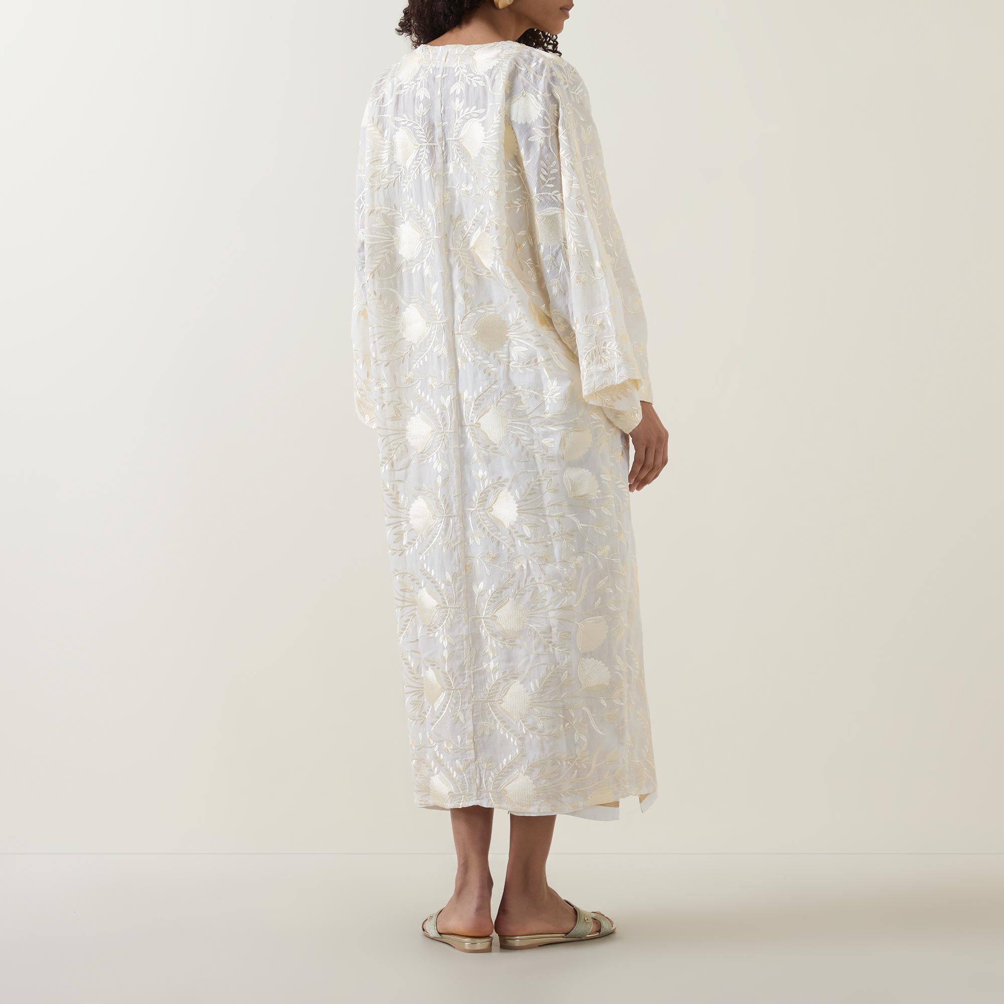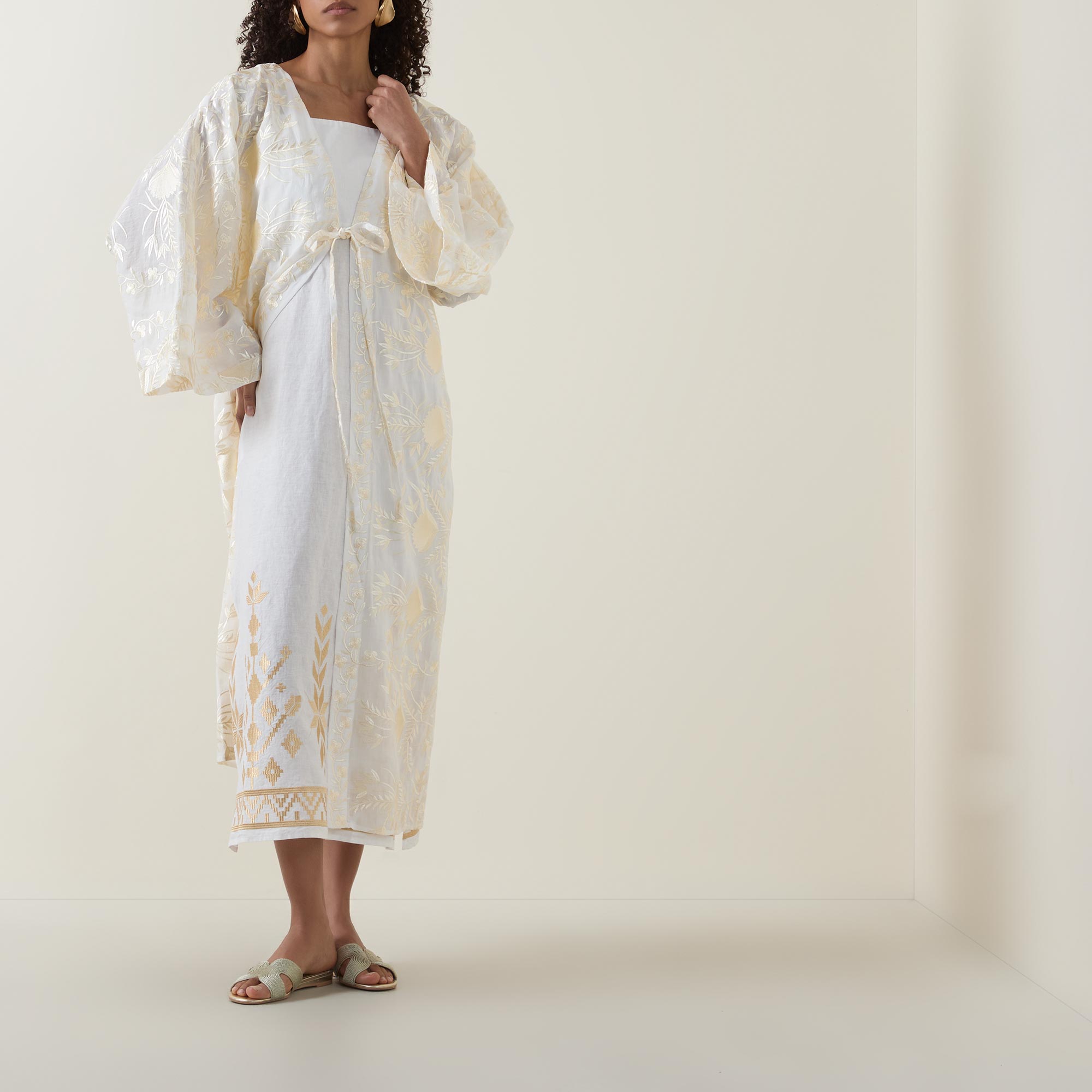 - V-neckline, dropped shoulders, wide kimono sleeves, front tie fastening, straight hem, intricate embroidered detailing, longline design
