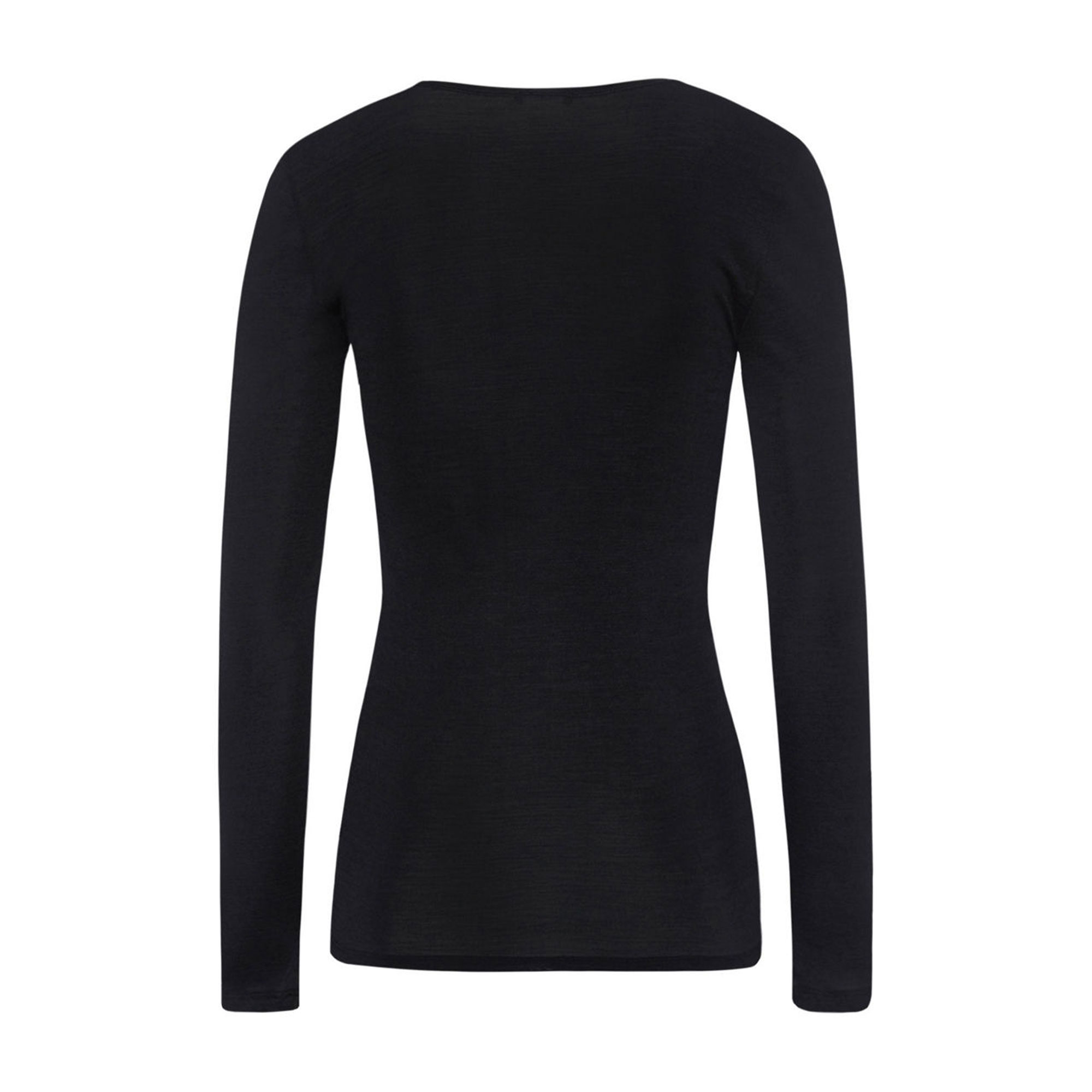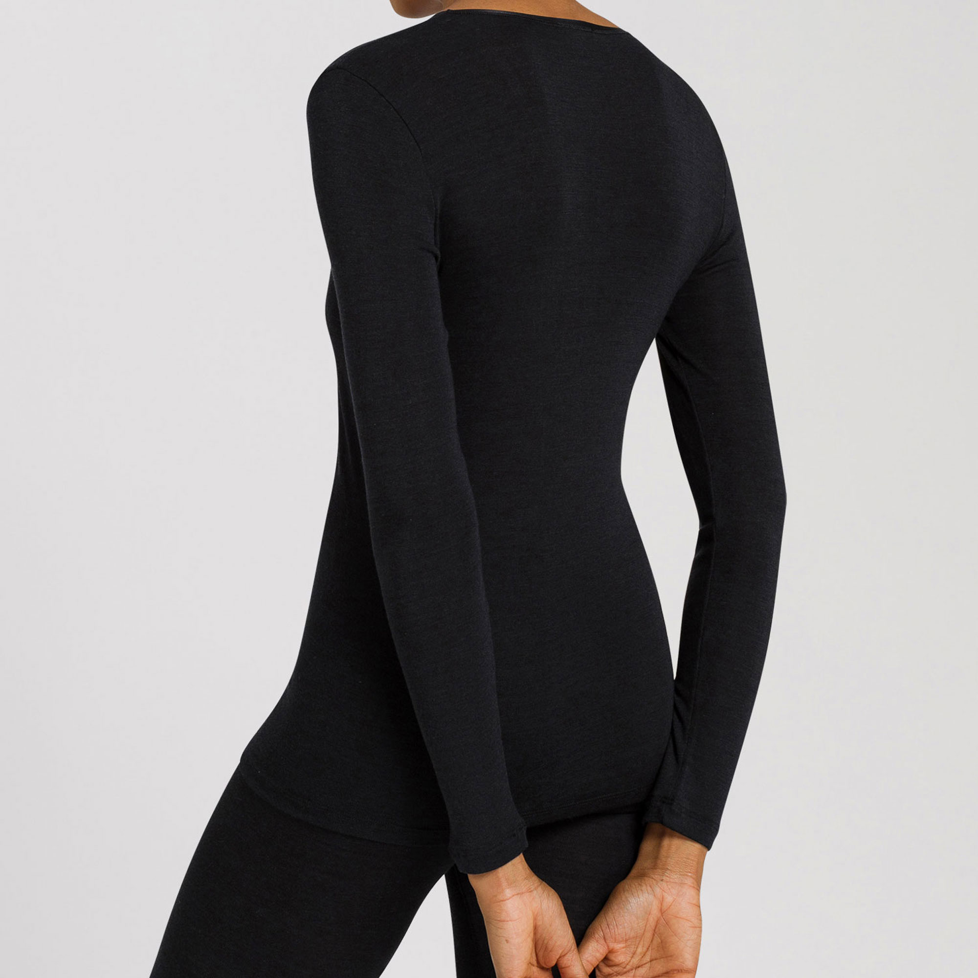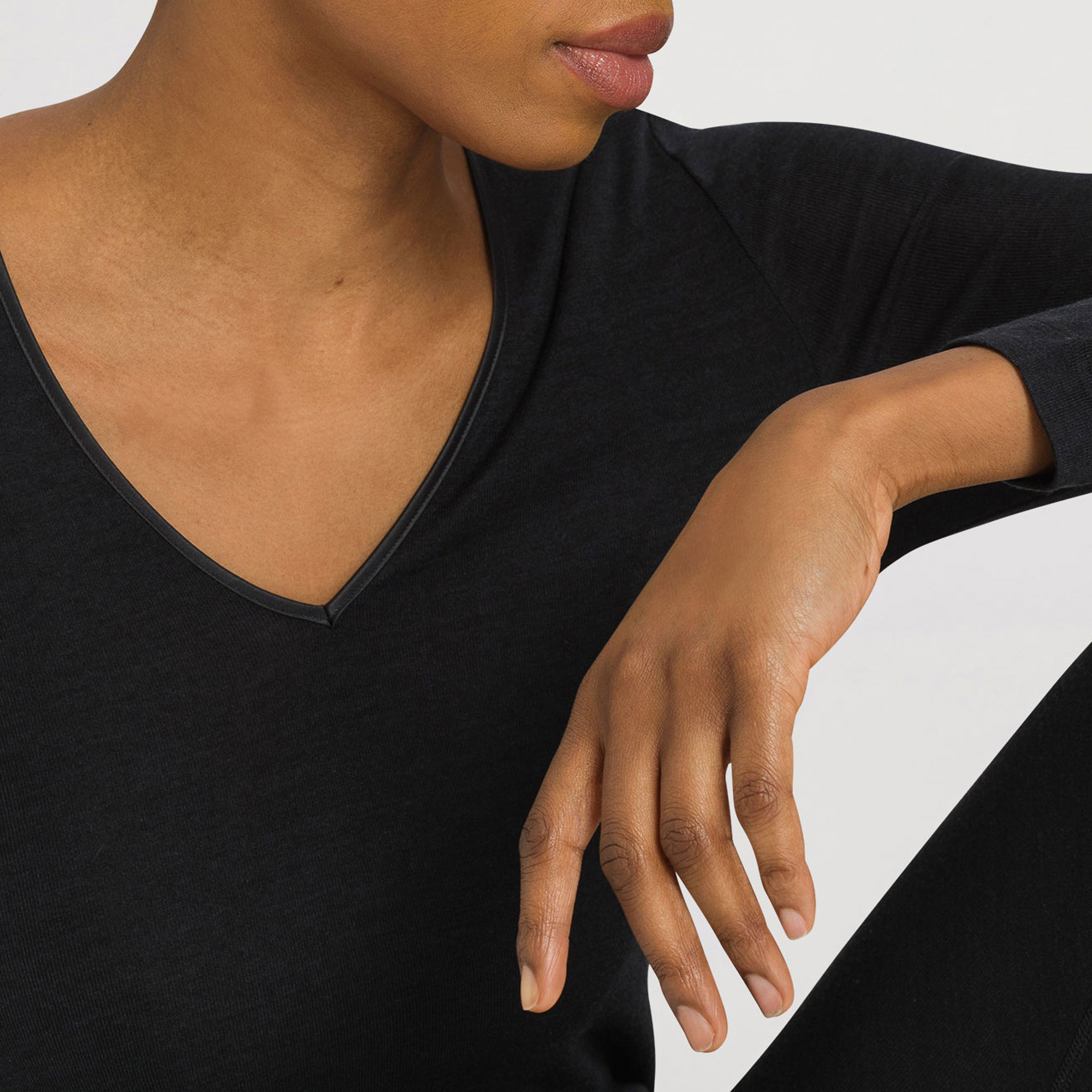 • Long sleeves, V-neckline, satin edging, tonal stitching, smooth fabric