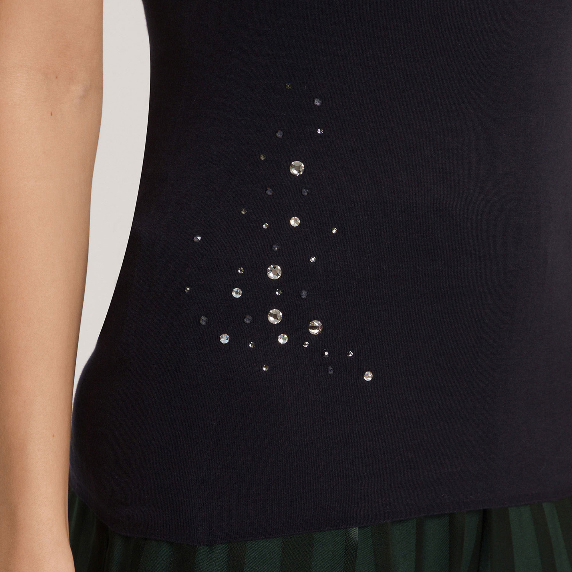 - Thin adjustable spaghetti straps, V-neckline, sleeveless, Swarovski crystals, satin finishes
