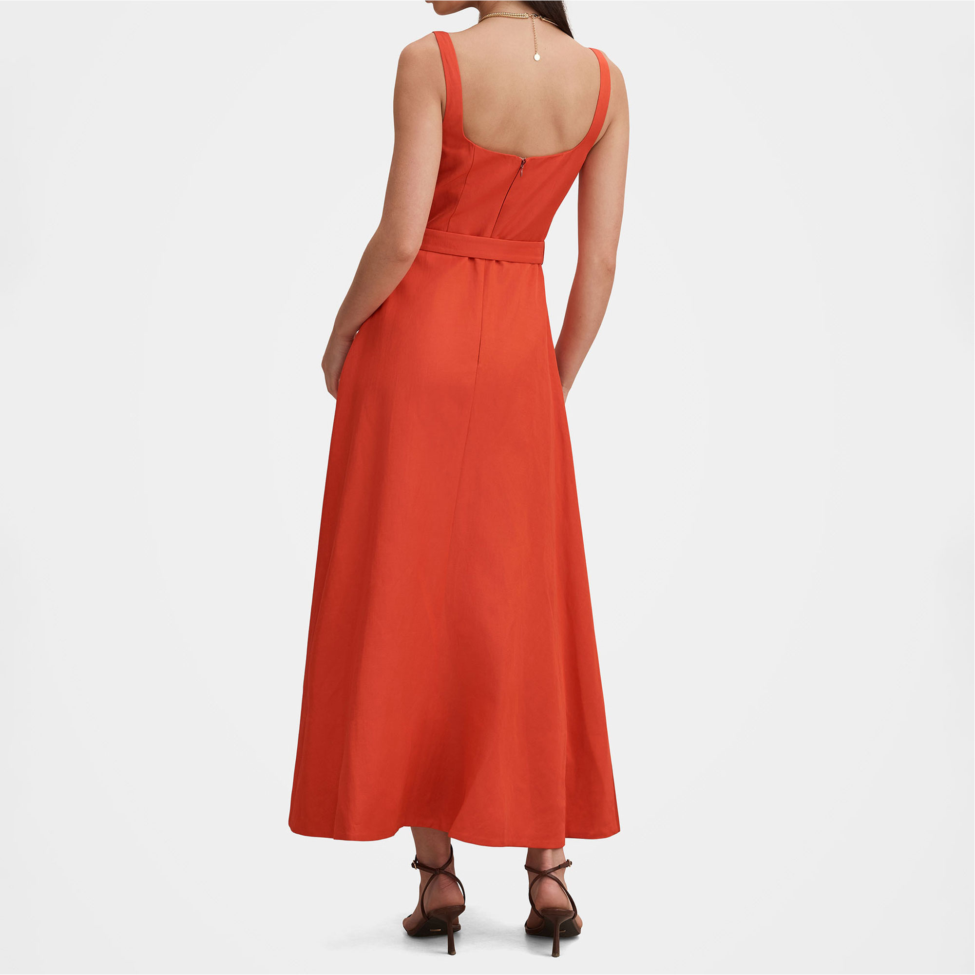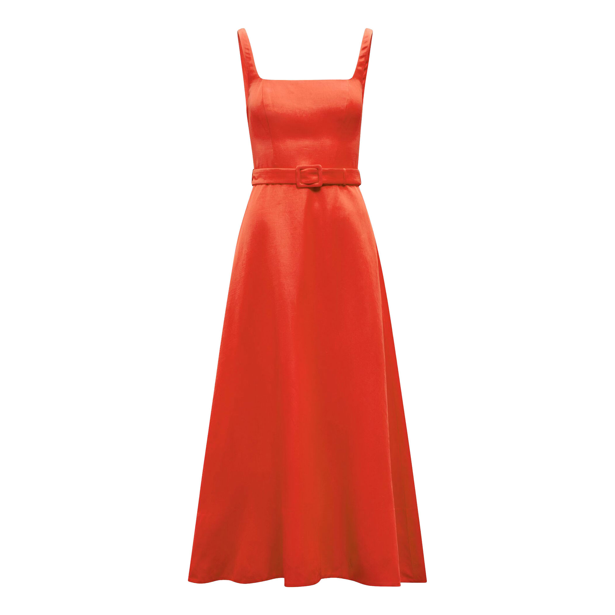 • Regular fit, square neckline into open back, princess seams through the bodice, belted waist with fabric buckle detail, A-line skirt silhouette, concealed zip fastening at rear, lined