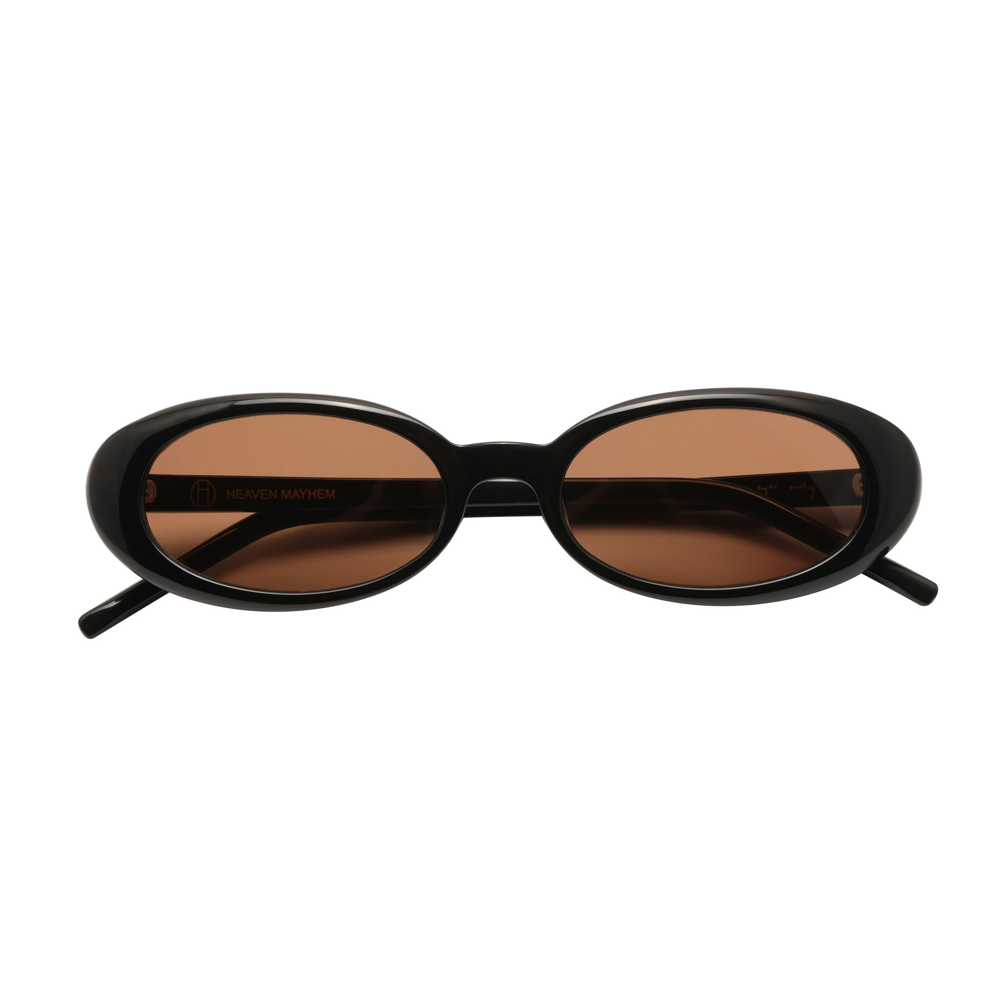 - Oval frame, sleek 90s-inspired shape, brown-tinted lenses, minimalist proportions, solid finish