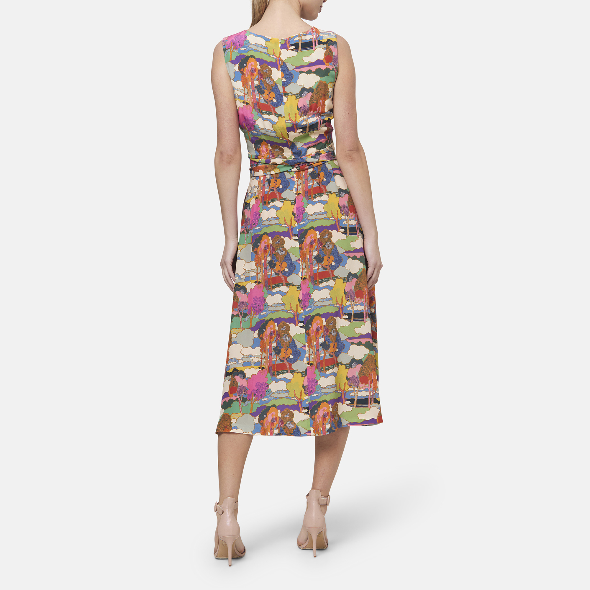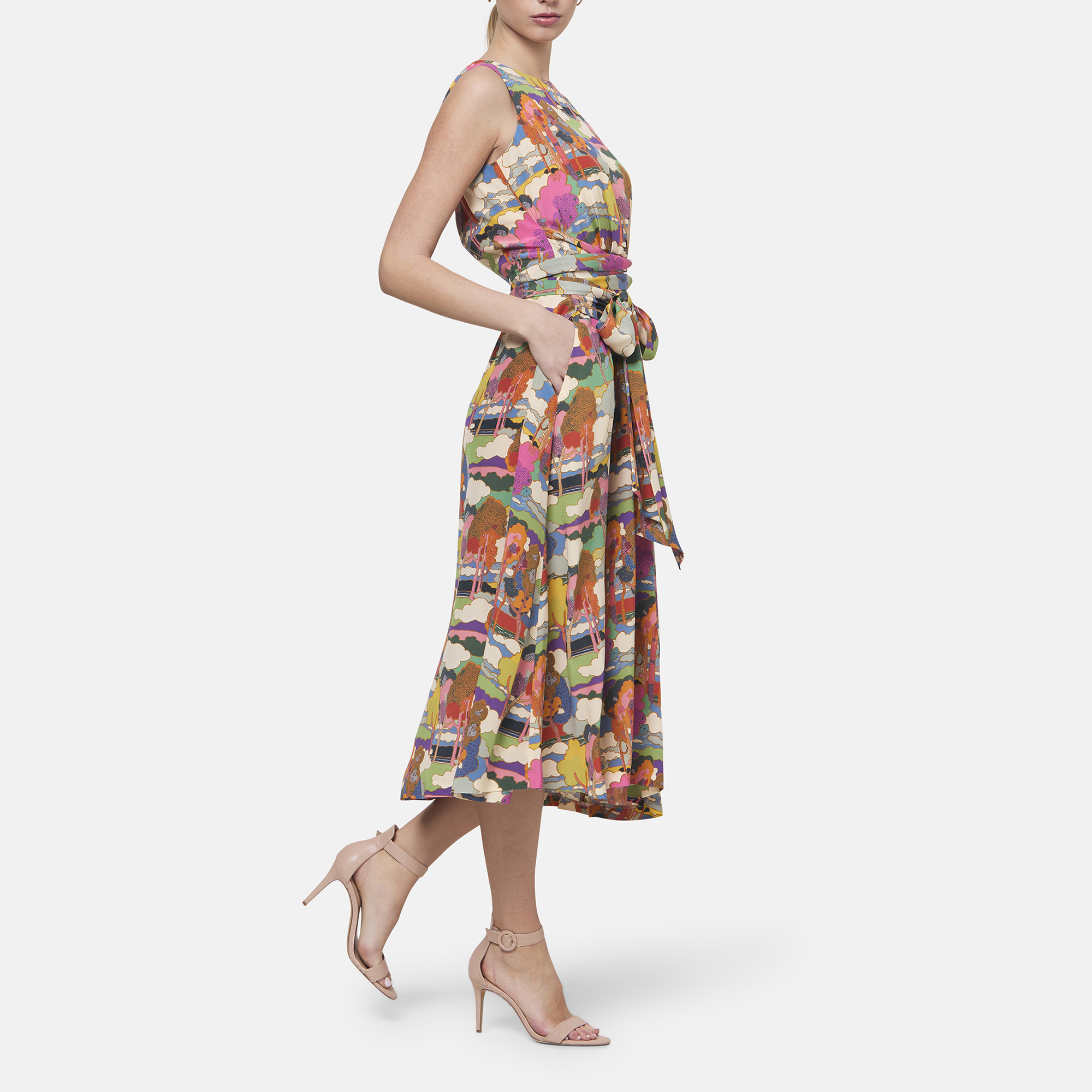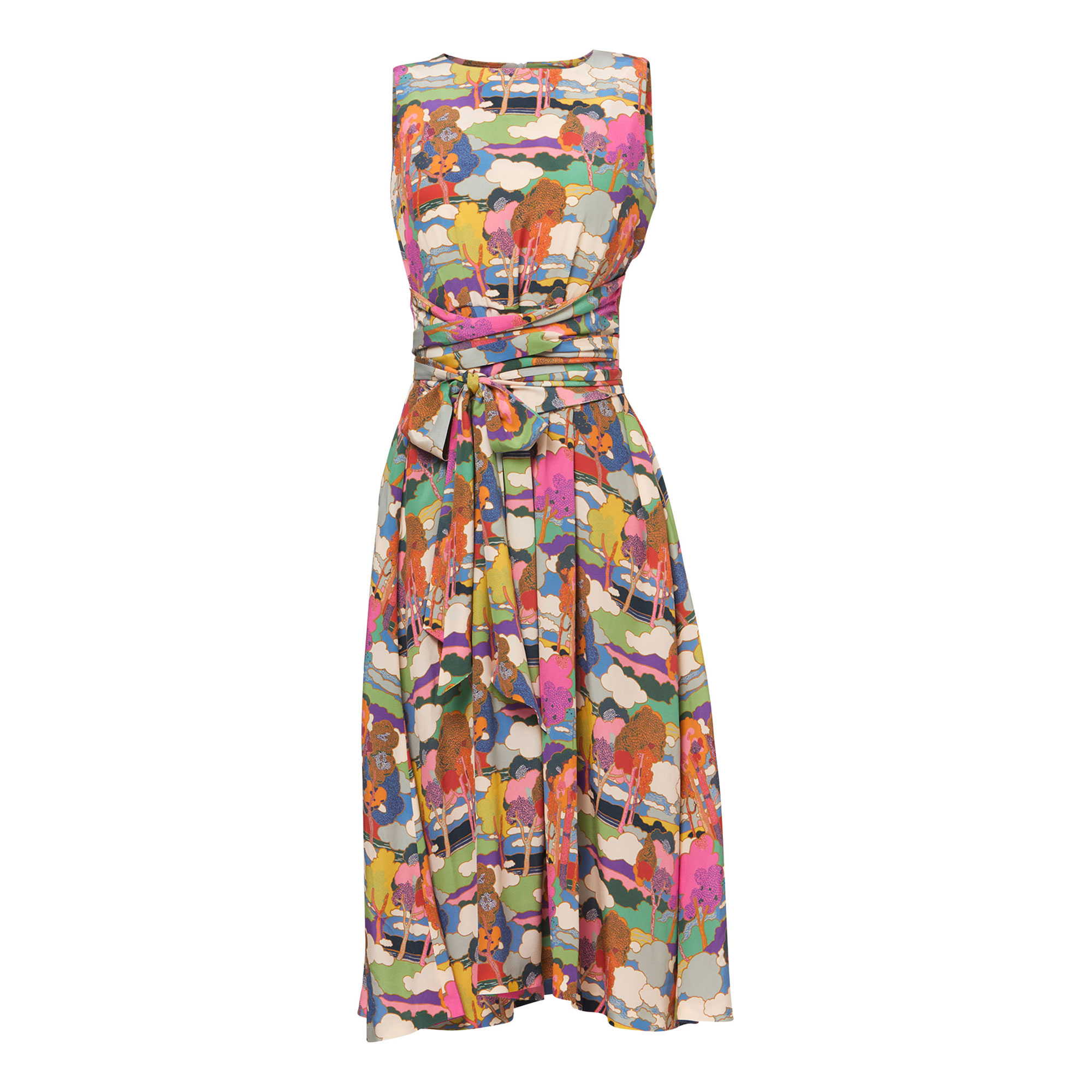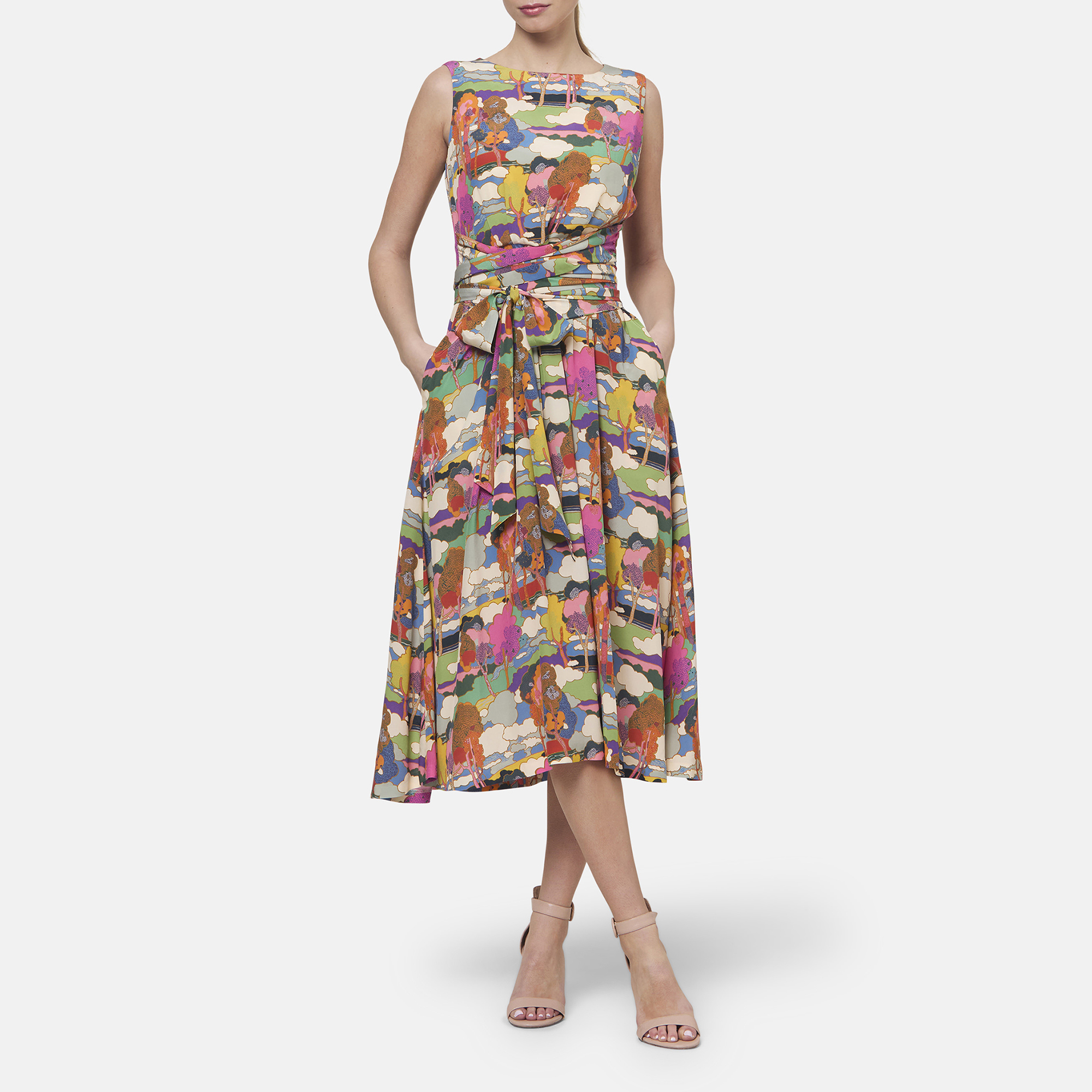 - Round neck, sleeveless design, flattering empire line silhouette, adjustable self-tie waist, fluid hem, painterly Prospect Road print, midi length