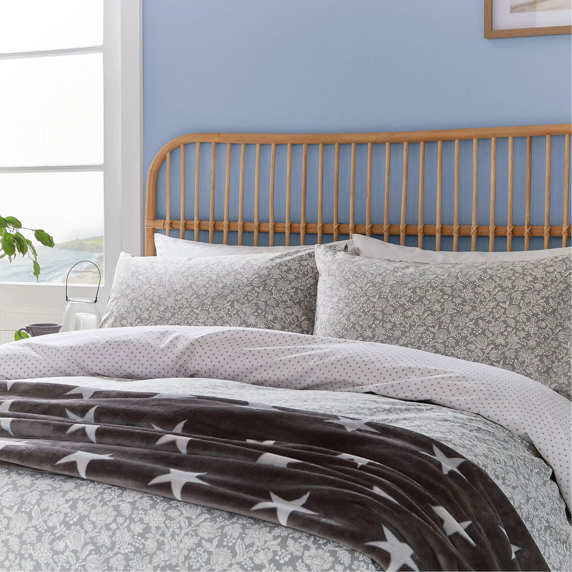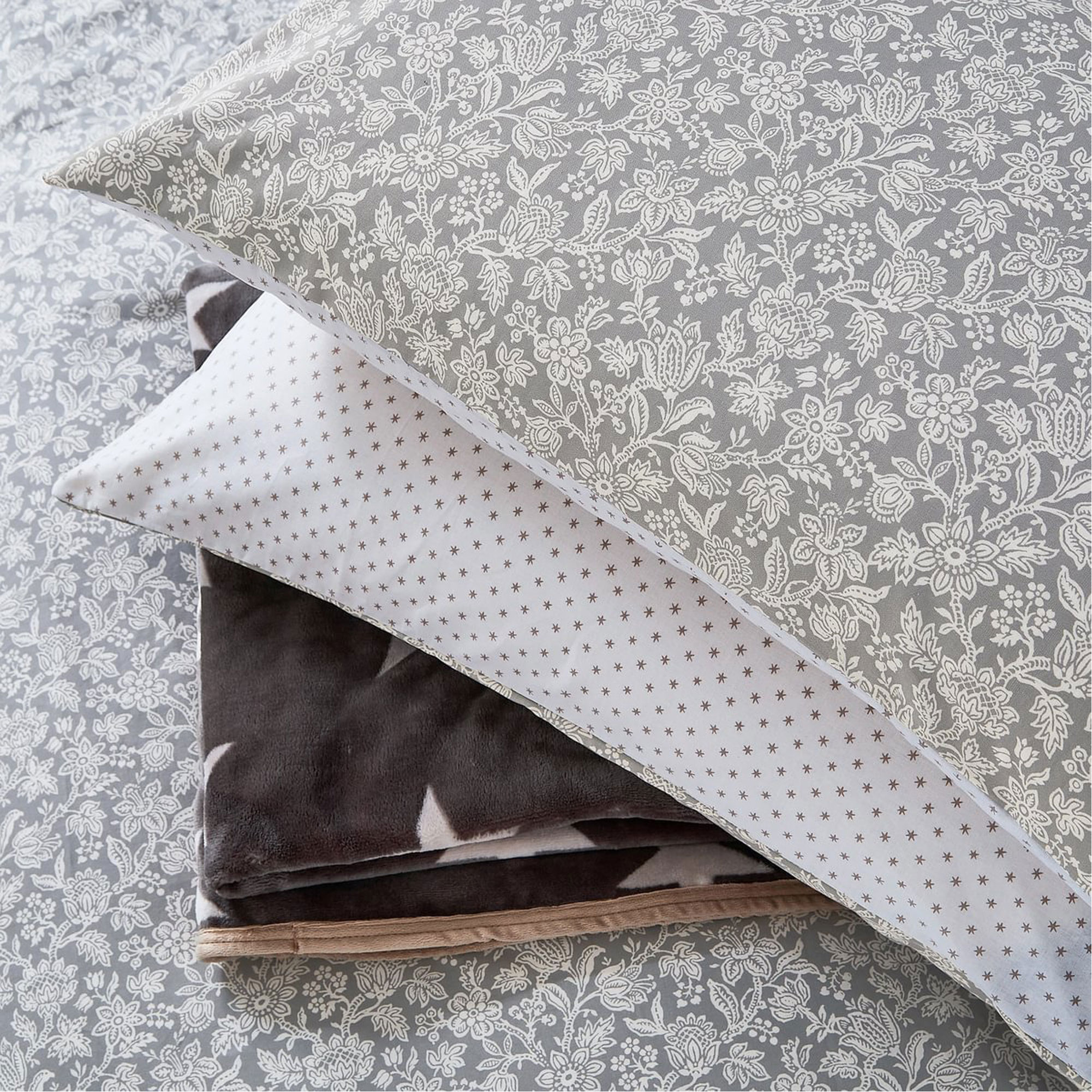 Offering a contemporary update for your bedroom, Elmont features a quaint floral pattern accented against a soft grey ground. The reverse is scattered with a multitude of tiny stars. Cooler nights offer the perfect opportunity to layer on the star fleece throw and snuggle up.