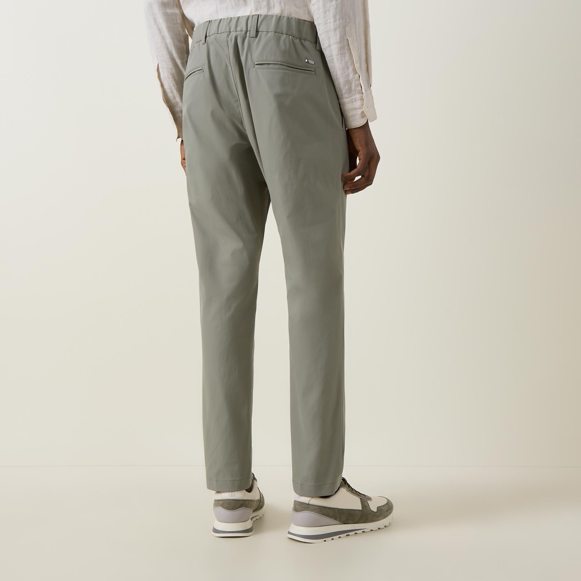 - Zip-fly and button fastening, belt loops, elasticated back panel, two side in-seam pockets, two rear welt pockets, tonal stitching, rear logo detail, mid-rise, straight-cut leg, smooth fabric