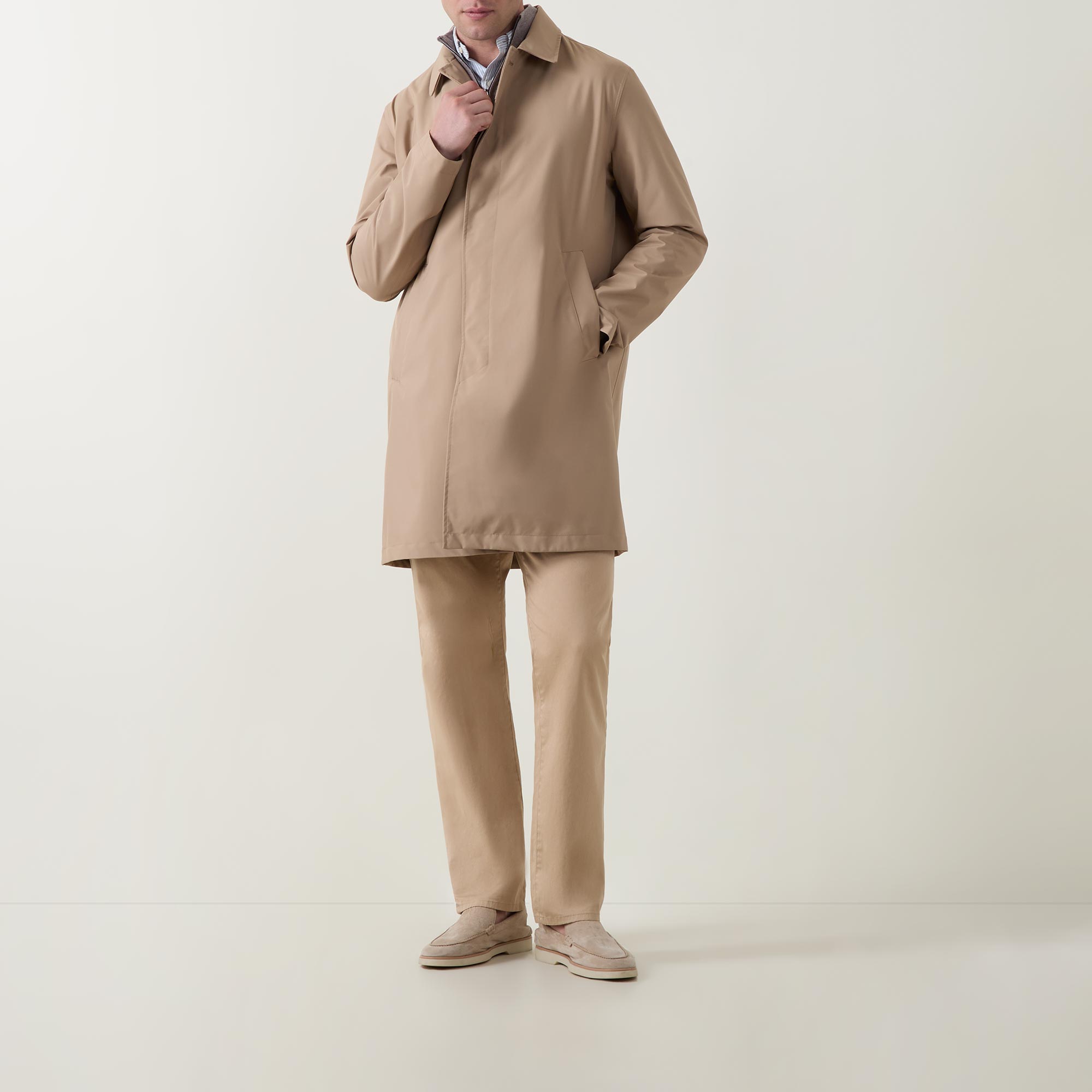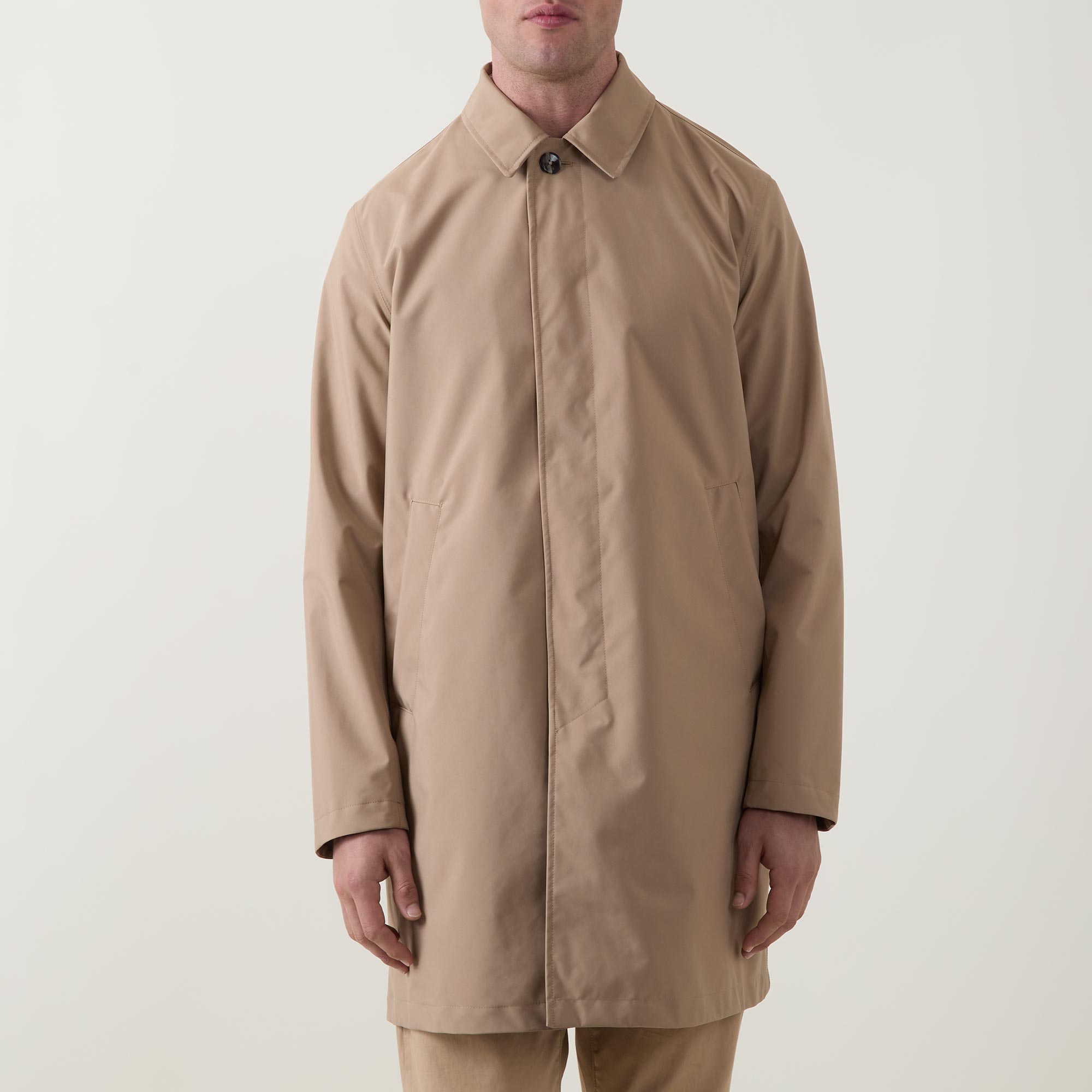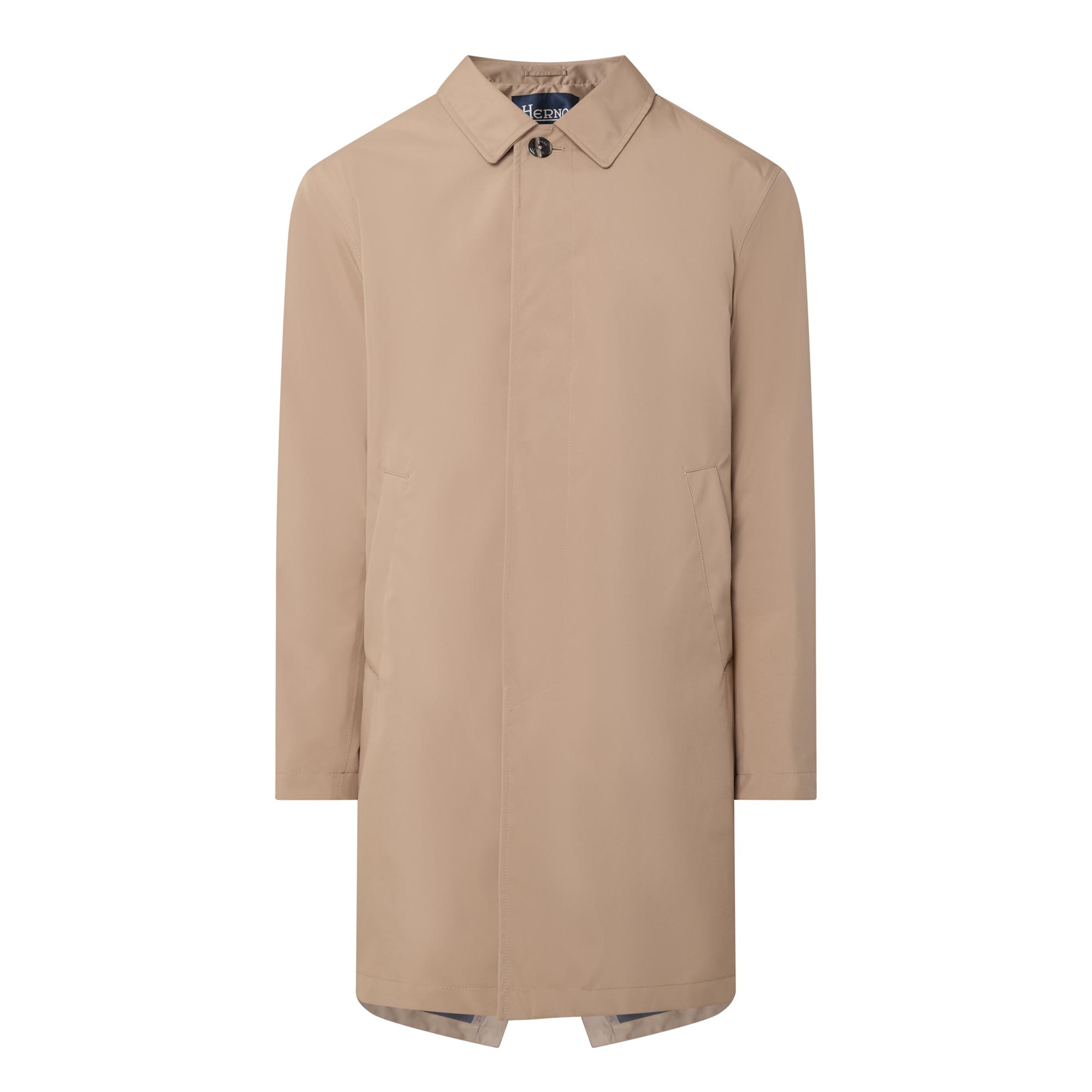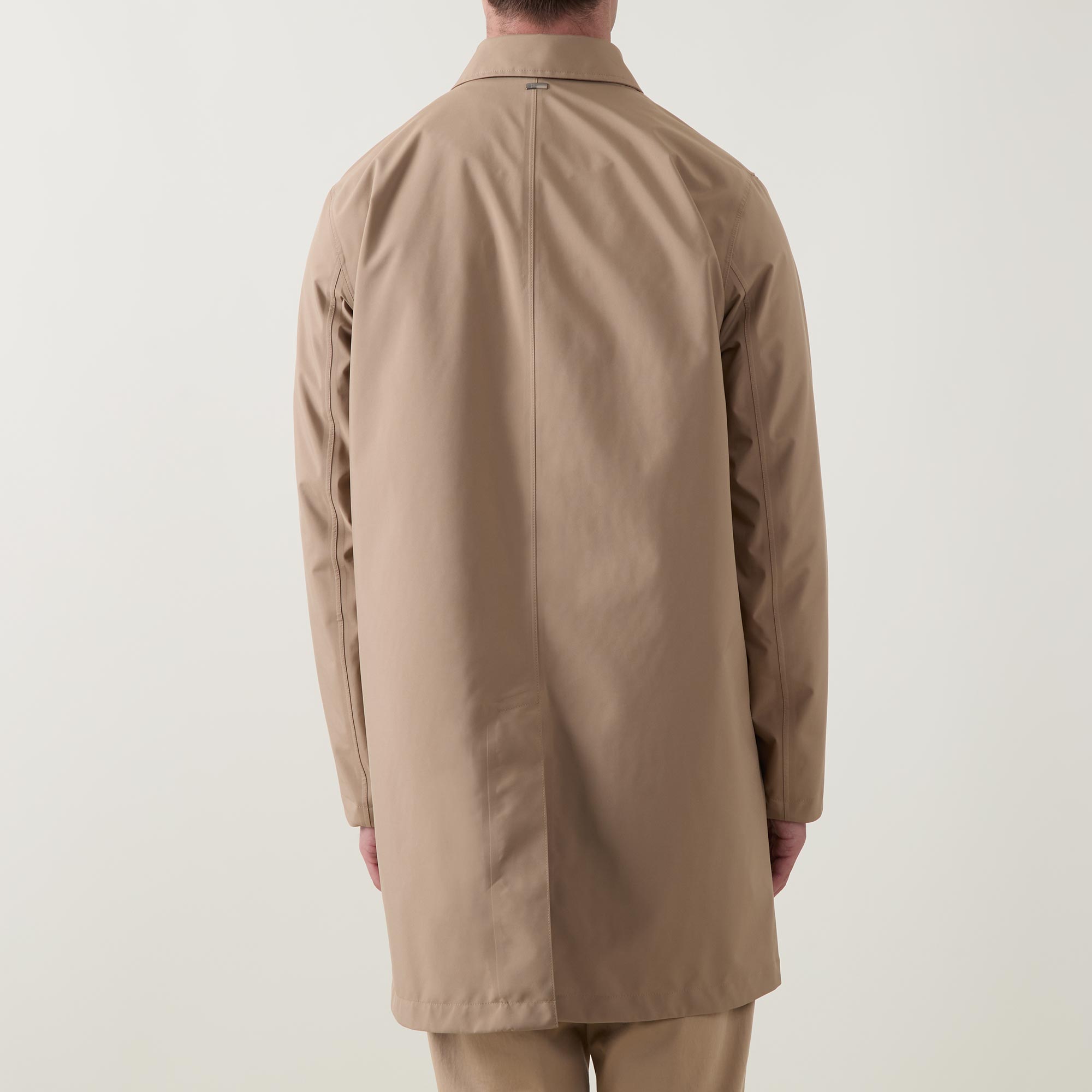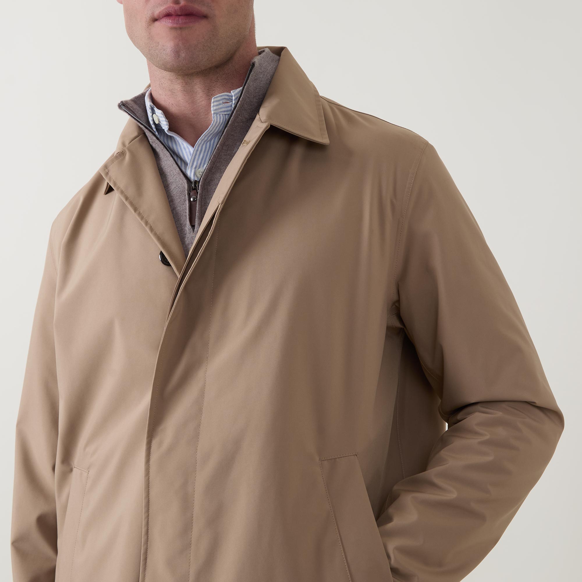 • Collared neckline, concealed zip fastening with visible top button, long sleeves, side entry pockets, vent to the rear, logo plate, unlined, heat-taped seams, ultra-matt appearance, water-proof finish