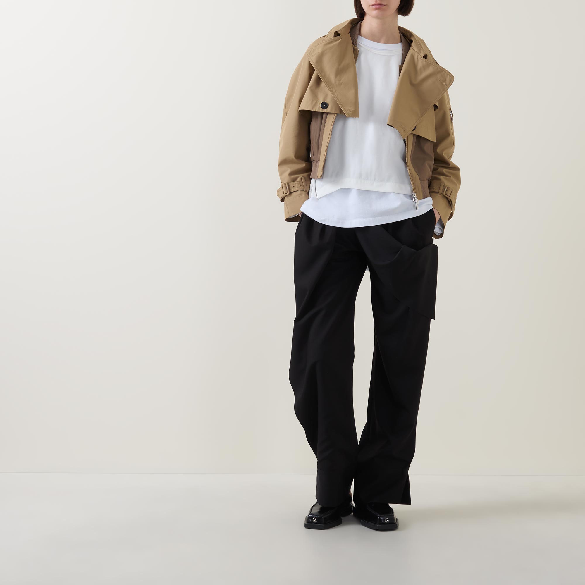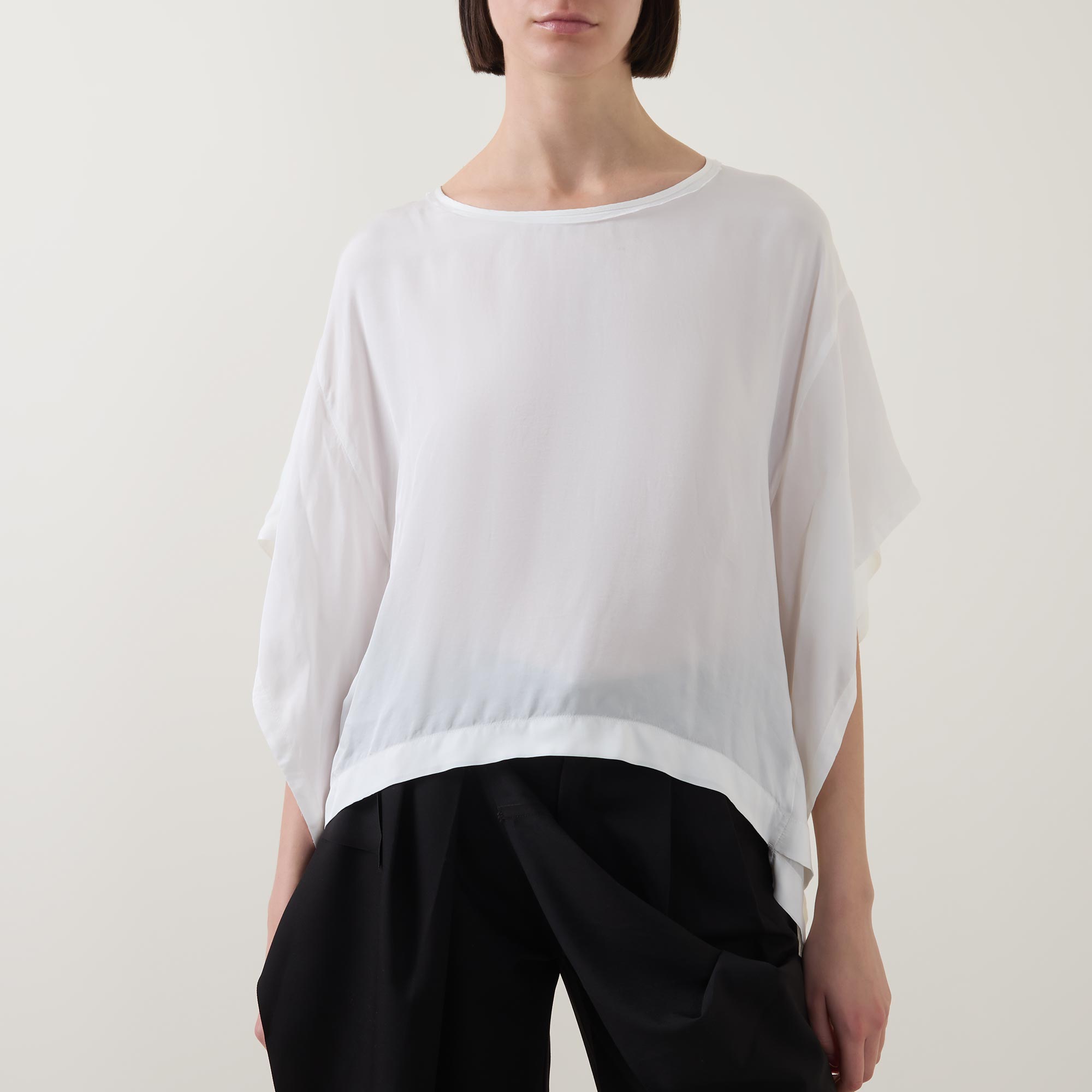 - Round neckline, kimono-style short sleeves, shaped hemline, dropped shoulders, raw-cut edges