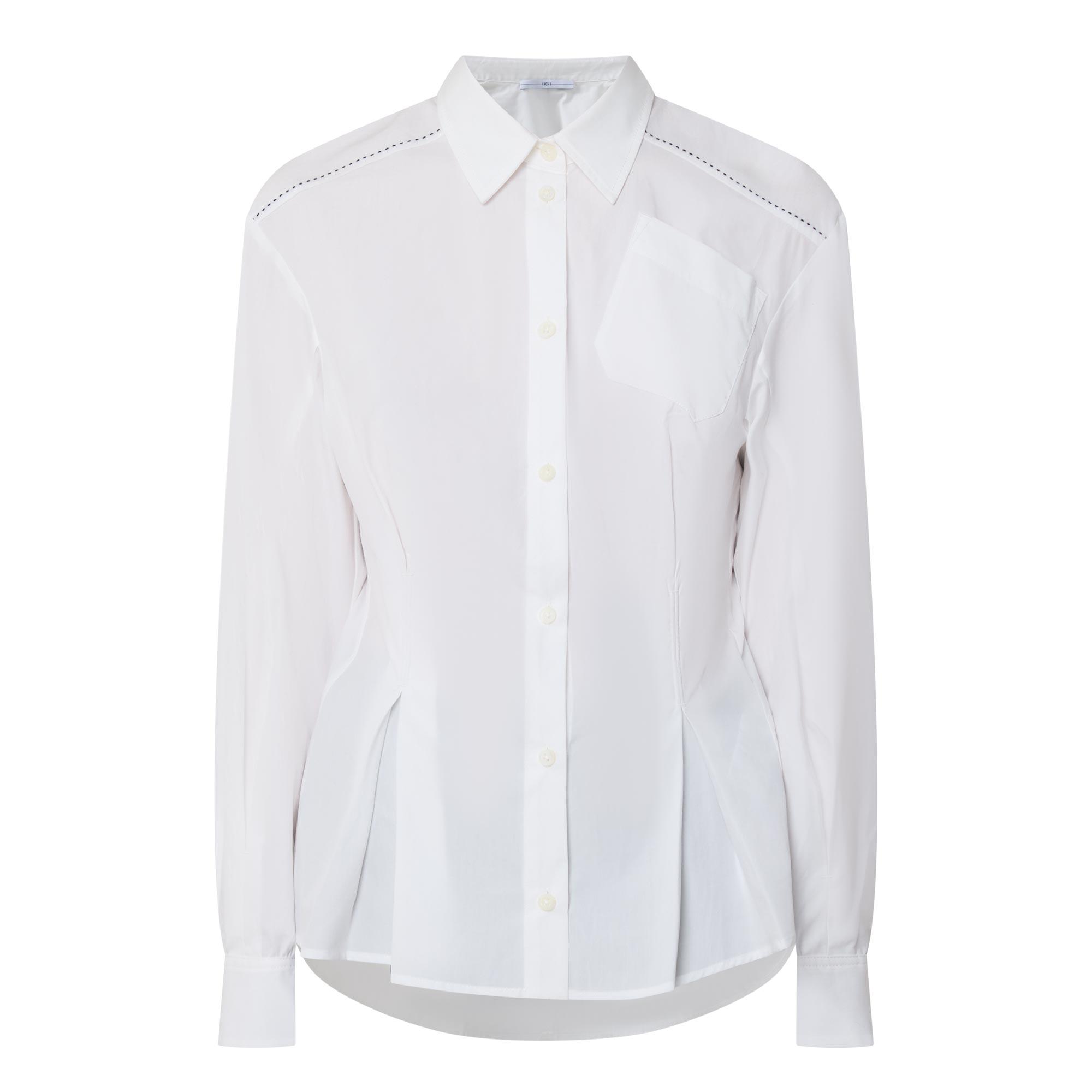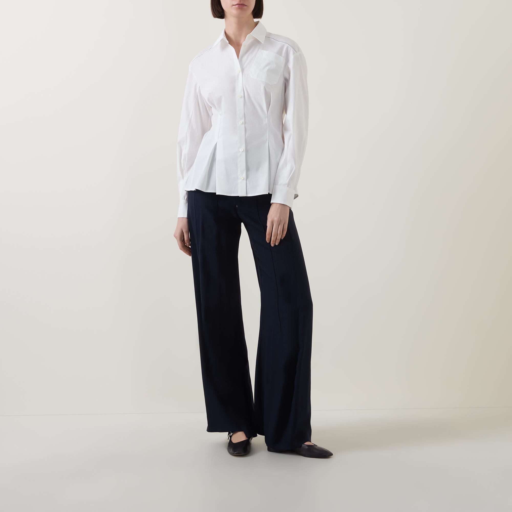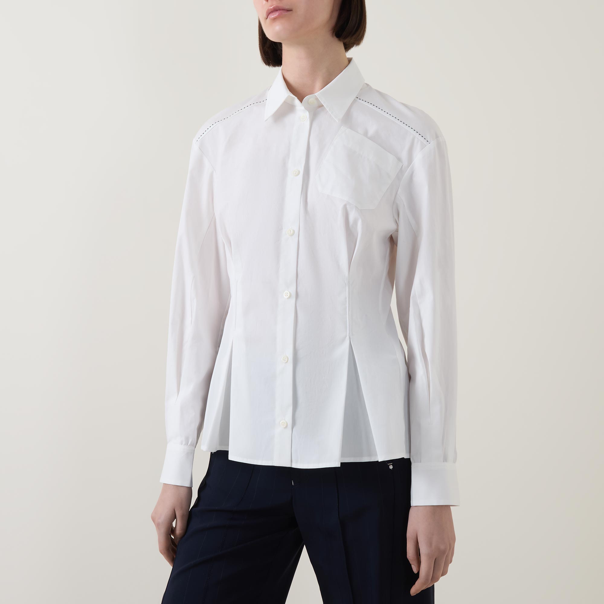 - Classic collar, button fastening, chest pocket, inverted pleats, peplum-style silhouette, long sleeves, buttoned cuffs, contrasting stitch at shoulders, lightweight poplin fabric