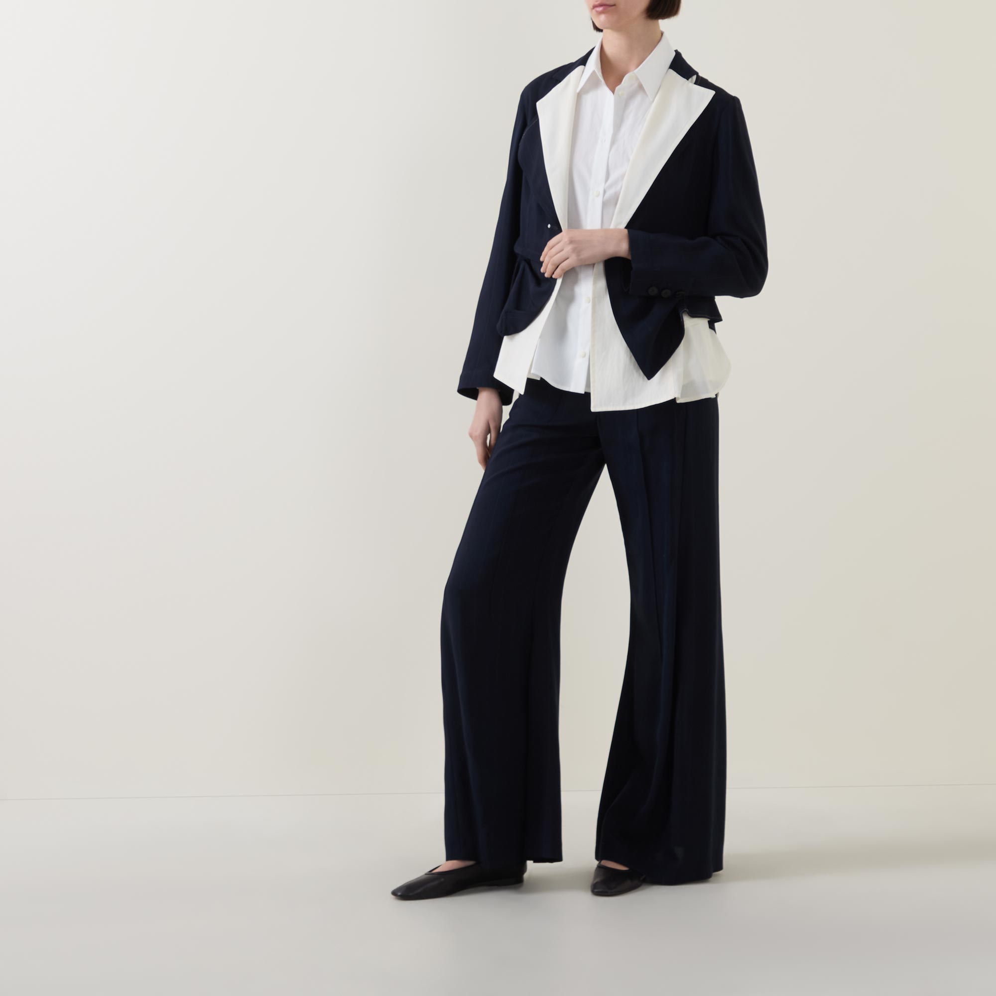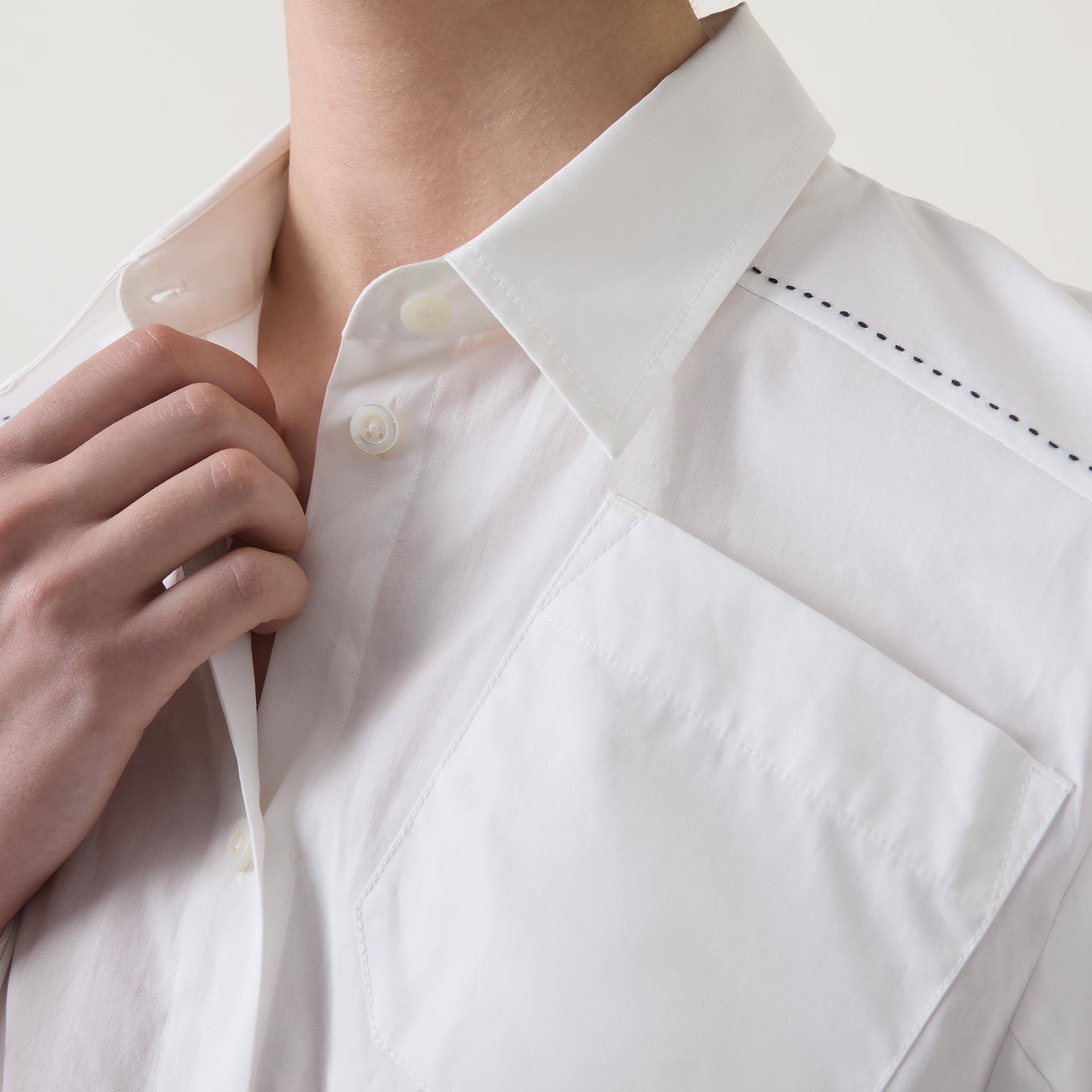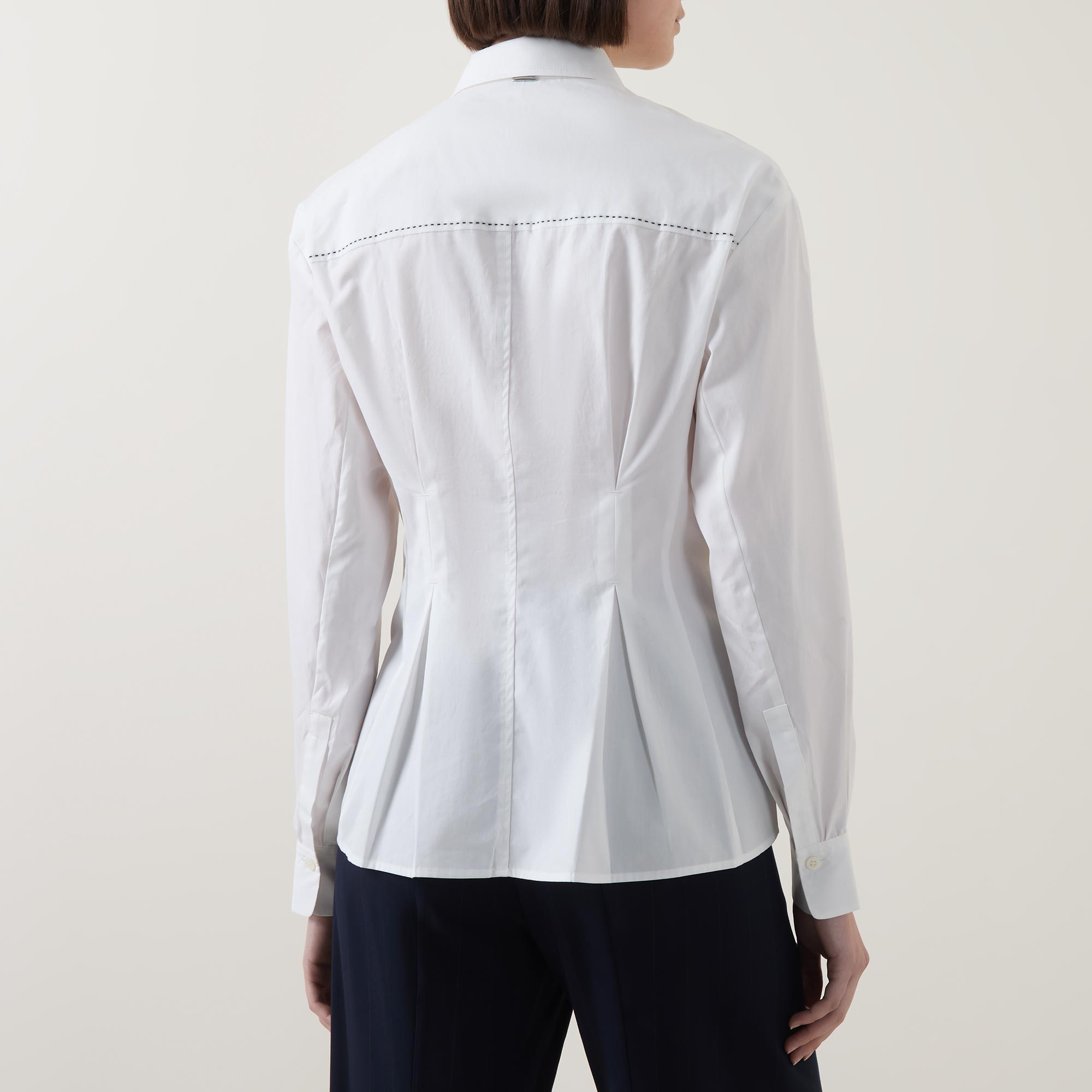 - Classic collar, button fastening, chest pocket, inverted pleats, peplum-style silhouette, long sleeves, buttoned cuffs, contrasting stitch at shoulders, lightweight poplin fabric