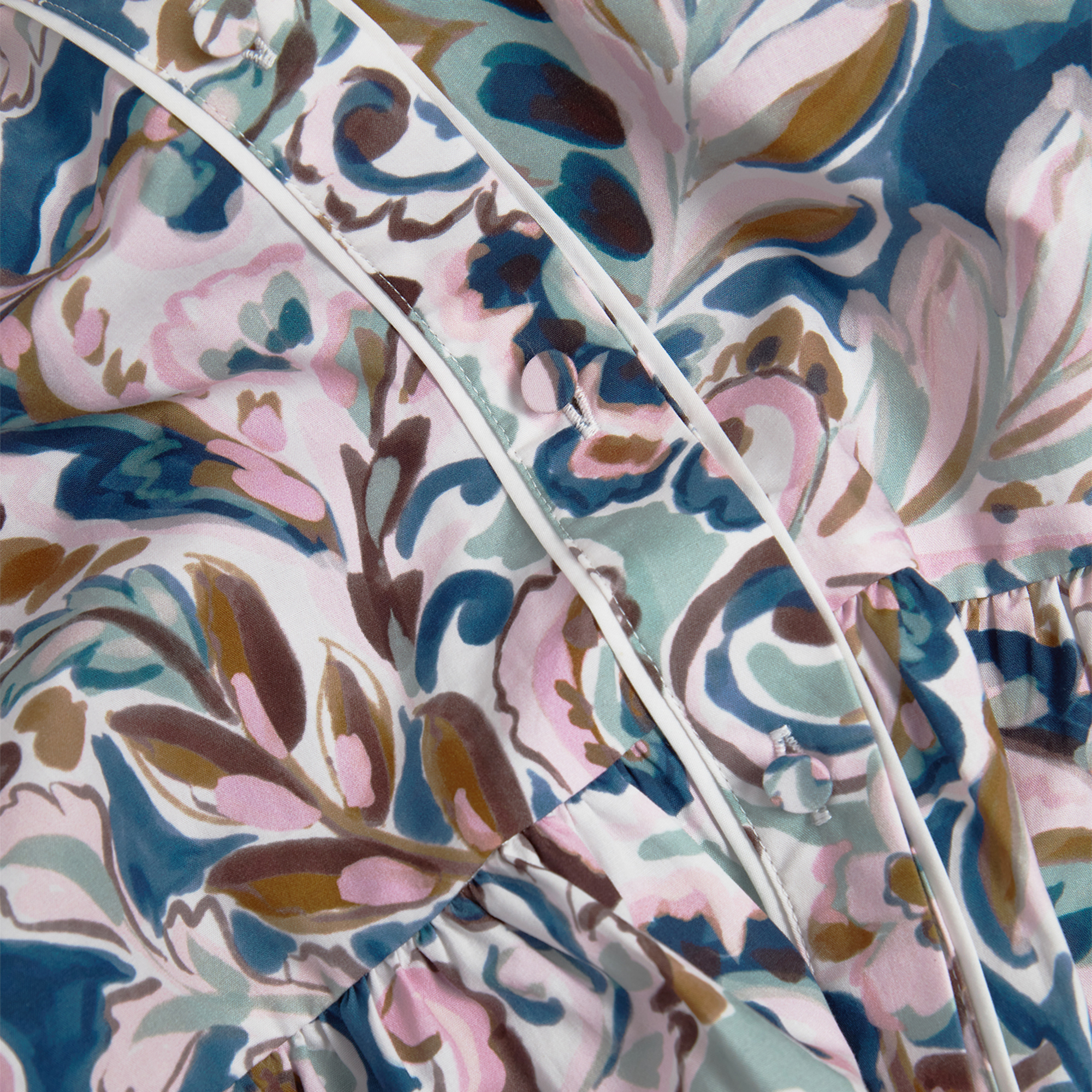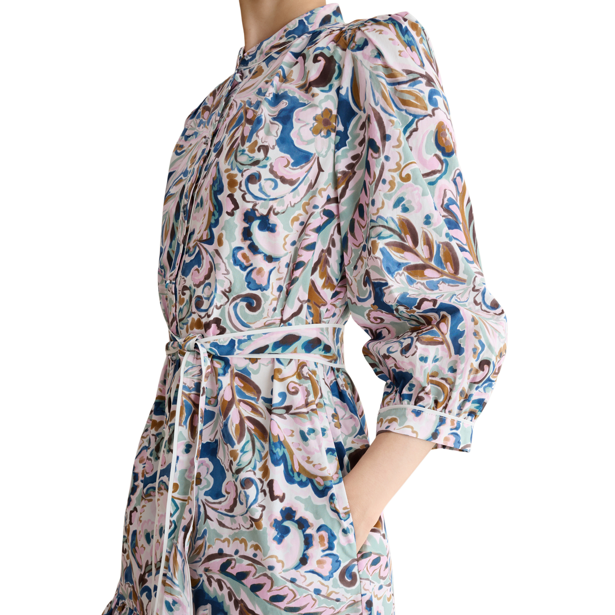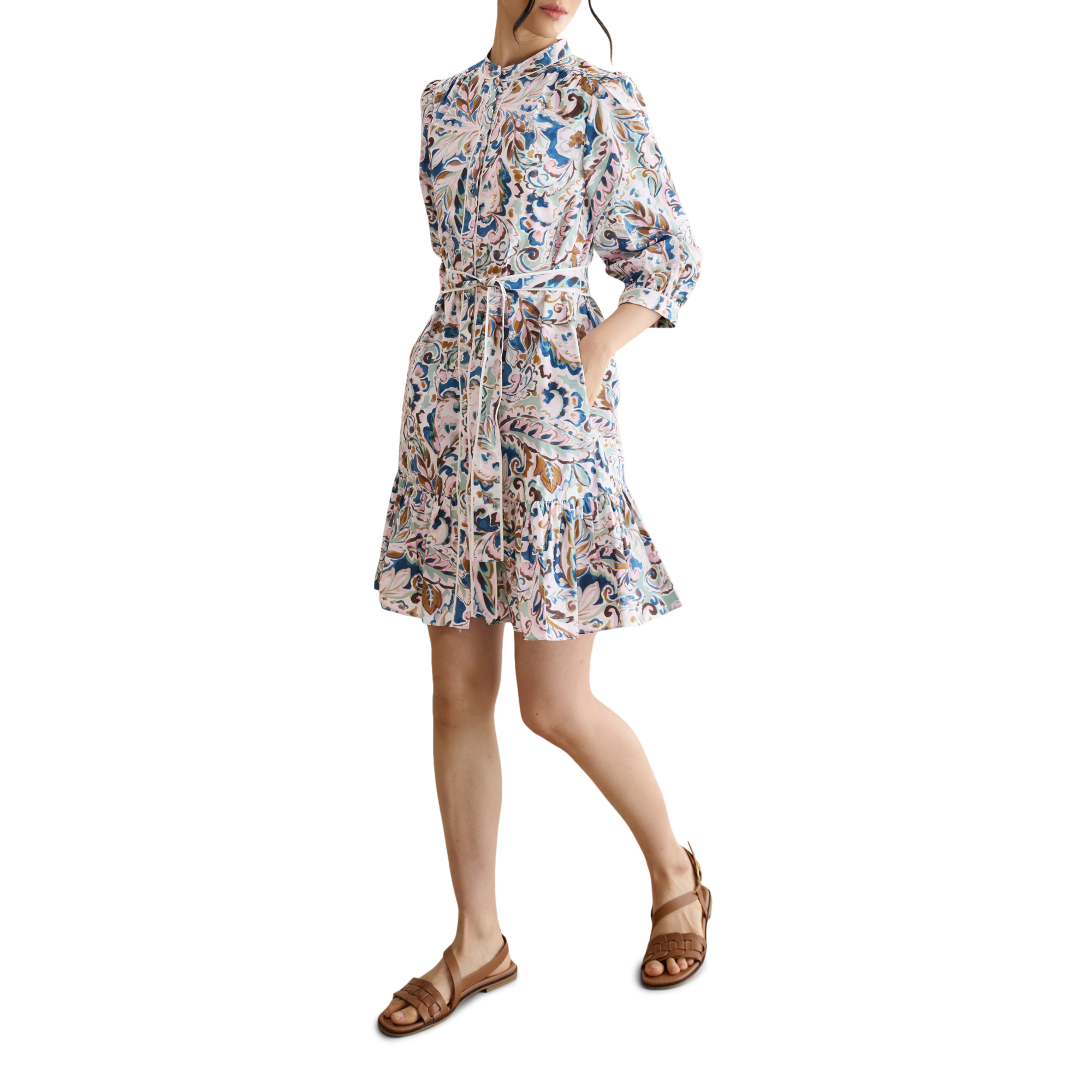 - Crew neckline, knee length, fit and flare silhouette, three-quarter-length sleeves, front fastening, floral print, tie waist, side entry pockets