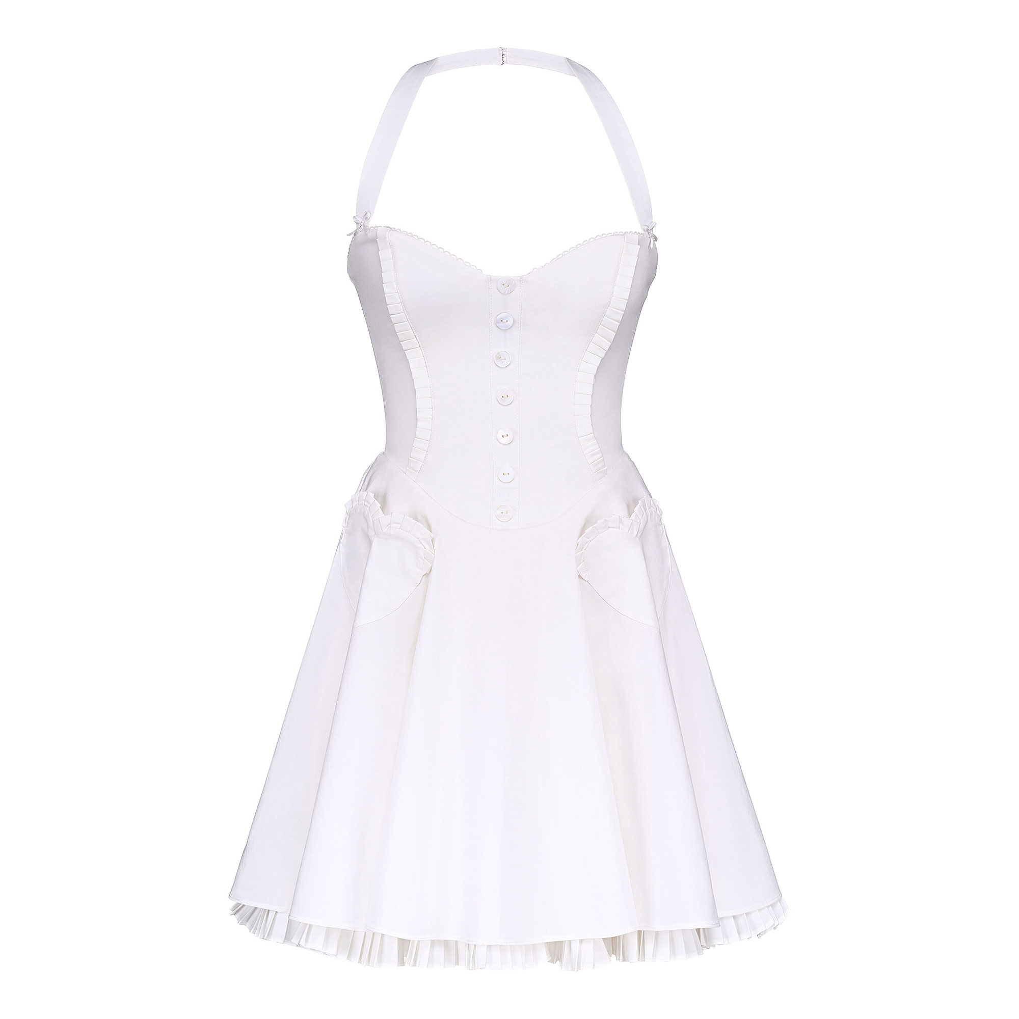 - Halter neckline, scallop trim, bows details, straps, tulle skirt layer, heart-shaped pockets