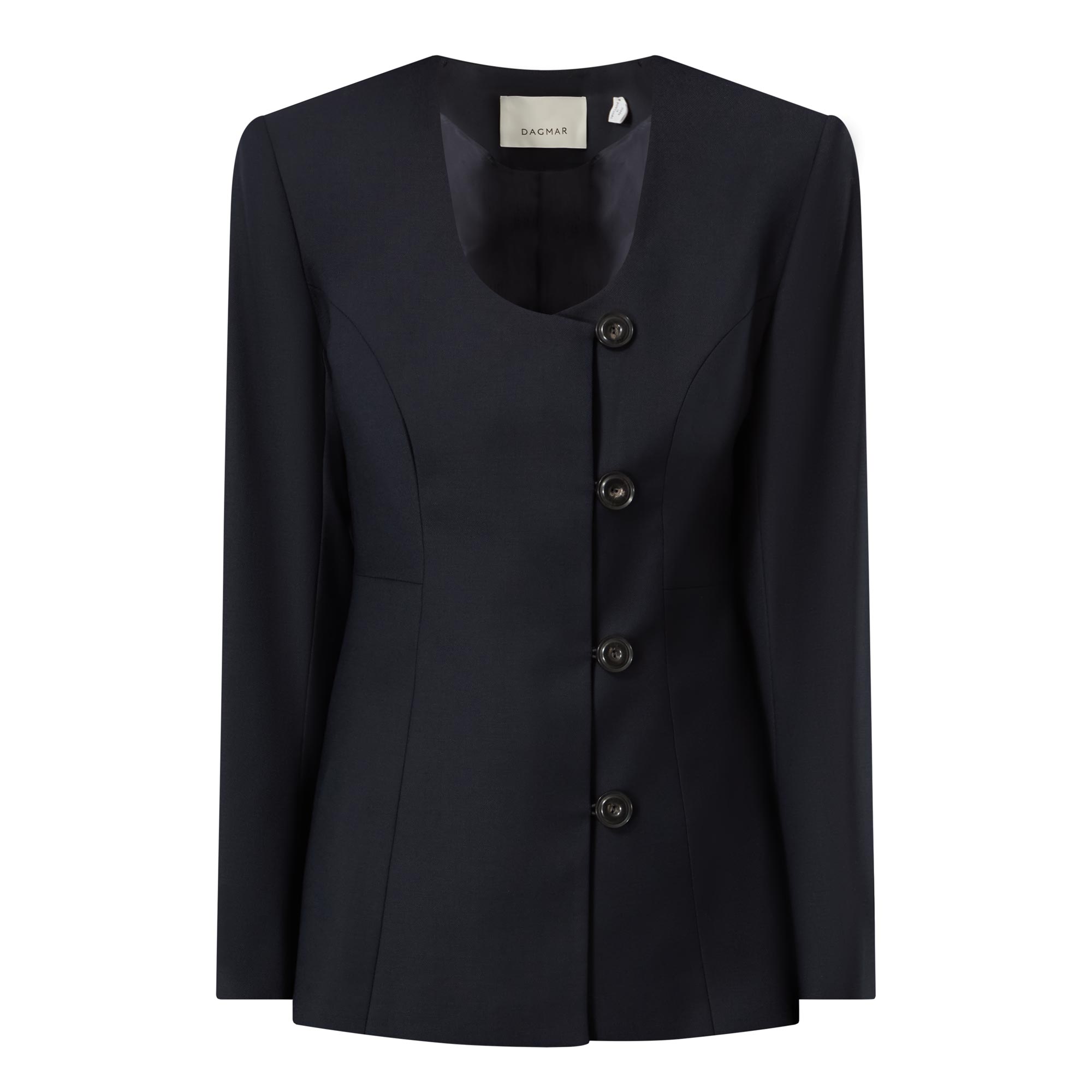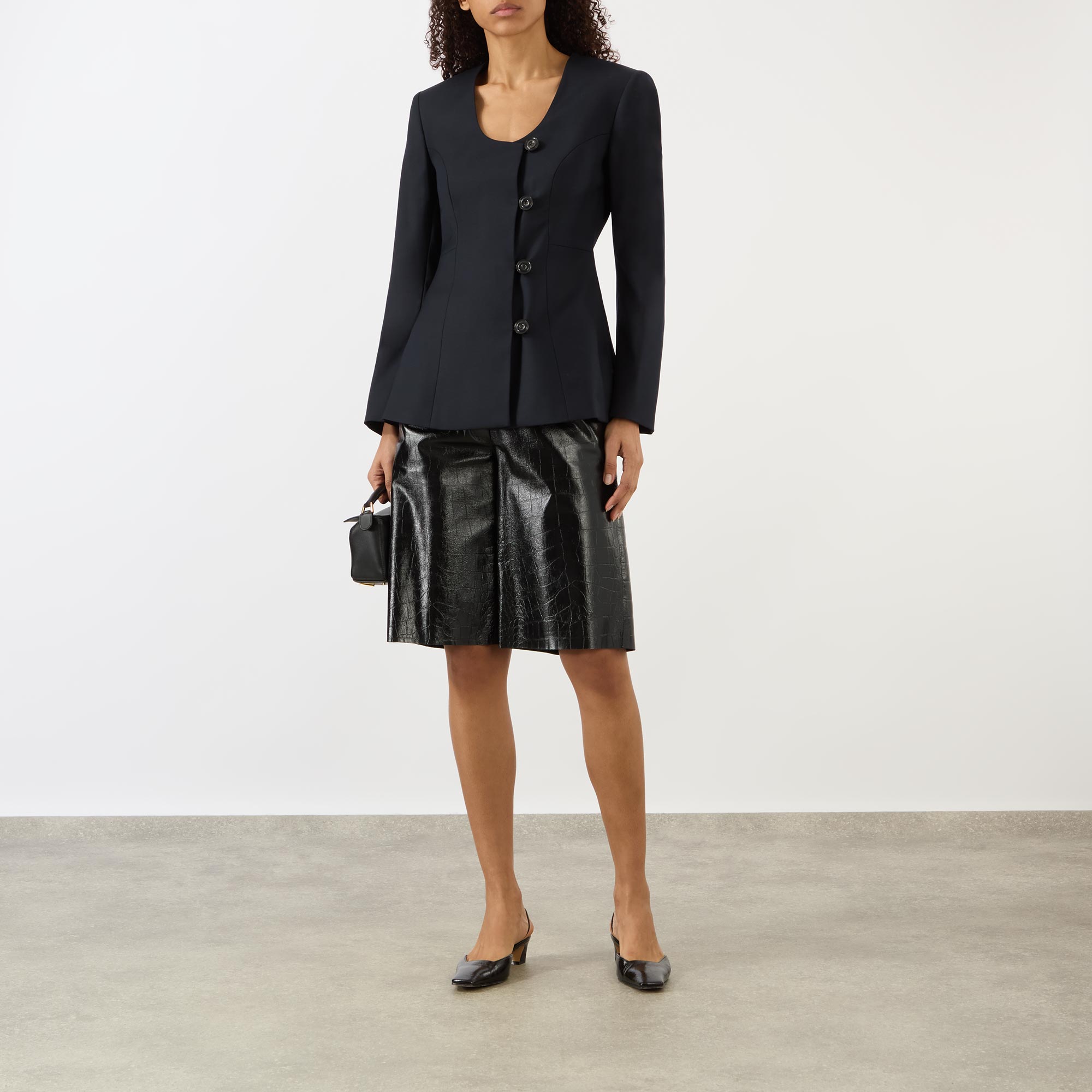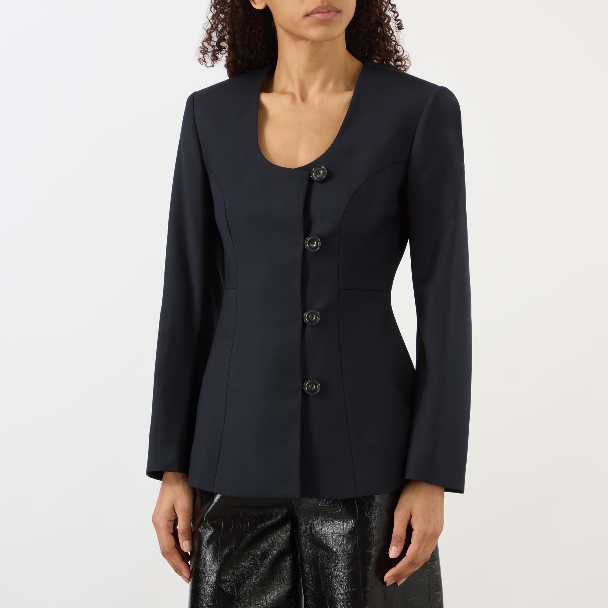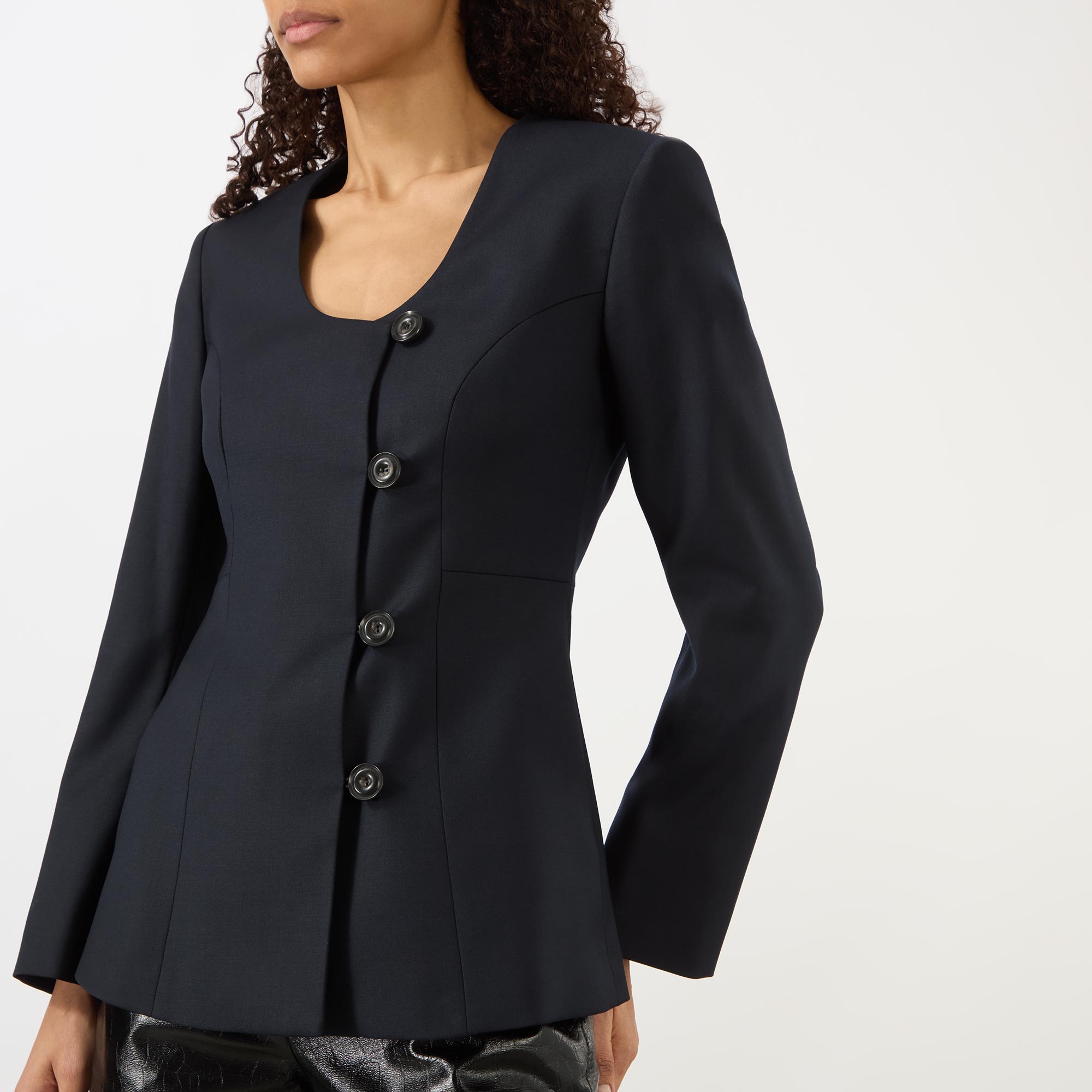 - Tailored structured shoulders, long sleeves, single-breasted, collarless, button fastenings, round neck
