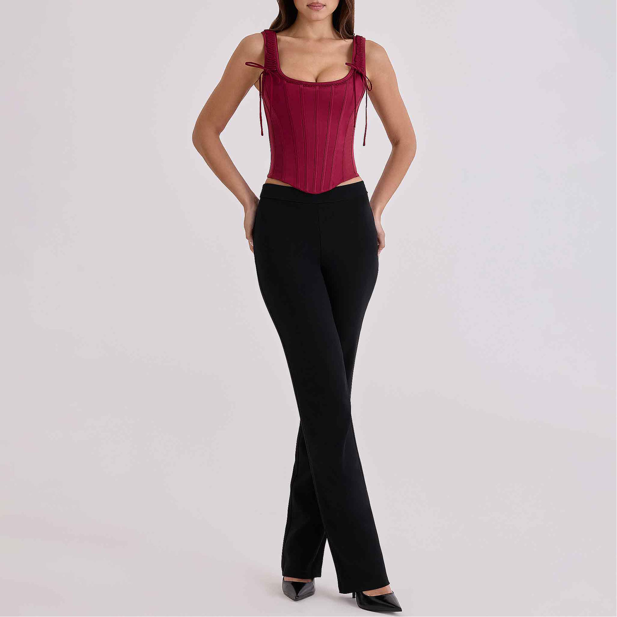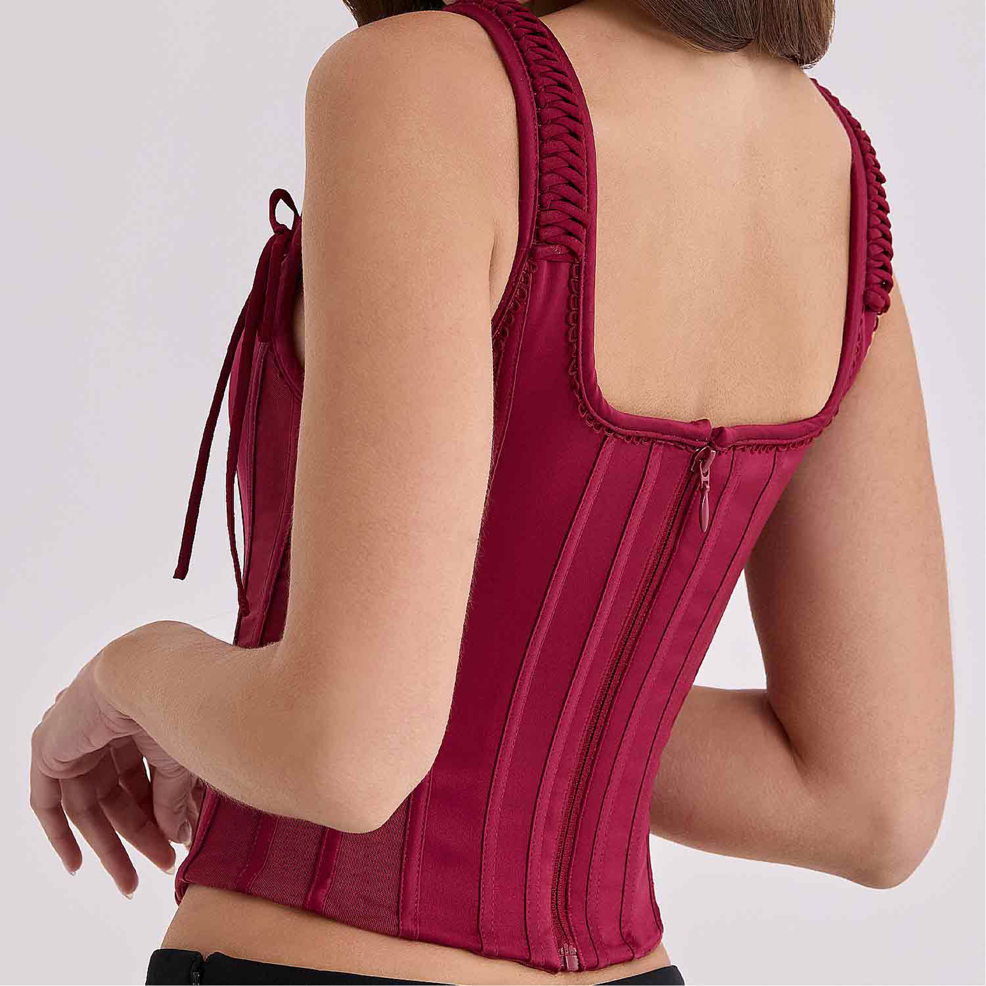 • Glossy satin fabric, square neck, dropped waist shaping, easy zip closure at the back, strategic boning