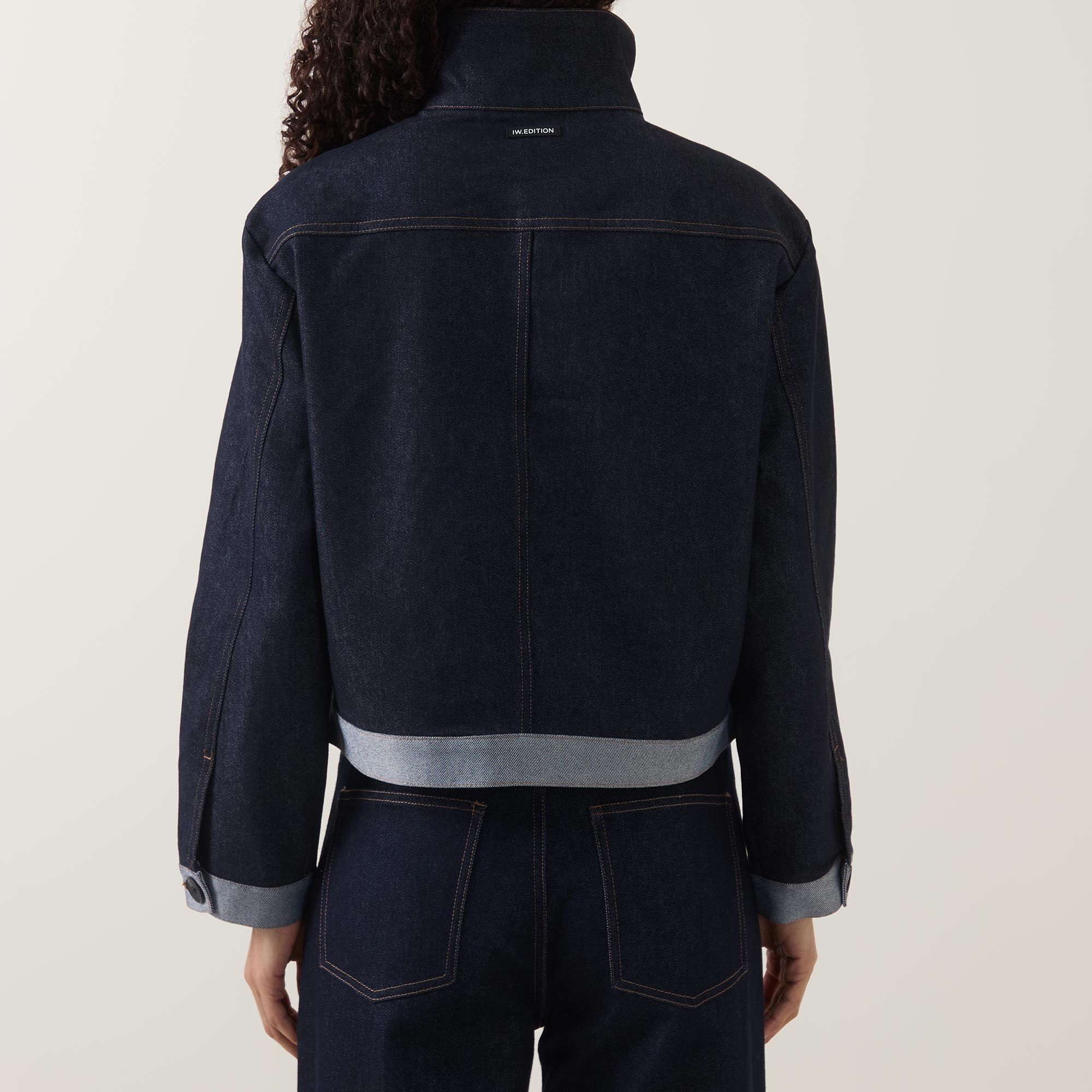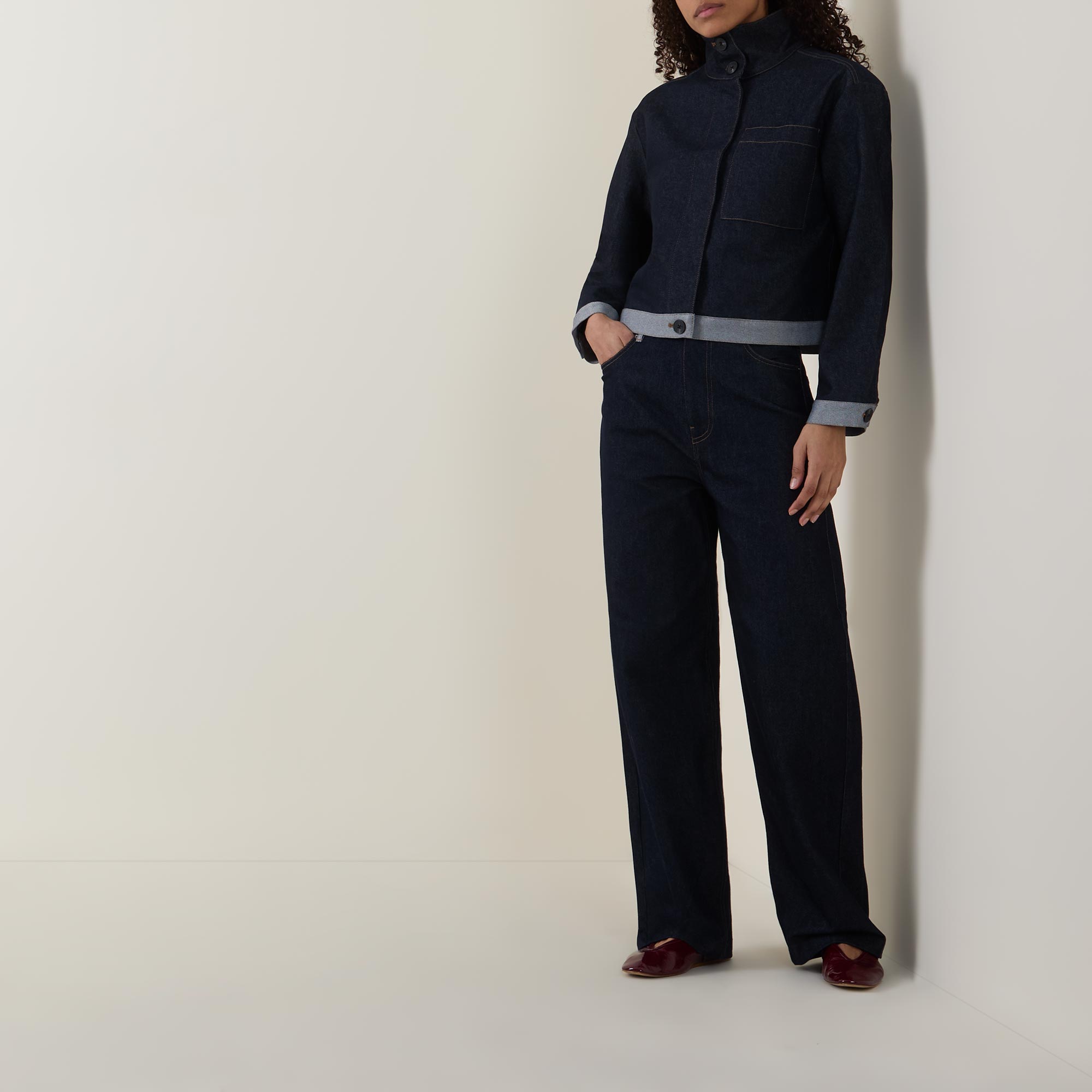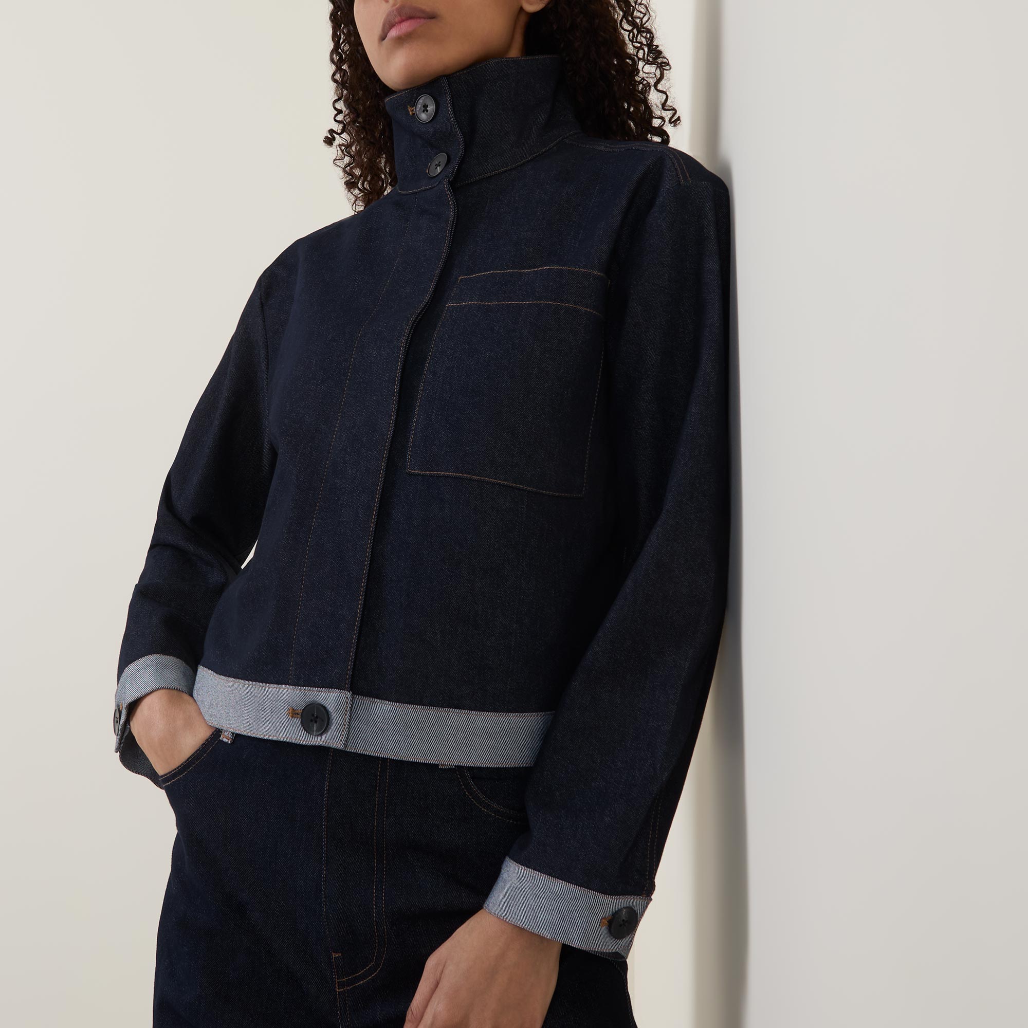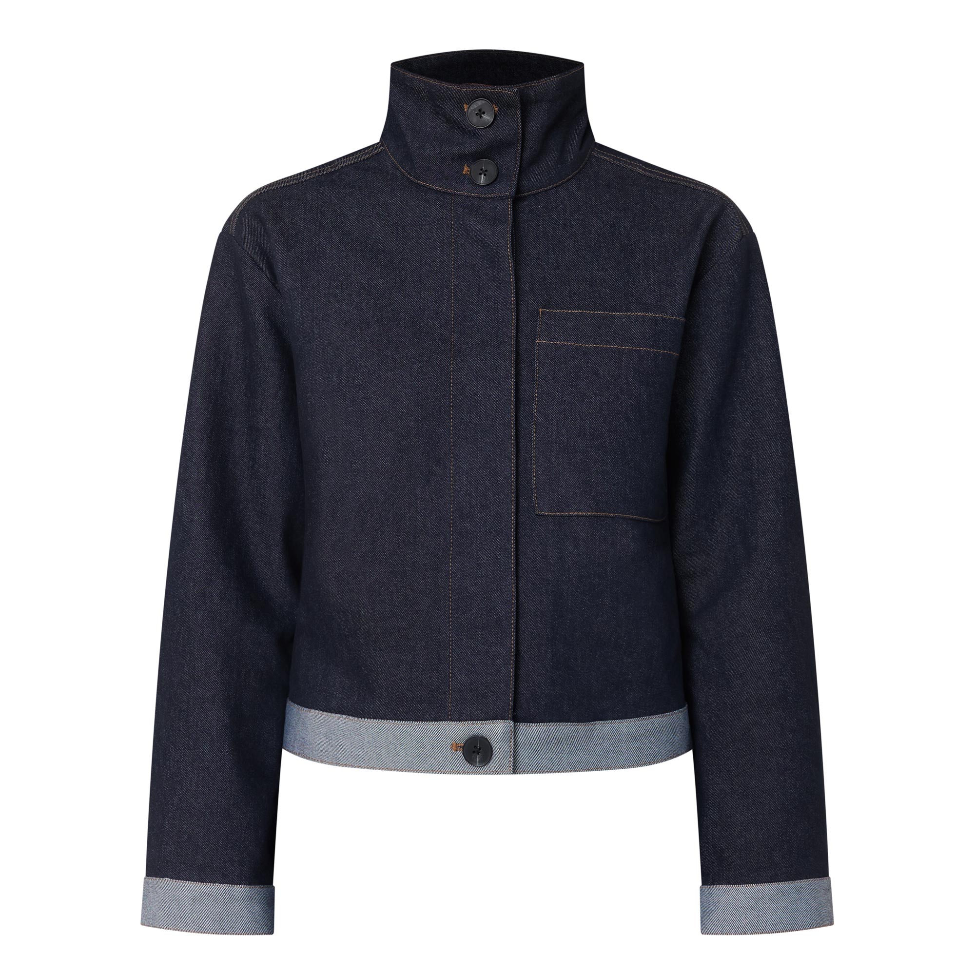 - Stand collar, long sleeves, buttoned cuffs, concealed front fastening, one chest patch pocket, straight hem, cropped length, contrasting trims, tobacco stitching, dark wash finish