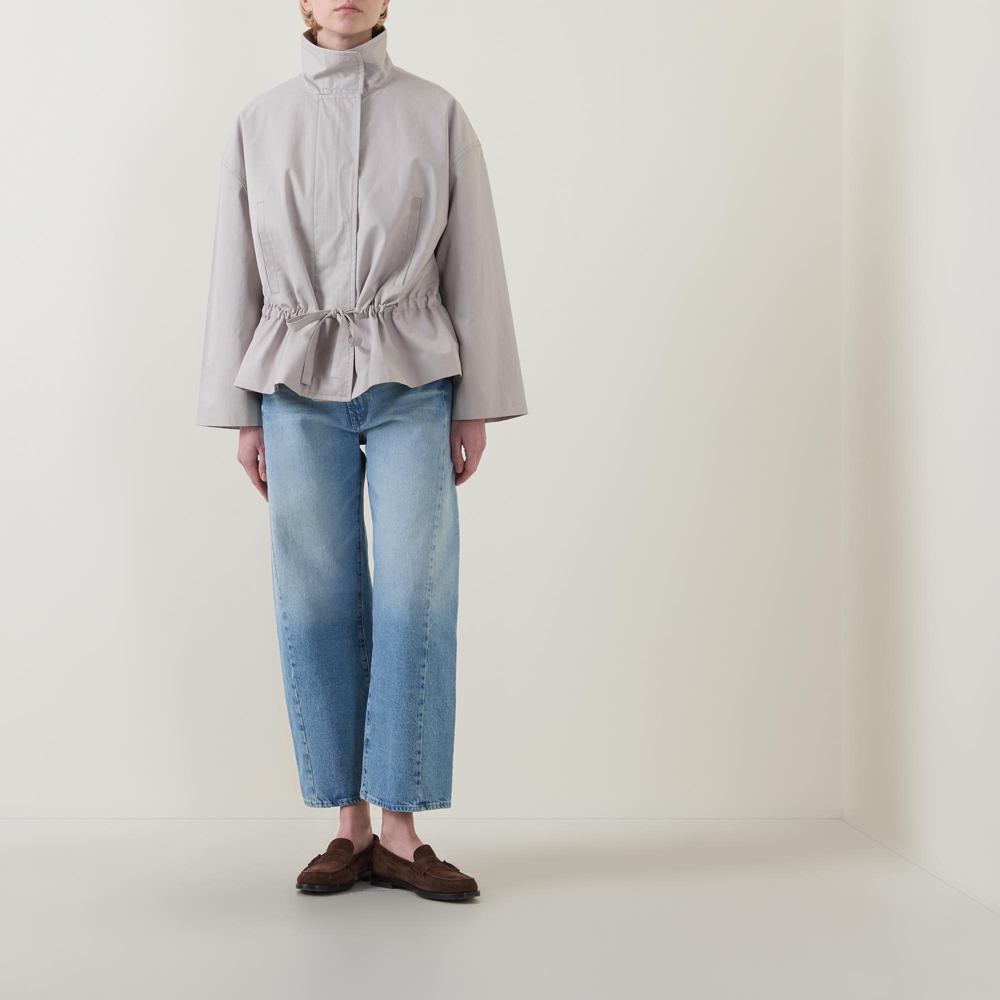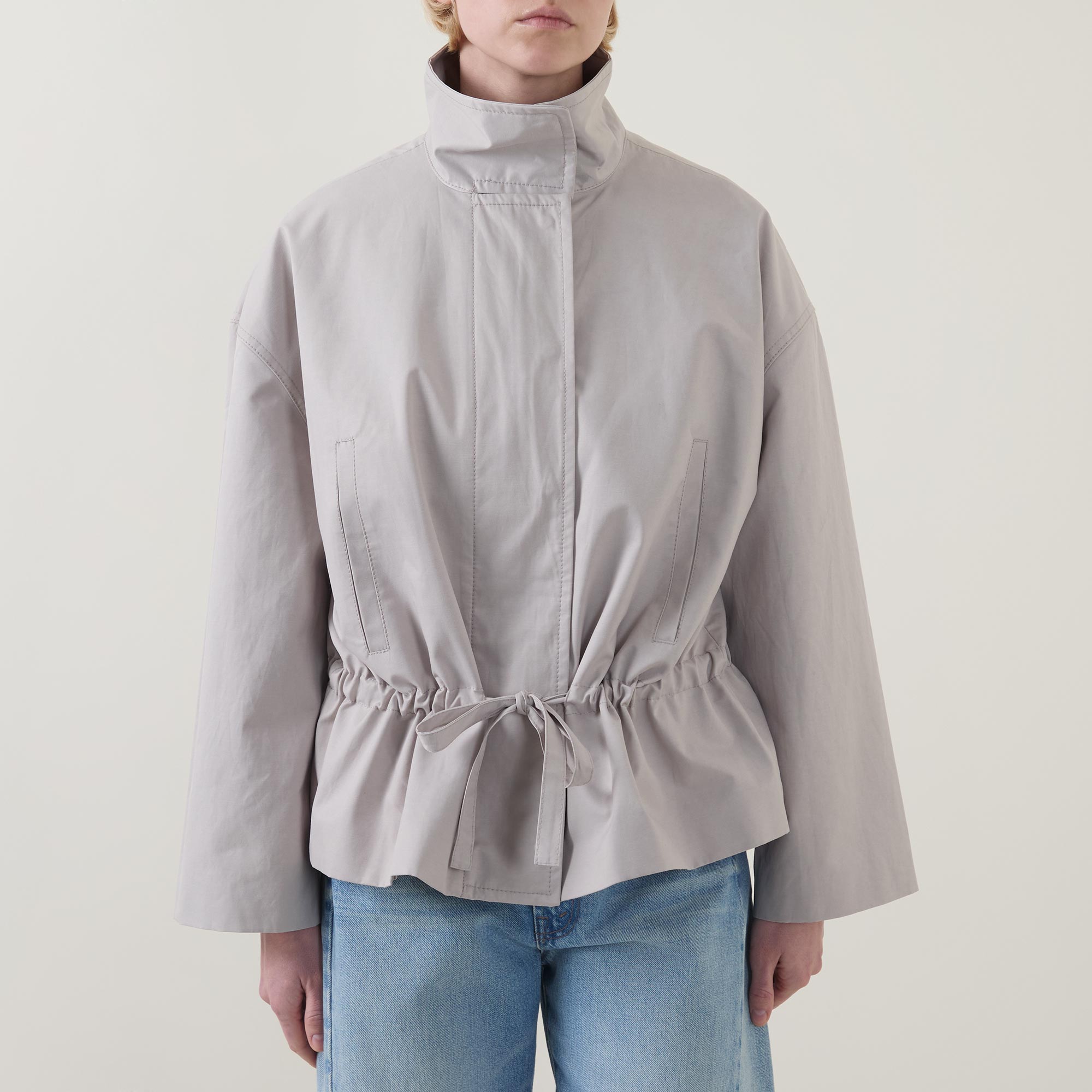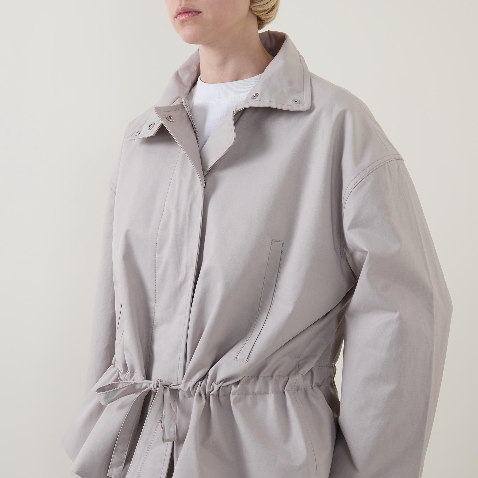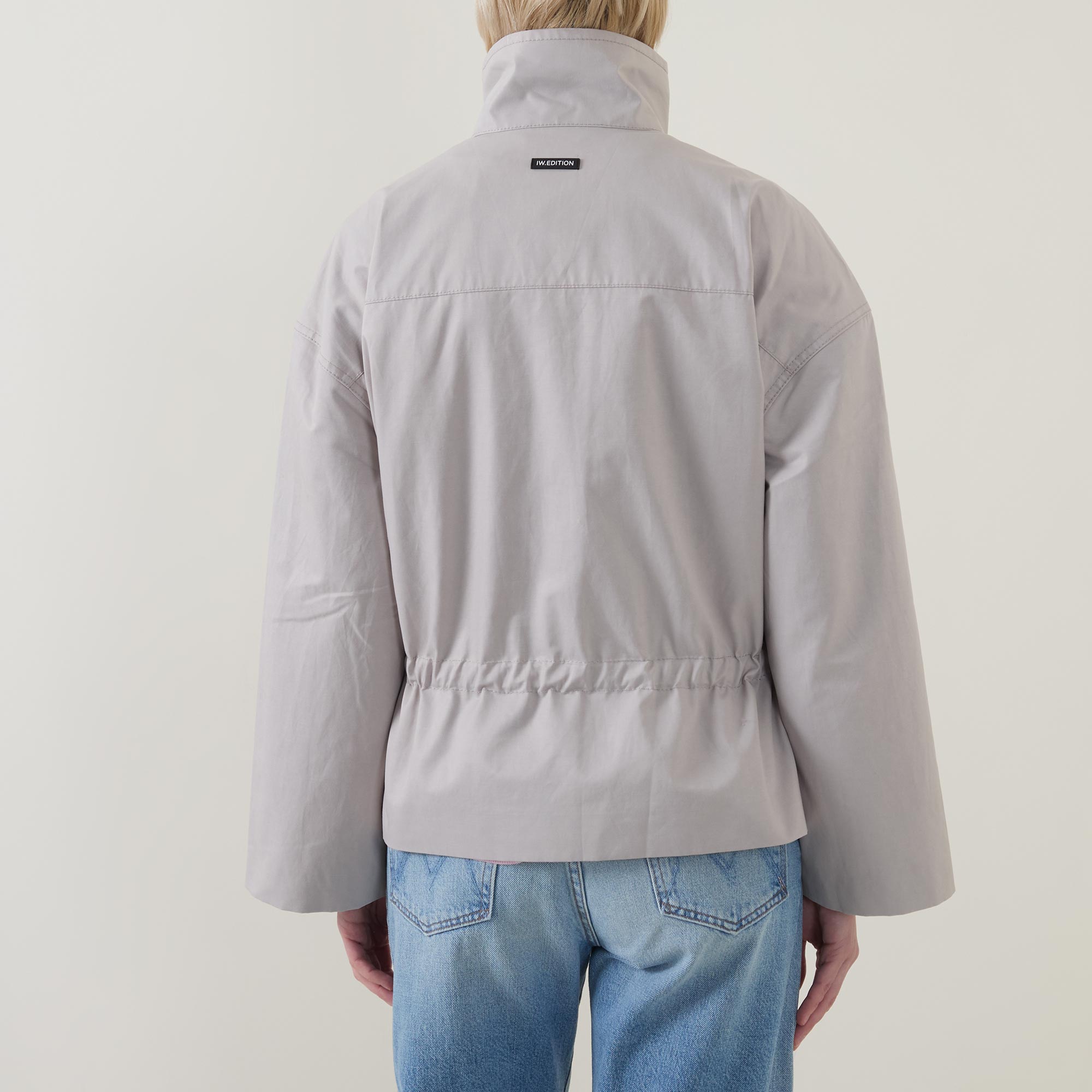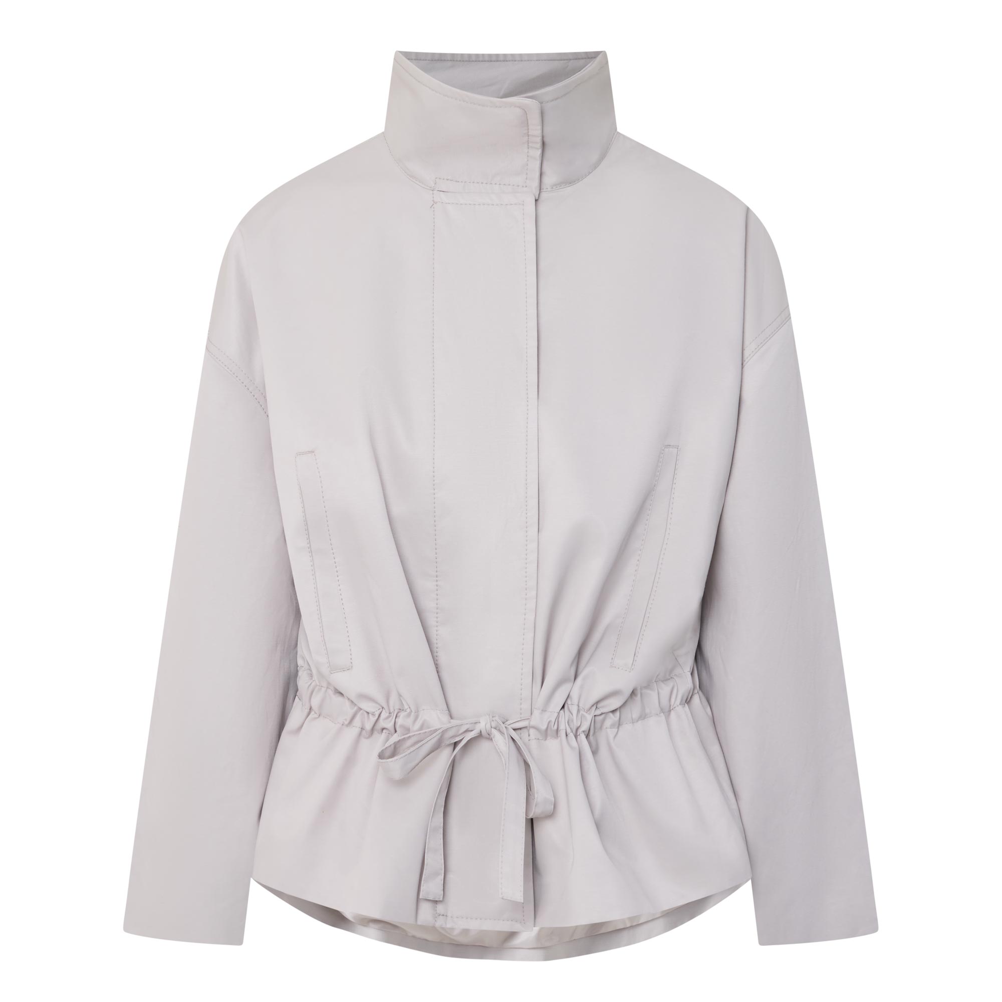 - Stand collar, dropped shoulders, long sleeves, front zip fastening, additional snap button placket, two hand warmer pockets, adjustable waist with drawstring fastening, peplum hem, rear logo detail