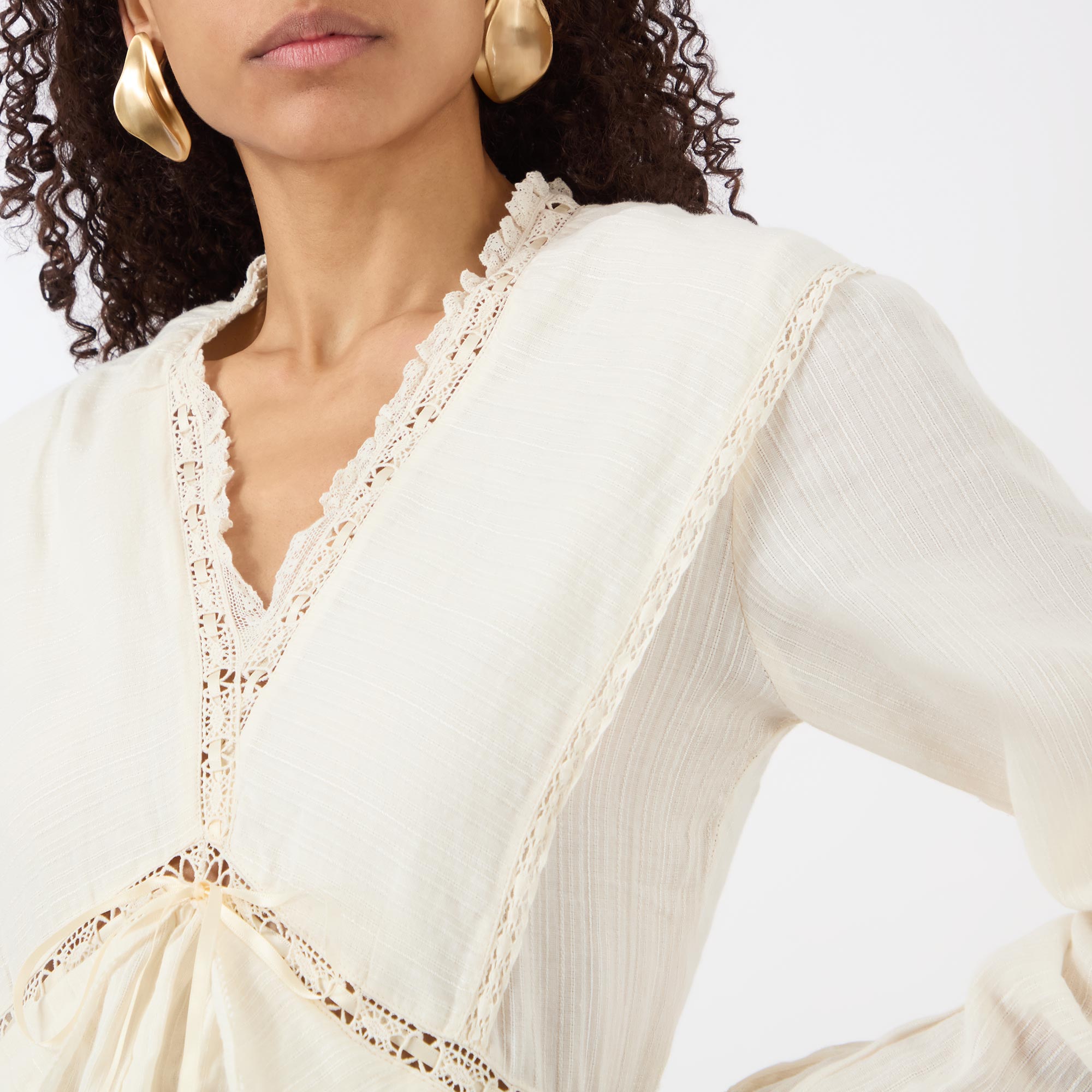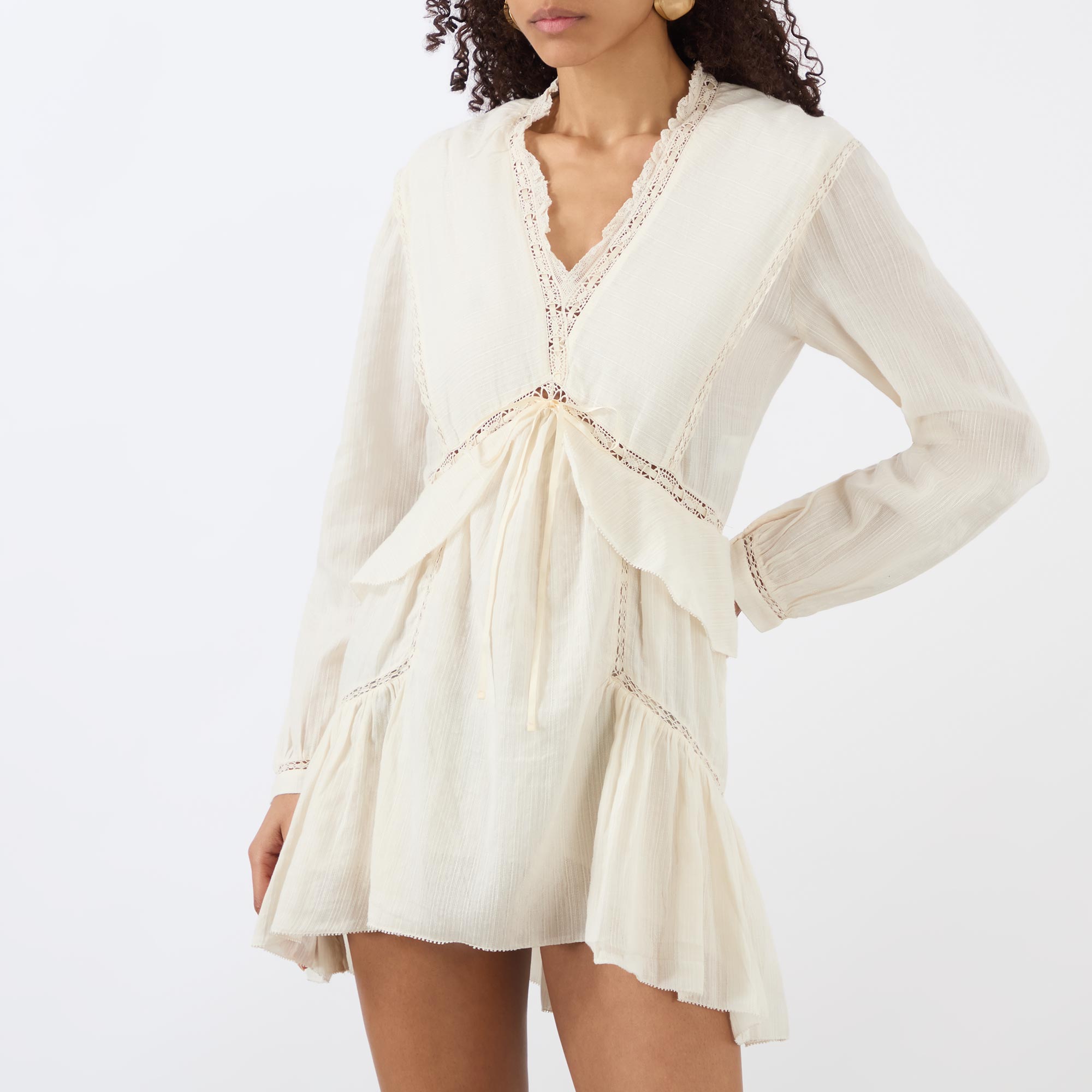 - V-neckline, long sleeves, buttoned cuffs, front tie detail, embroidered trims, tiered skirt, high-low hemline, mini length