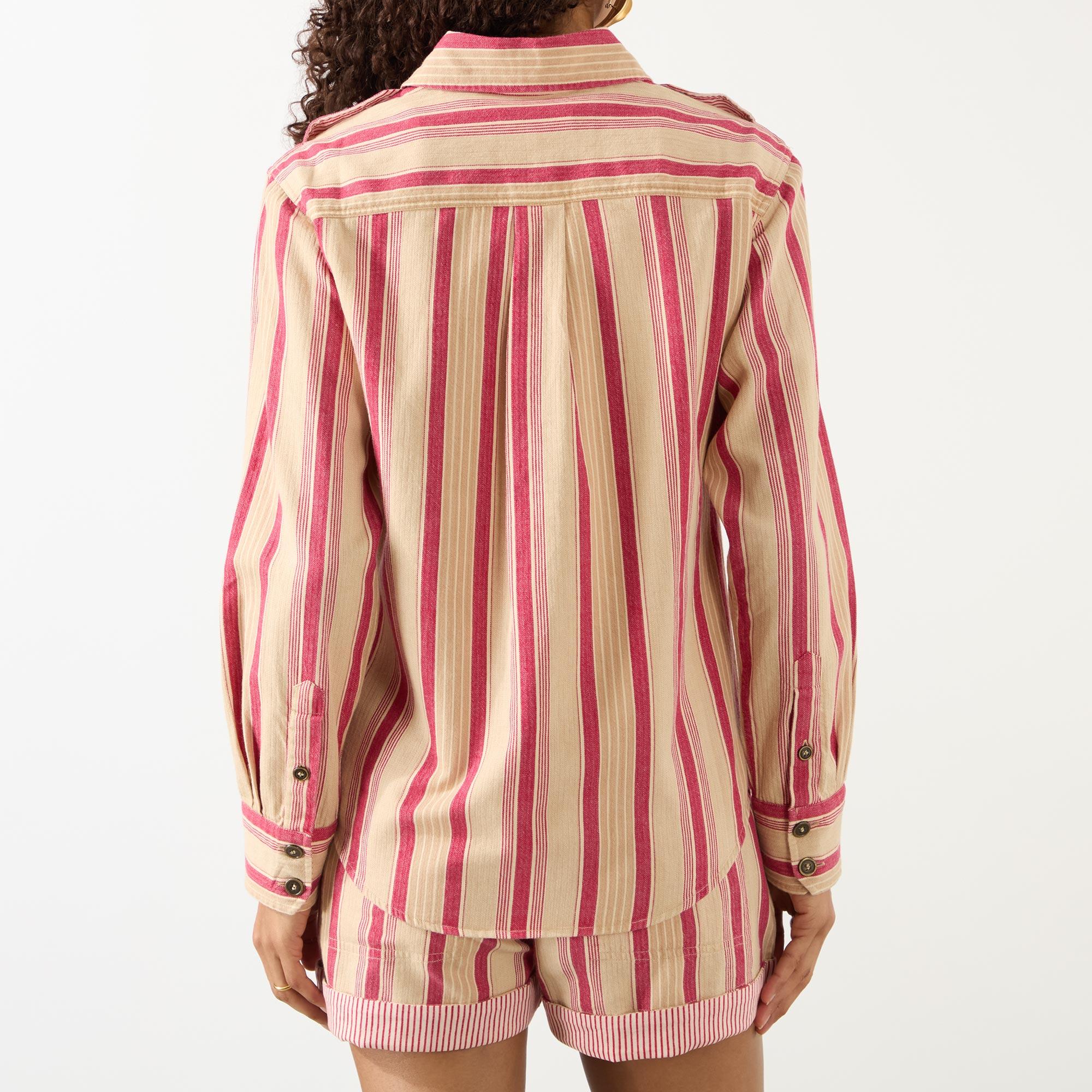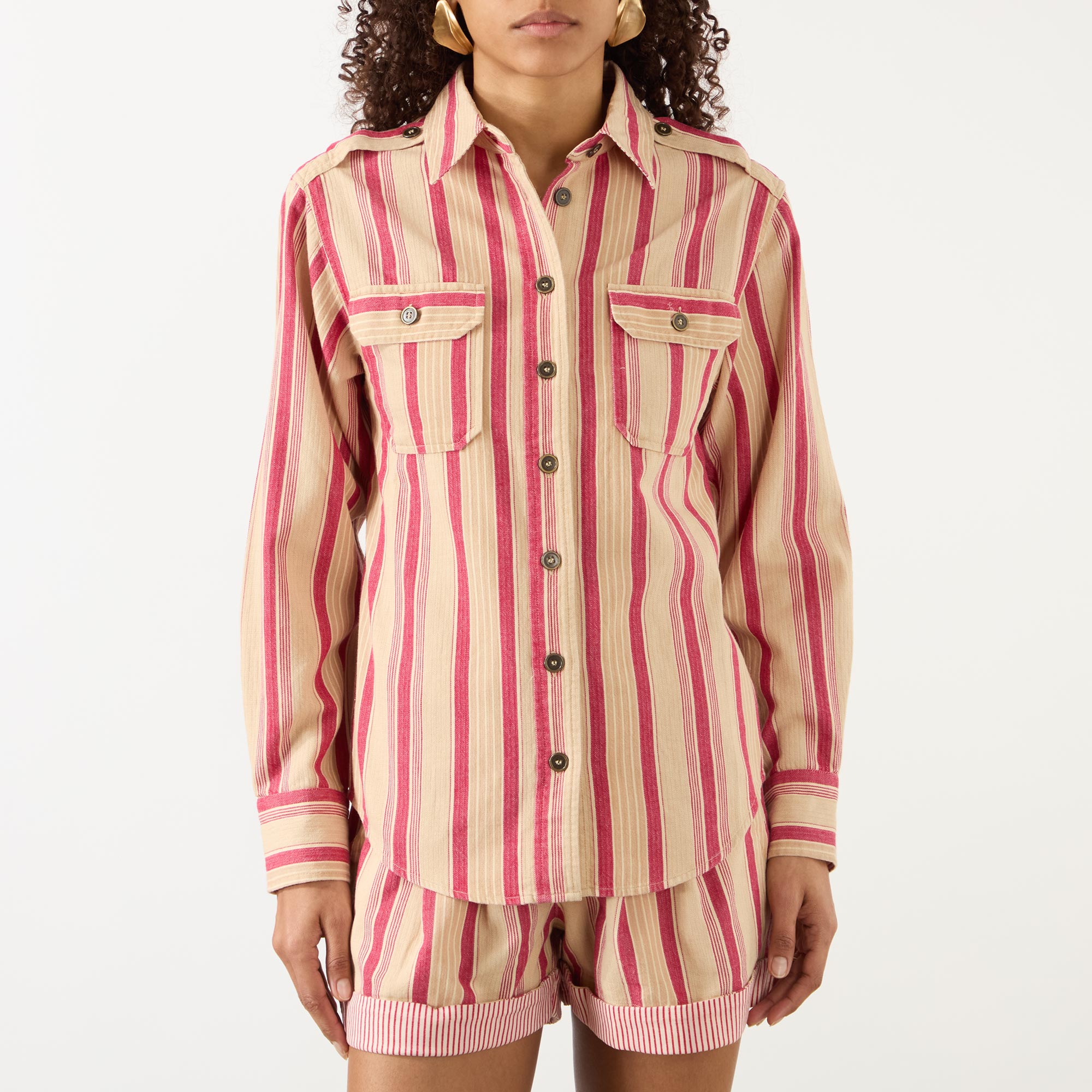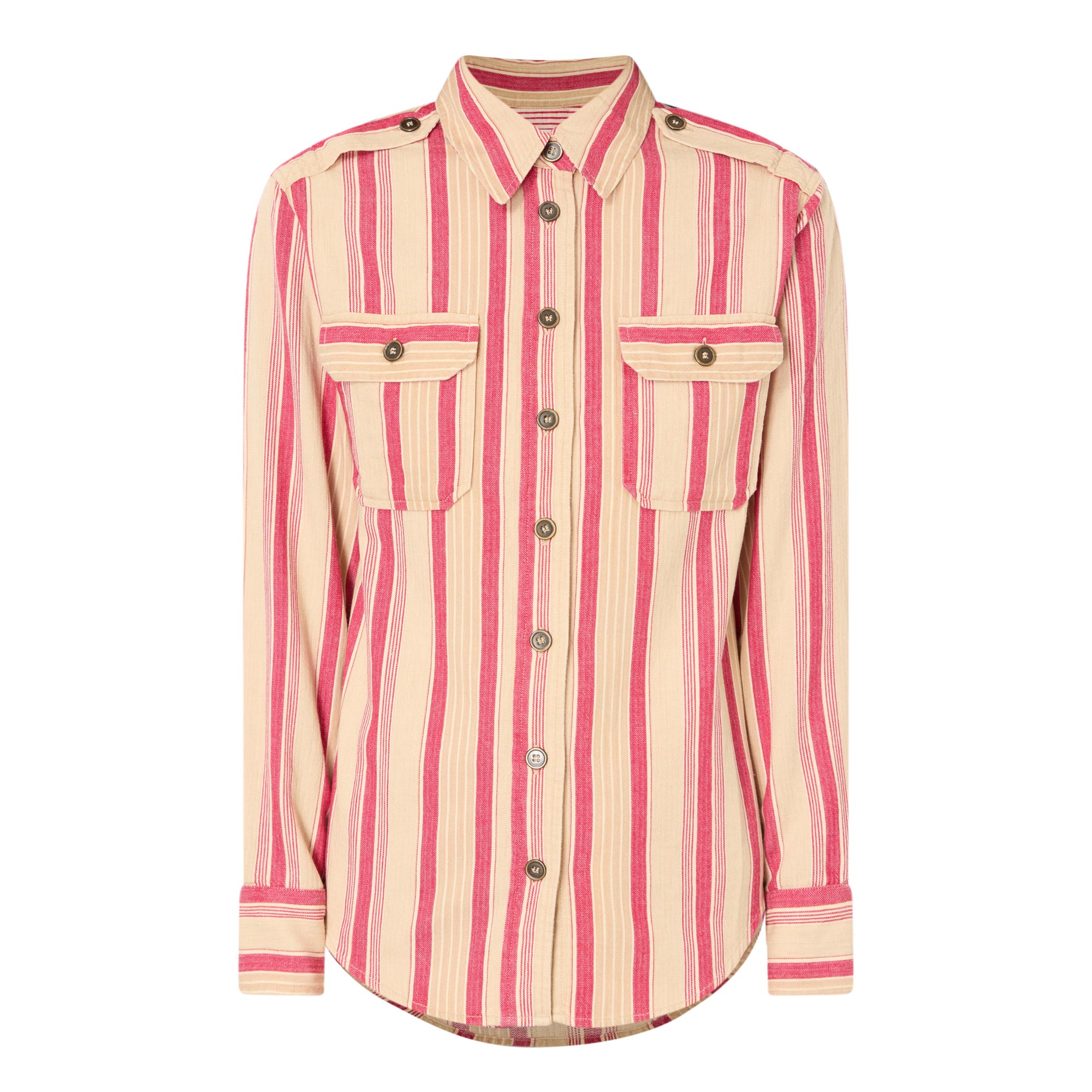 - All-over striped print, long sleeves, pointed collar, two chest pockets, buttoned cuffs, button fastenings